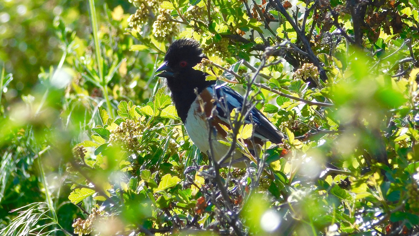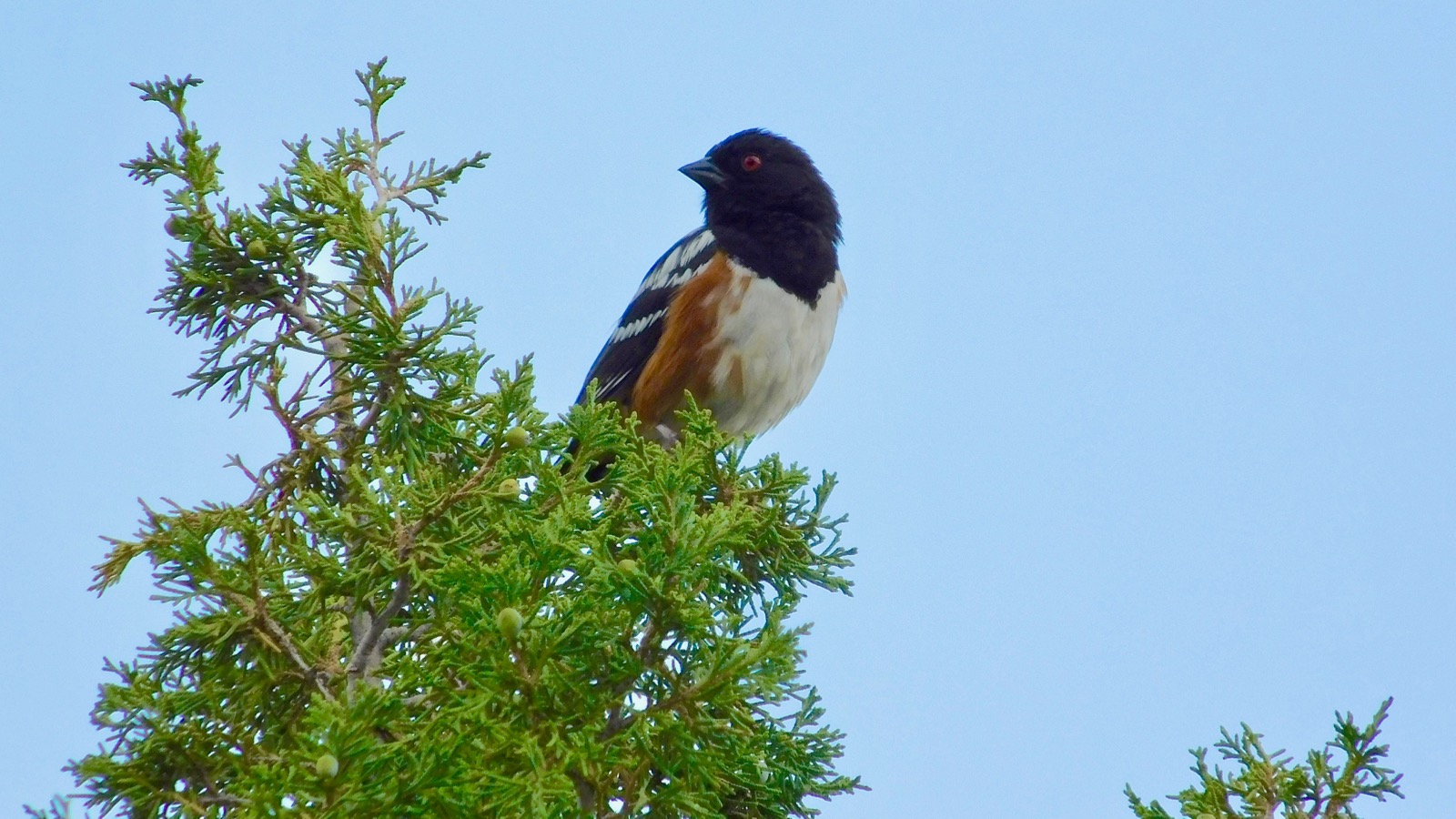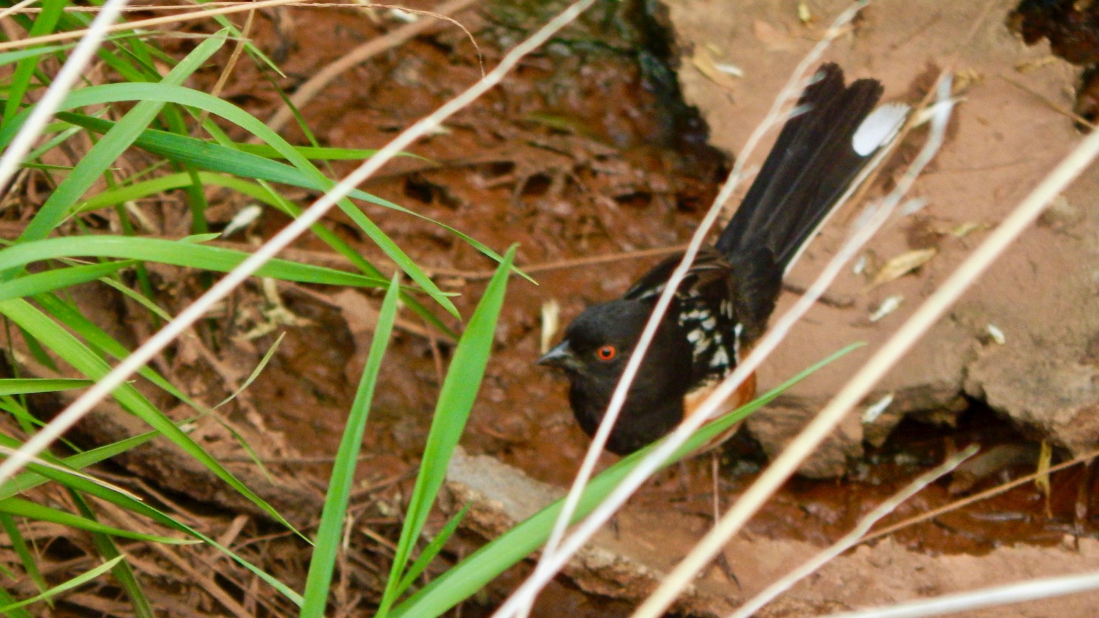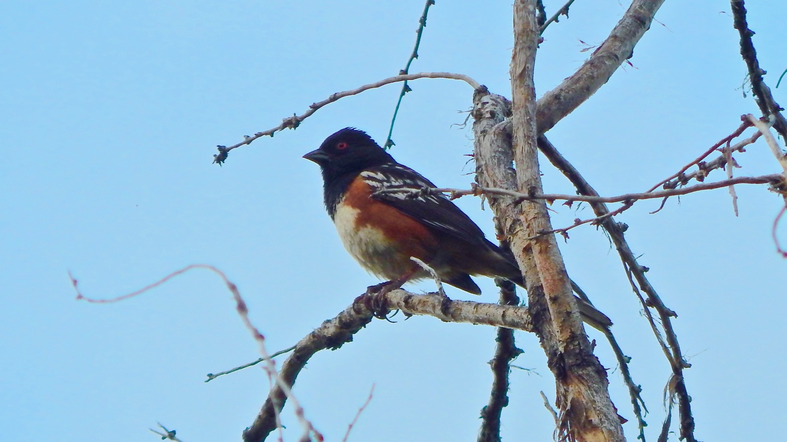 Rustling through the leaf litter below the dry scrub brush that laces the steep, Colorado foothills is where you’ll find a hefty sparrow known as the spotted towhee. Such beautiful birds, the males have a white belly, orange sides and a black head, throat and upper parts. The back and wings are flecked with white spots while the red eyes are the defining characteristic.