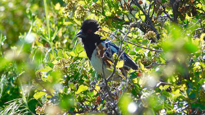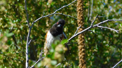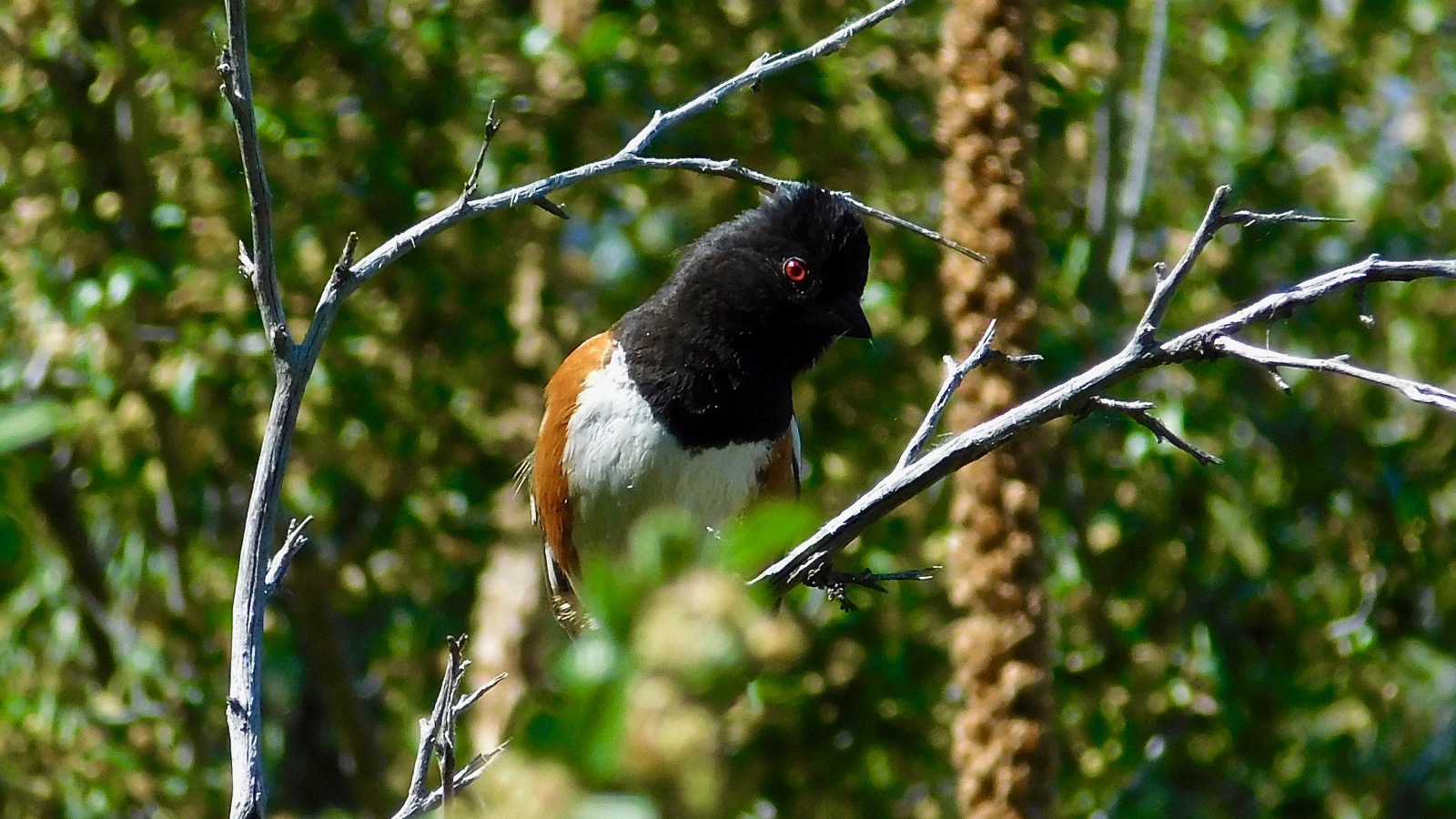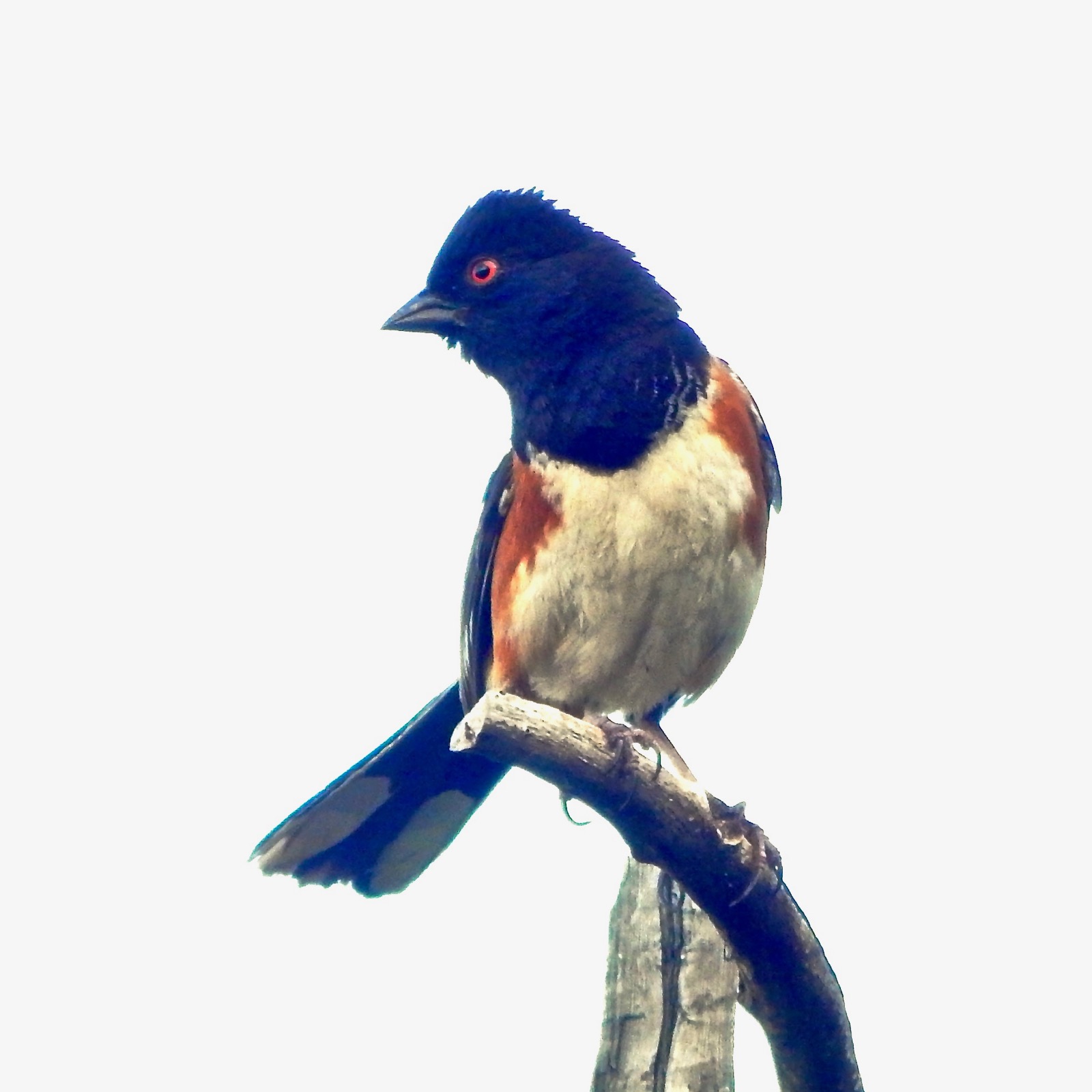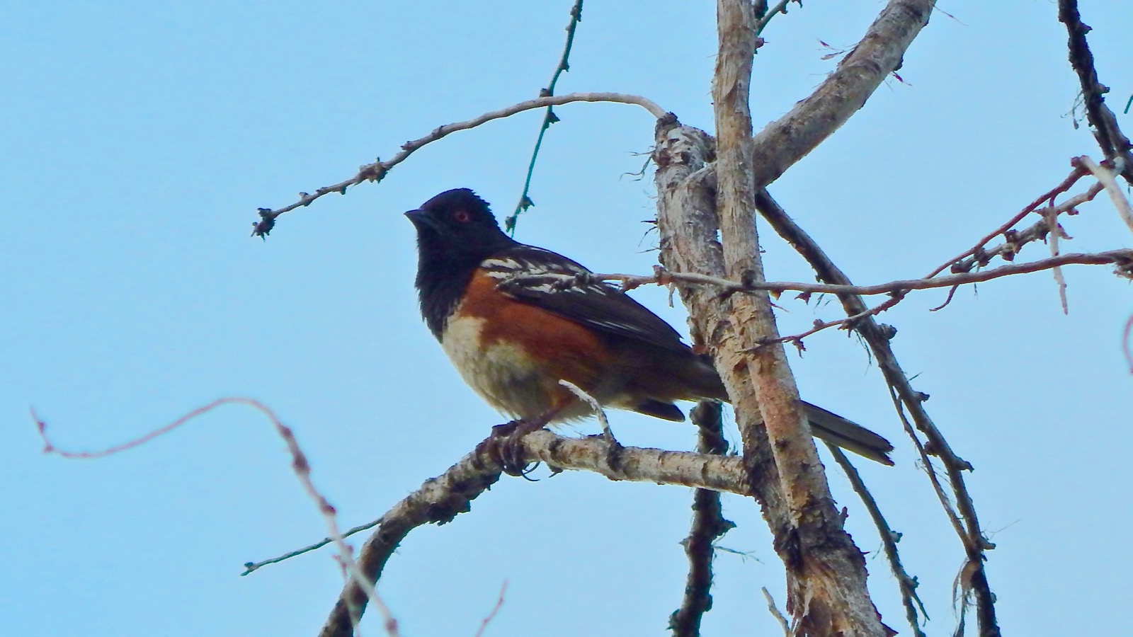 Rustling through the leaf litter below the dry scrub brush that laces the steep, Colorado foothills is where you’ll find a hefty sparrow known as the spotted towhee. Such beautiful birds, the males have a white belly, orange sides and a black head, throat and upper parts. The back and wings are flecked with white spots while the red eyes are the defining characteristic.
