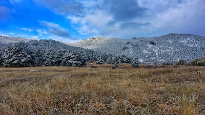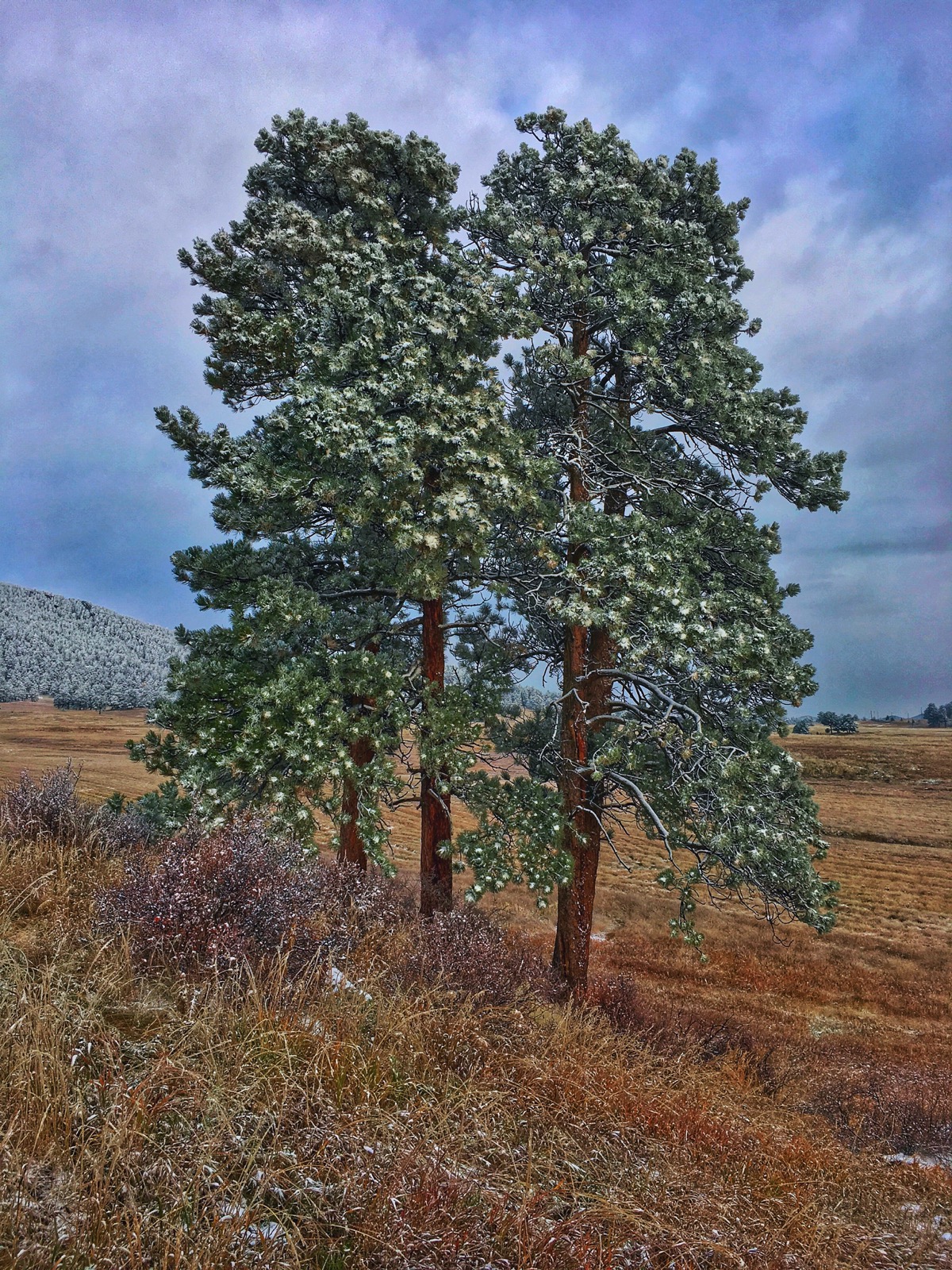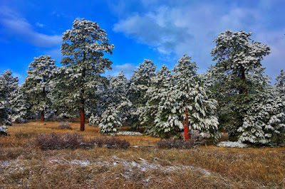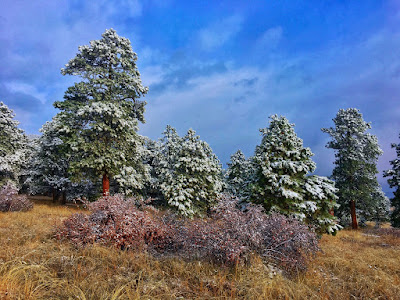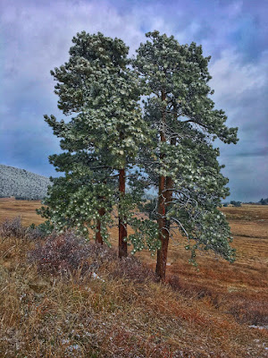 The morning after our first snow and the clearing storm revealed an absolutely pristine landscape. Glittering in the soft light, a pair of ponderosa pine were glazed with fresh, white powder, creating a pointillistic effect.