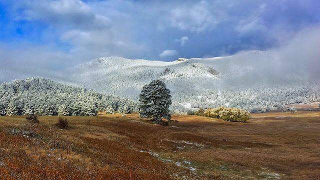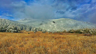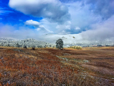 The gathering of dense clouds dispersed, unveiling a cold mountain that was frosted from field to summit. Gradually the white peak came into focus, crowning the autumn landscape with a staggering beauty that can only be witnessed this time of year.