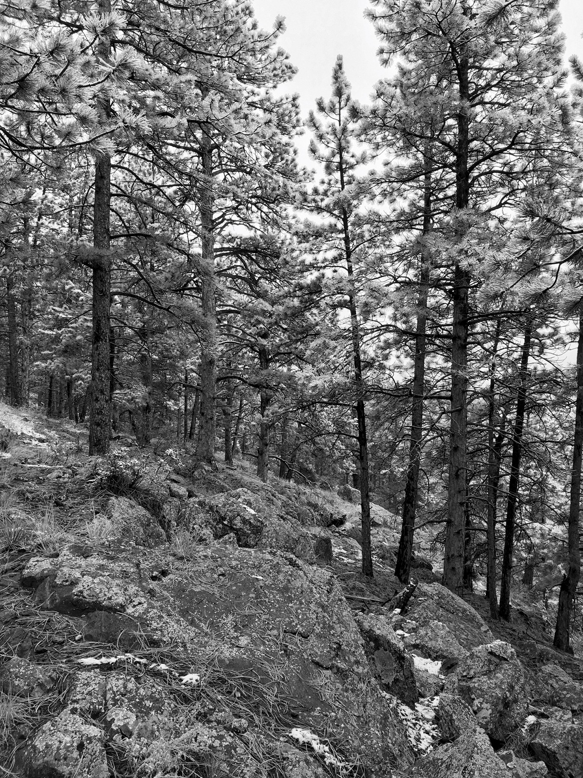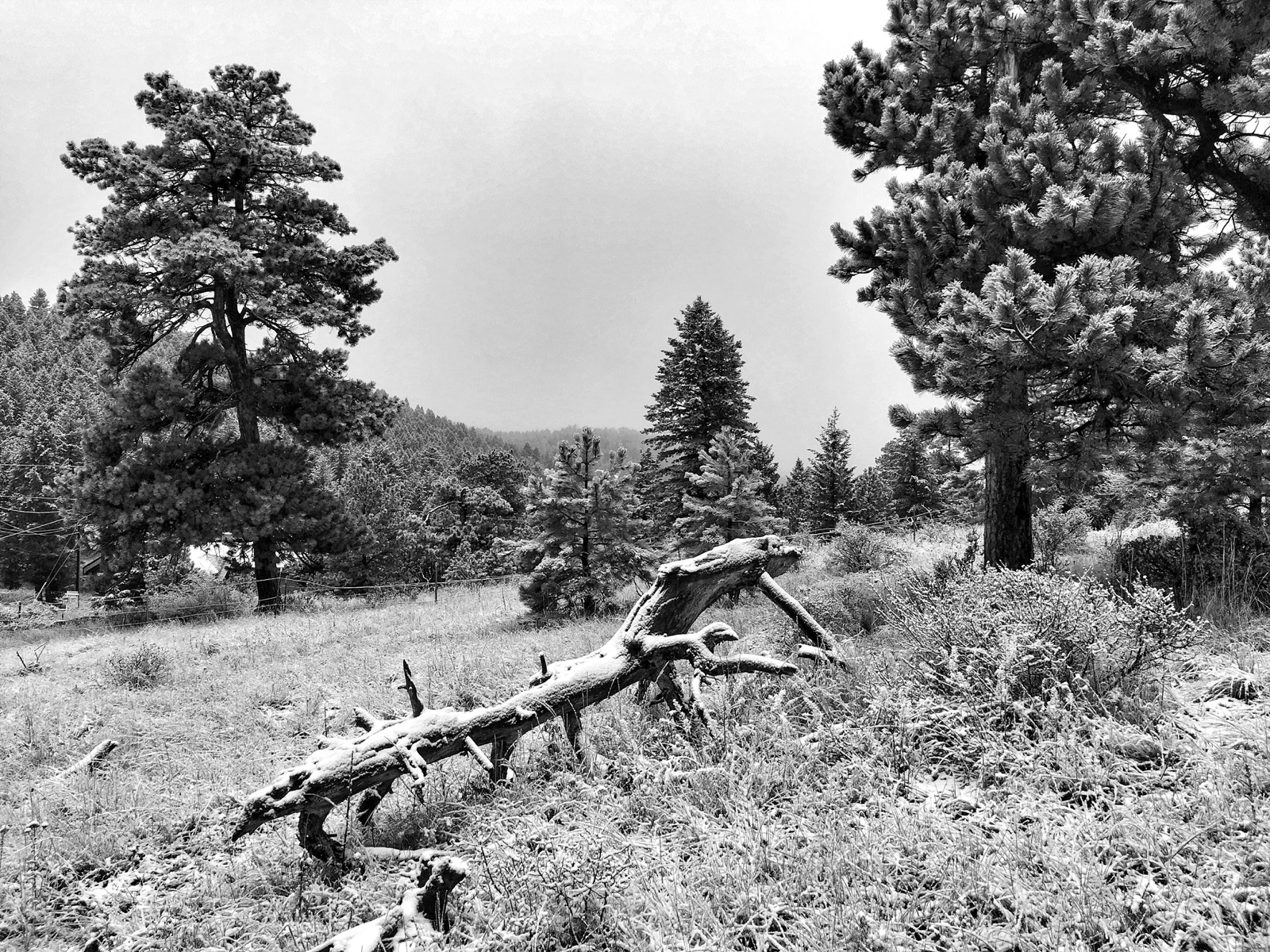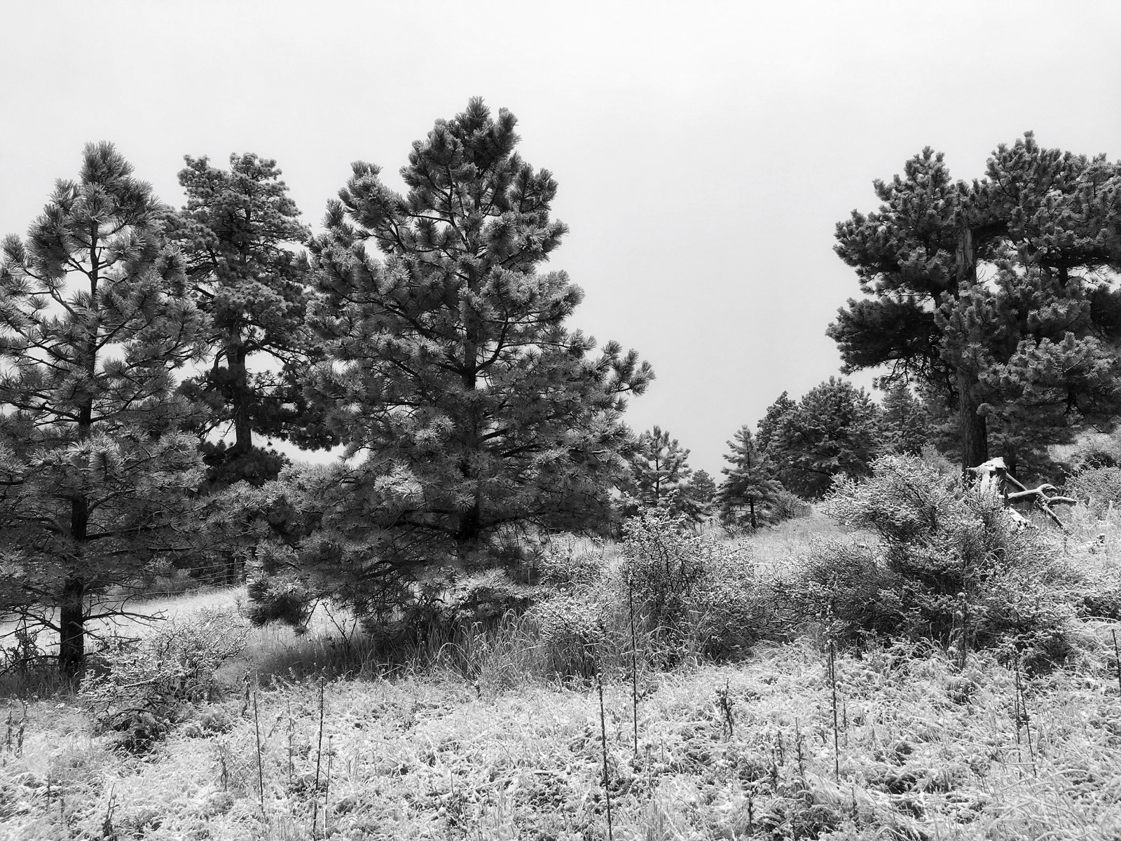 On an early October morn, the first snow in the golden foothills could only be described in a soft monochrome. Rooted into a rocky hillside, an elegant forest of lodgepole pine was distinguished by a silvery tone.