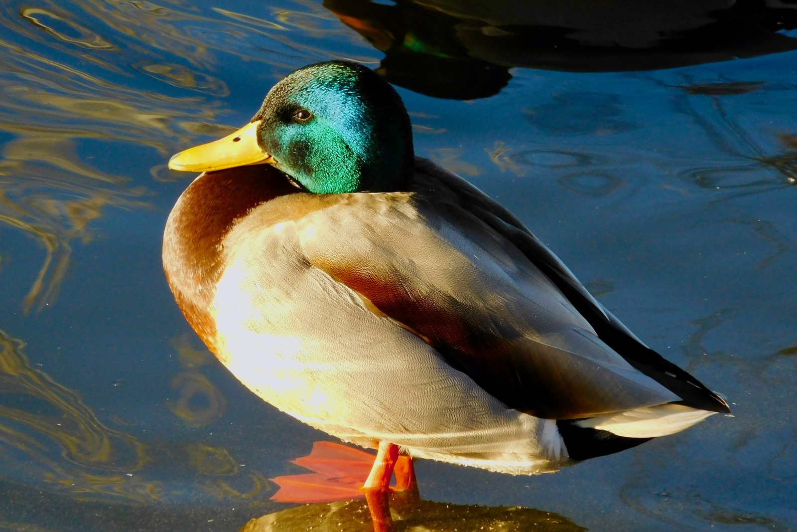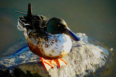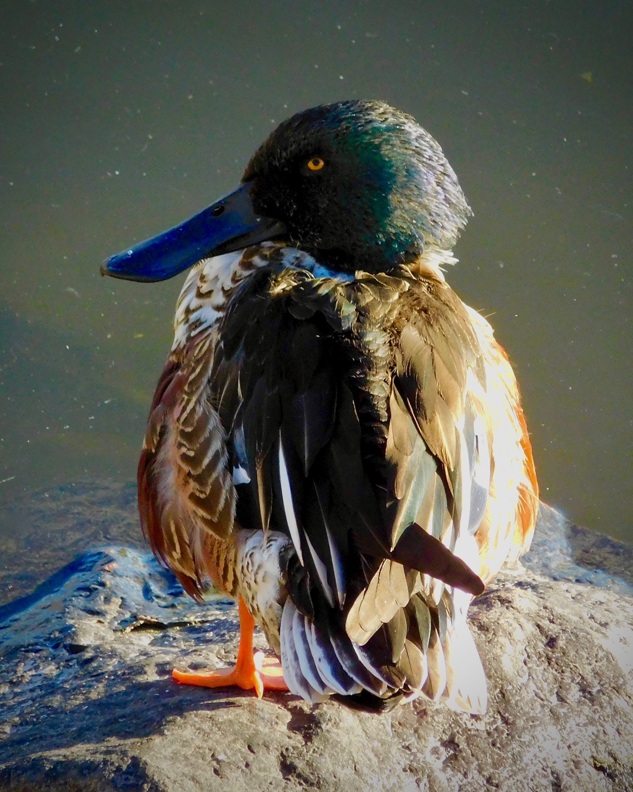 Also basking in the warm sunlight, a male mallard’s already iridescent coloring sparkled even more brilliantly. The shovelers segregated themselves from the rest of the pack, staying close to shore on the rocks while forming a striking silhouette.