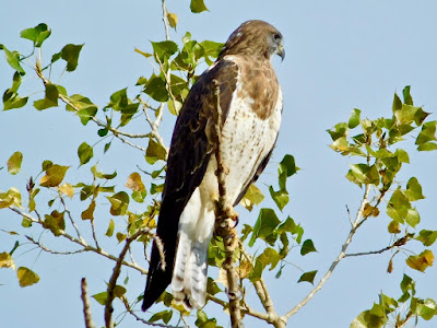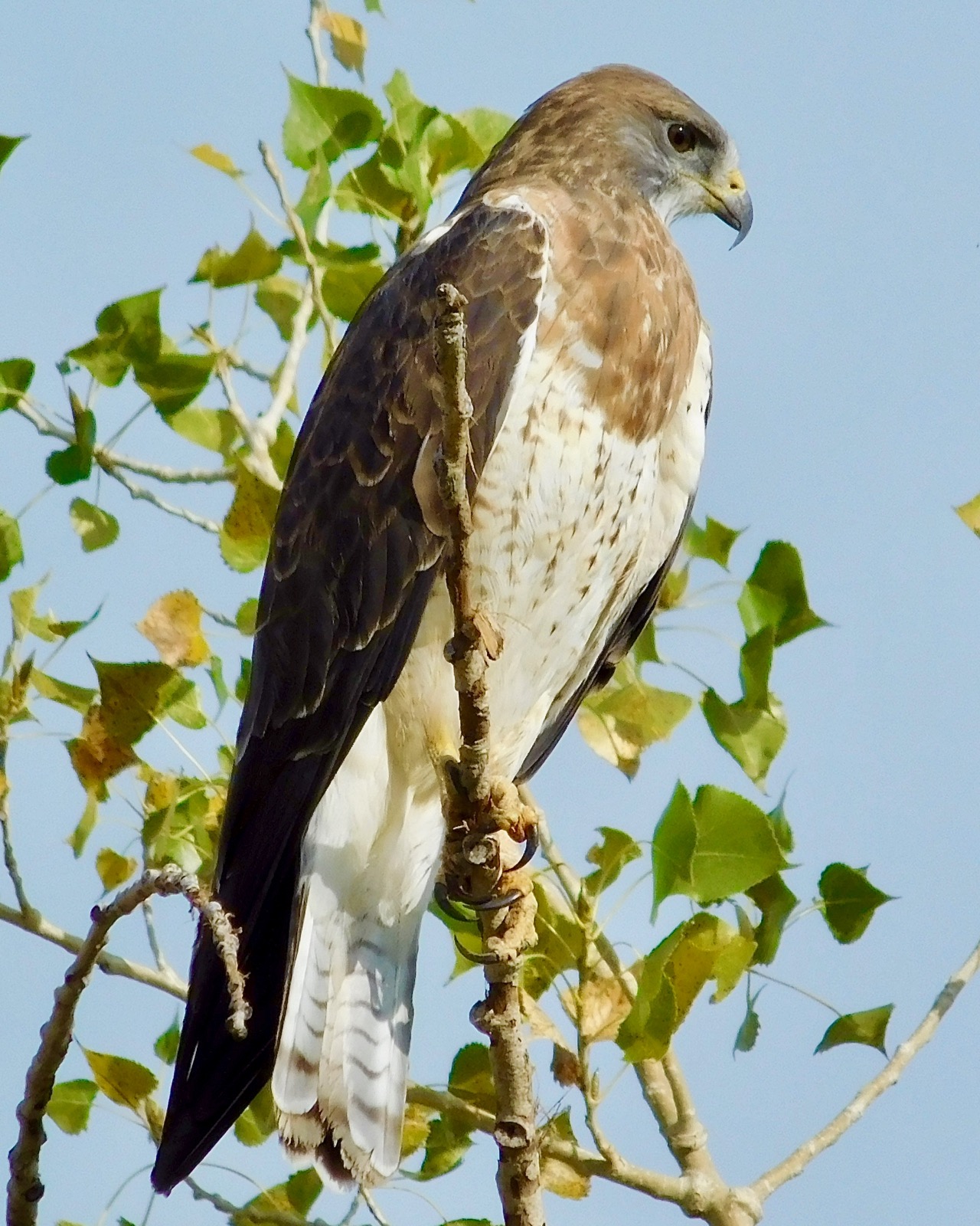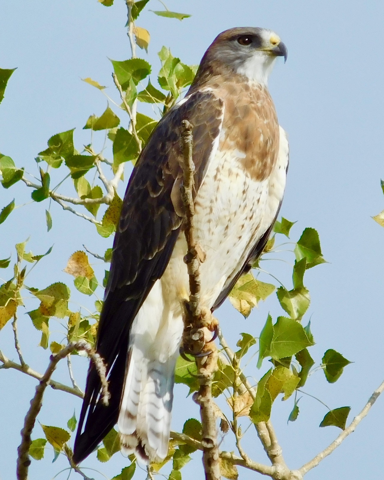 Found mostly east of the Continental Divide, the species’ light phase is quite elegant. This narrow-winged hawk has dark flight feathers, white underwings and belly, a finely barred tail and a handsome rufous bib.