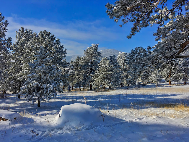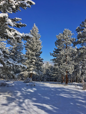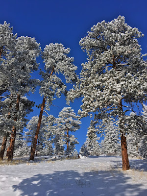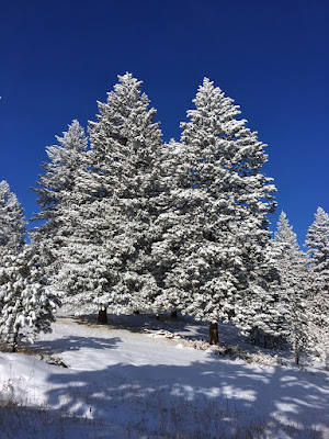 Last week, the morning after the storm, the trees were glazed with scumbled swatches of fresh snow. Their cobalt shadows crept quietly across the smooth drifts.