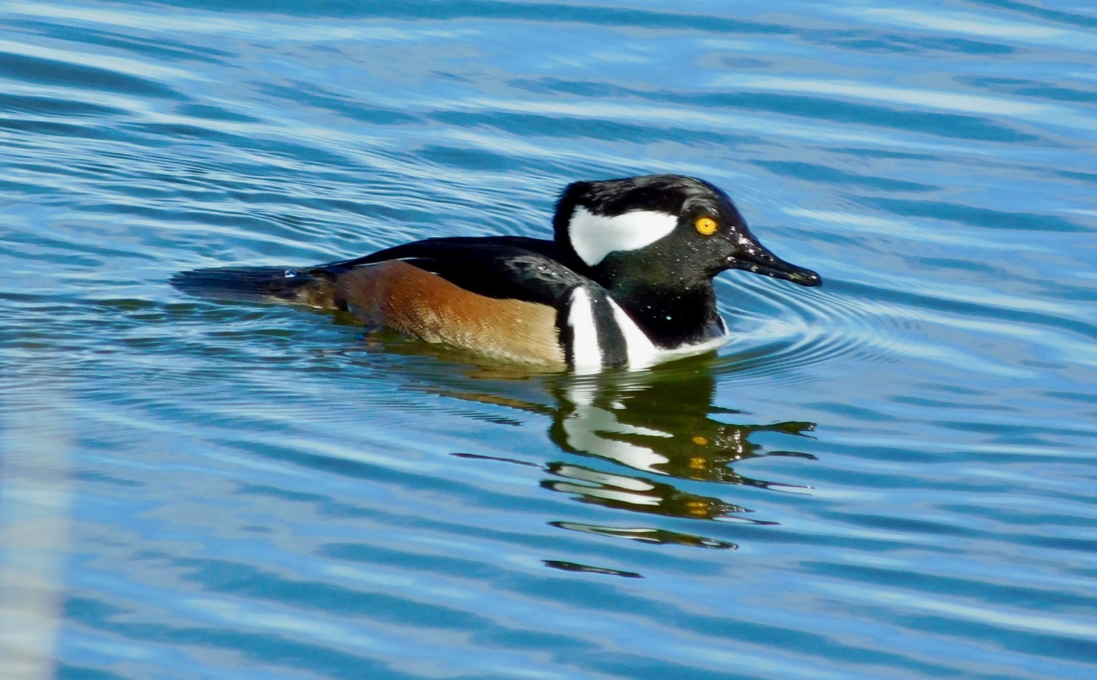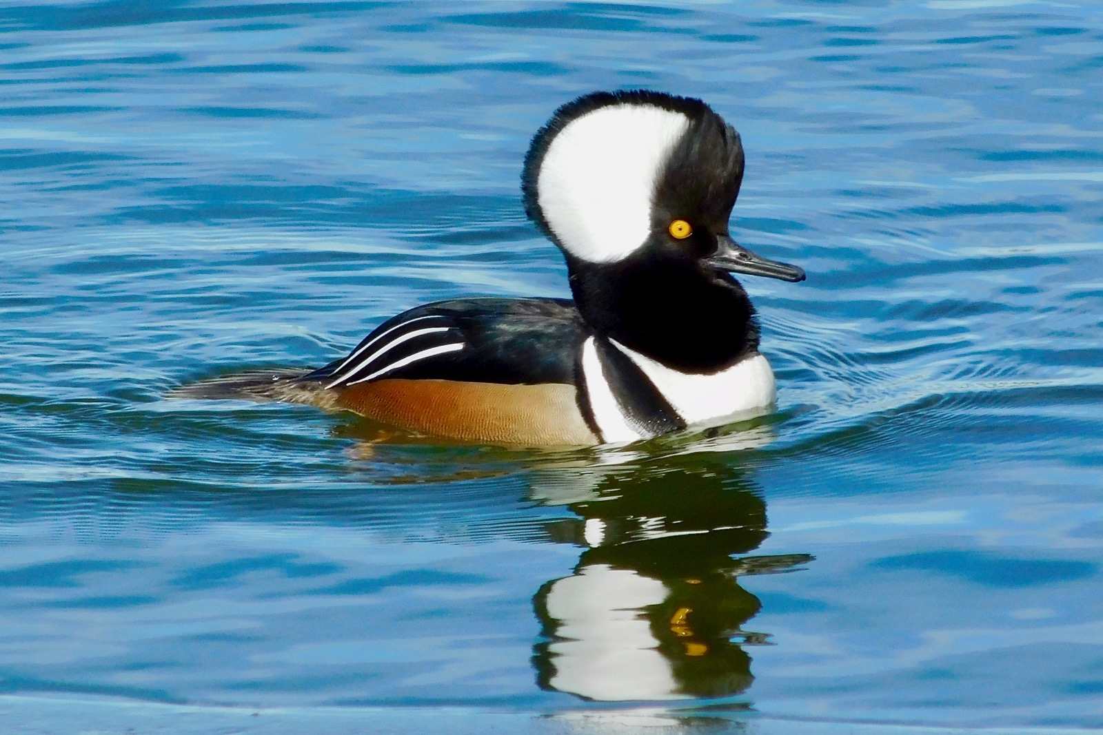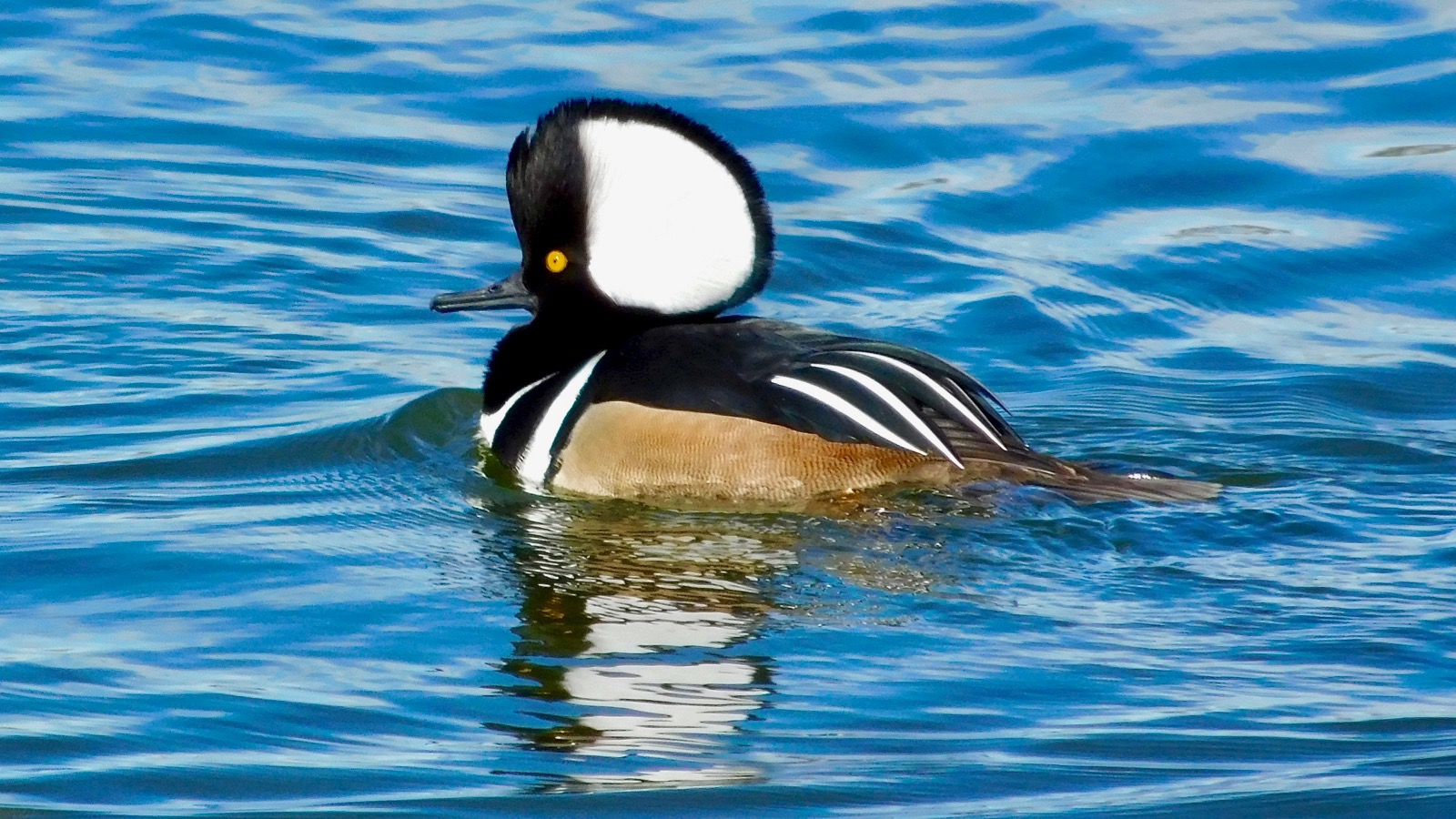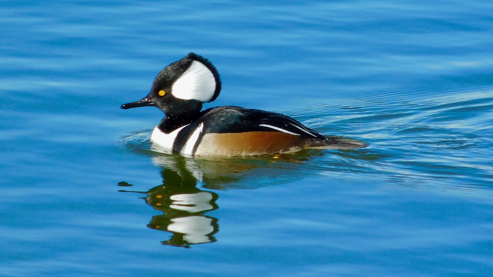 The hooded merganser is a diving predator and the only duck that specializes in capturing fish. They’re able to track down food by sight because their eyes are specially adapted for unsurpassed underwater vision.