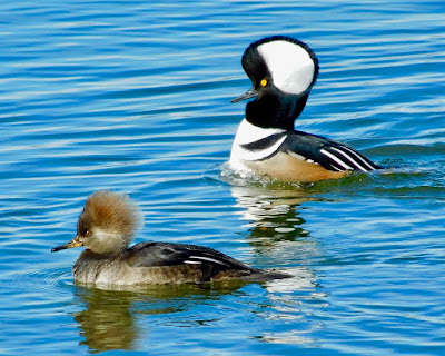 Perhaps the most distinguishing characteristic is their striking appearance as both male and female exude elegance in their own way. The gals take on a dusky look with a dark head, bill and chest but they display a fancy orange hairdo that can be raised and lowered at will.
