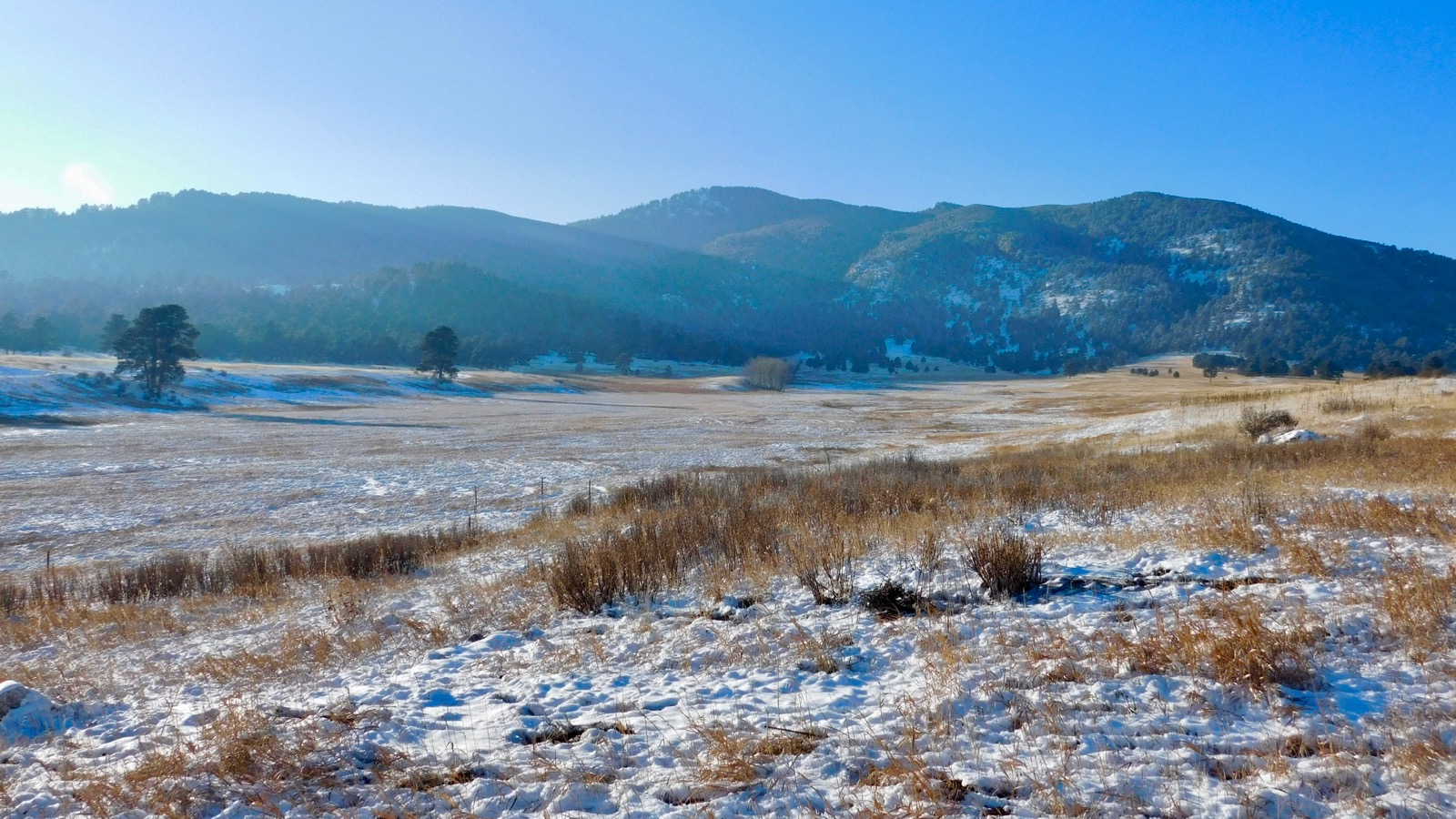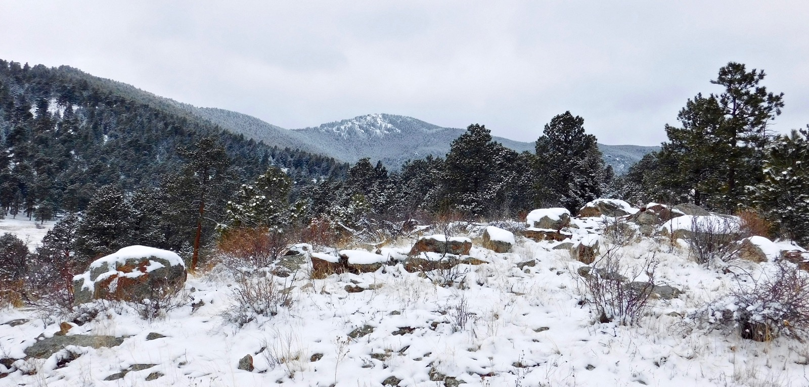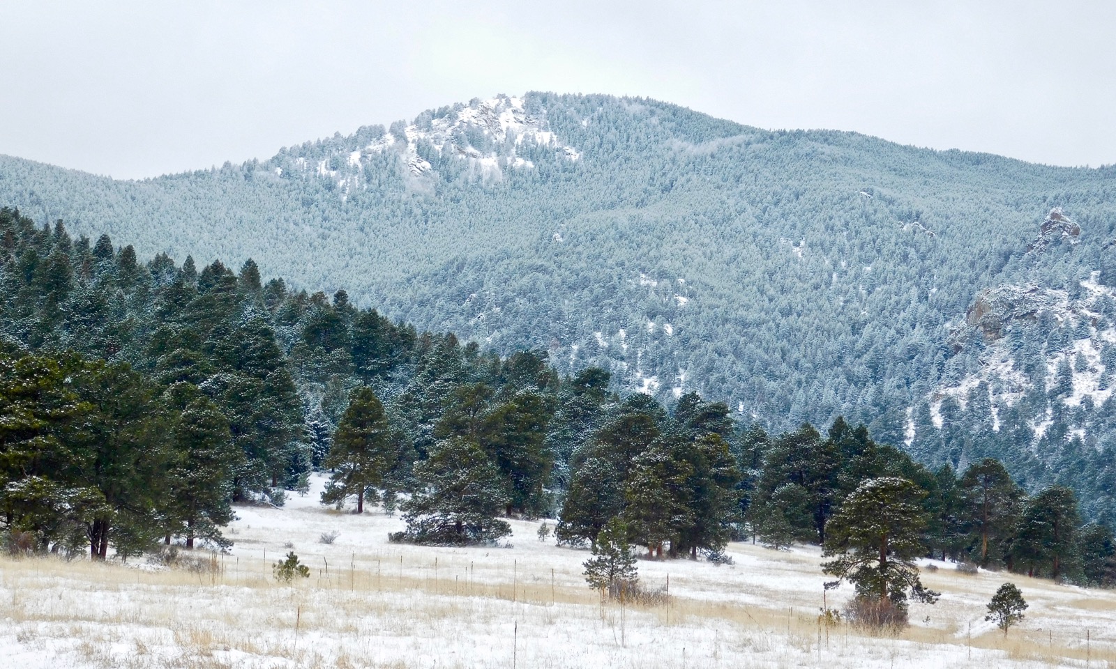 Bergen Peak’s high summit has been streaked with eternal snow all year long and the mountain’s east face is displayed like a silver facade. Ribbons of gray clouds fill the sullen sky, creating a forbidding flyway.
