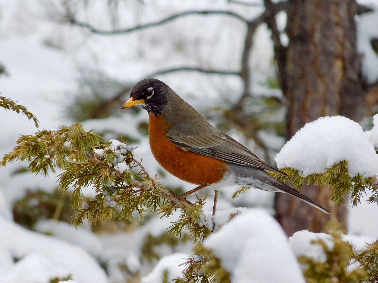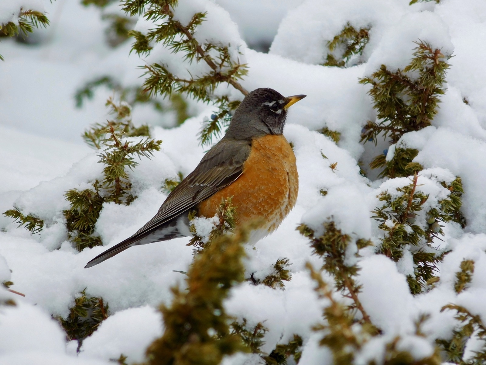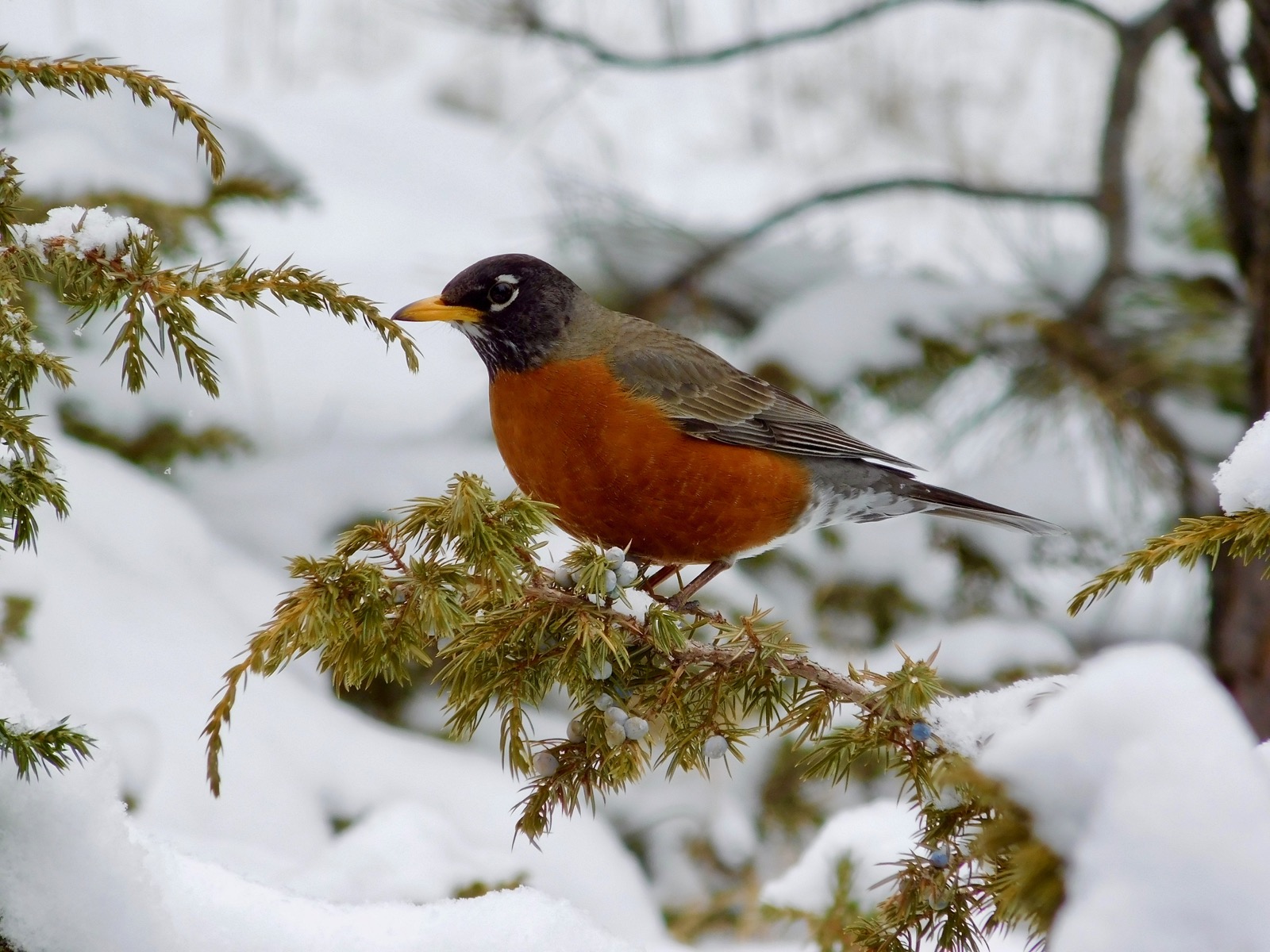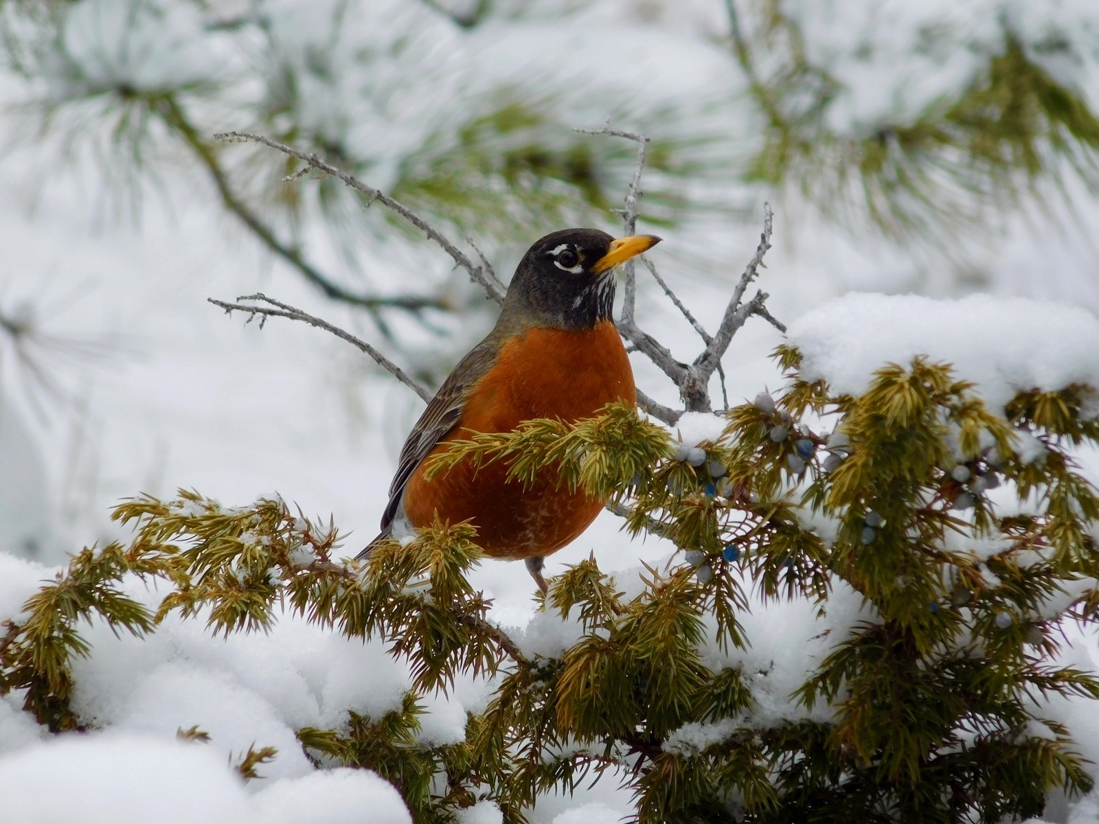 After such a cold and stormy winter, the still frozen lakes and ponds have delayed the arrival of our feathered migrants. Despite harsh conditions, the first birds I’ve seen were a flock of famished American robins.