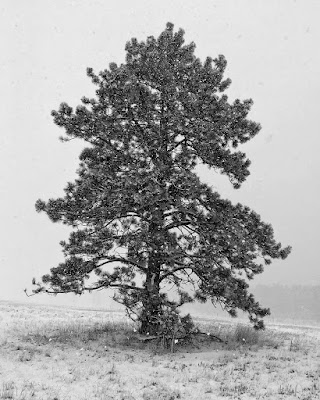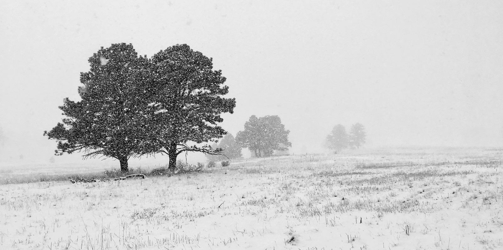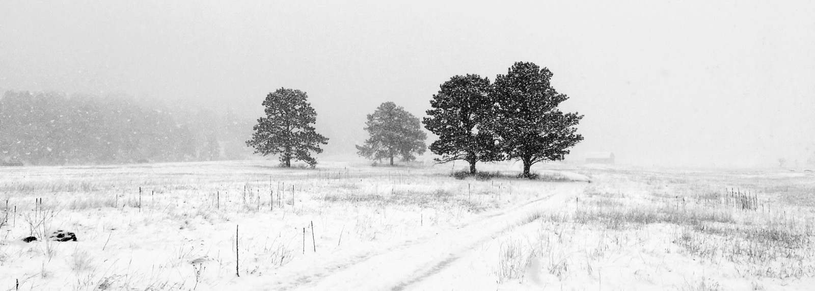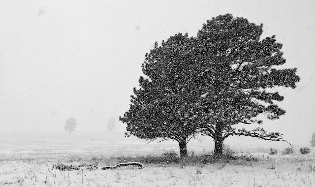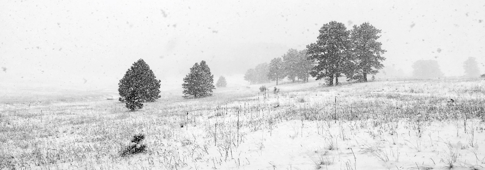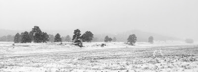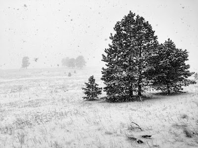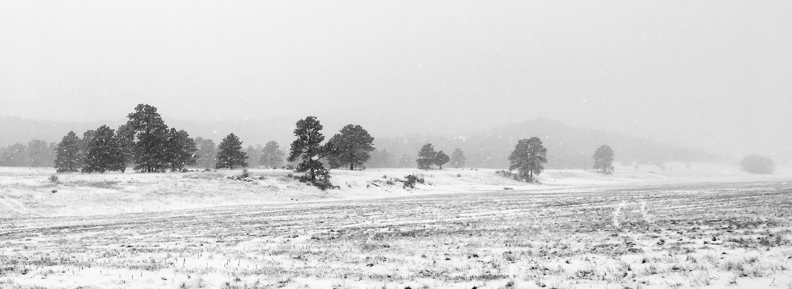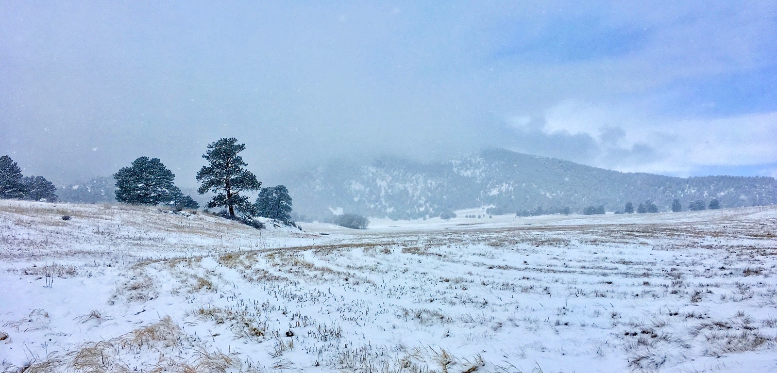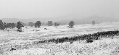 Winter weather has continued to pummel the foothills leaving behind a panorama of white meadows and black forests. The big peaks have all but vanished from the landscape as a layer of thick fog has erased them from view.
