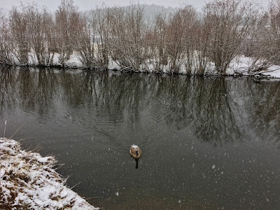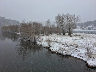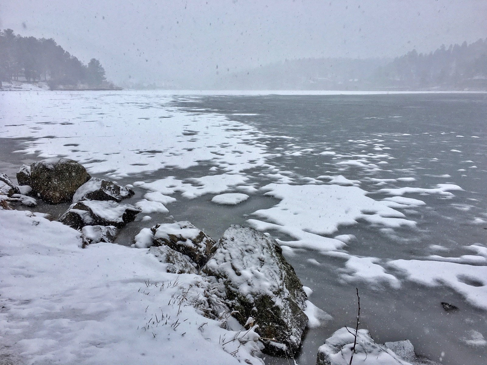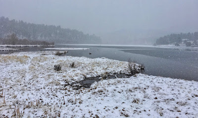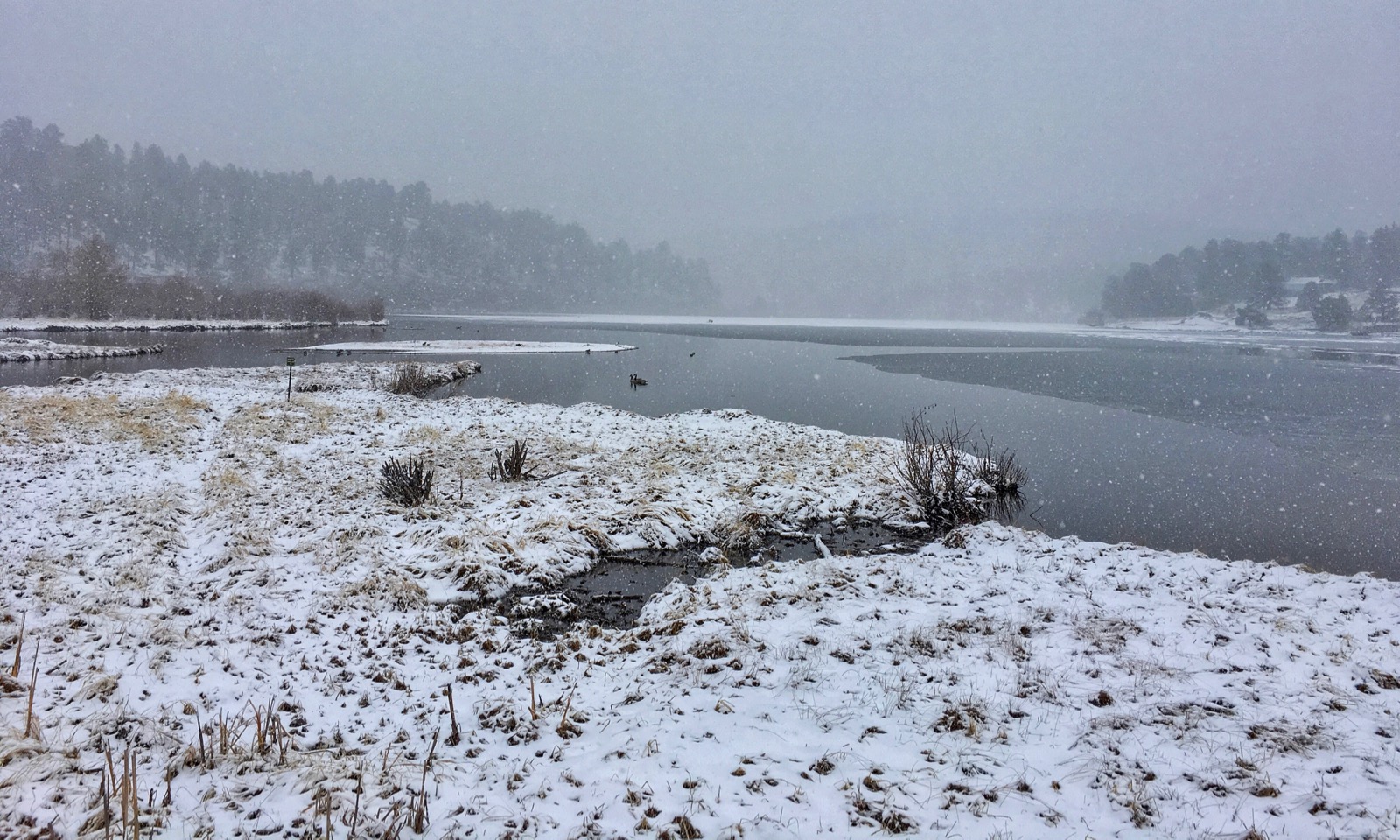 When the turbulent episode finally hit, the snow came pouring down in sheets of freezing rain transforming the local wetlands into a white valley. Evergreen Lake with its black water, icy shoreline and invisible horizon looked like an Arctic landscape.