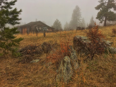 The illusion of great depth was exaggerated as trees in the distance were placid silhouettes while the nearer rocks revealed a rough texture. An abandoned homestead was barely visible as it melded into the haunted hillside.