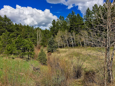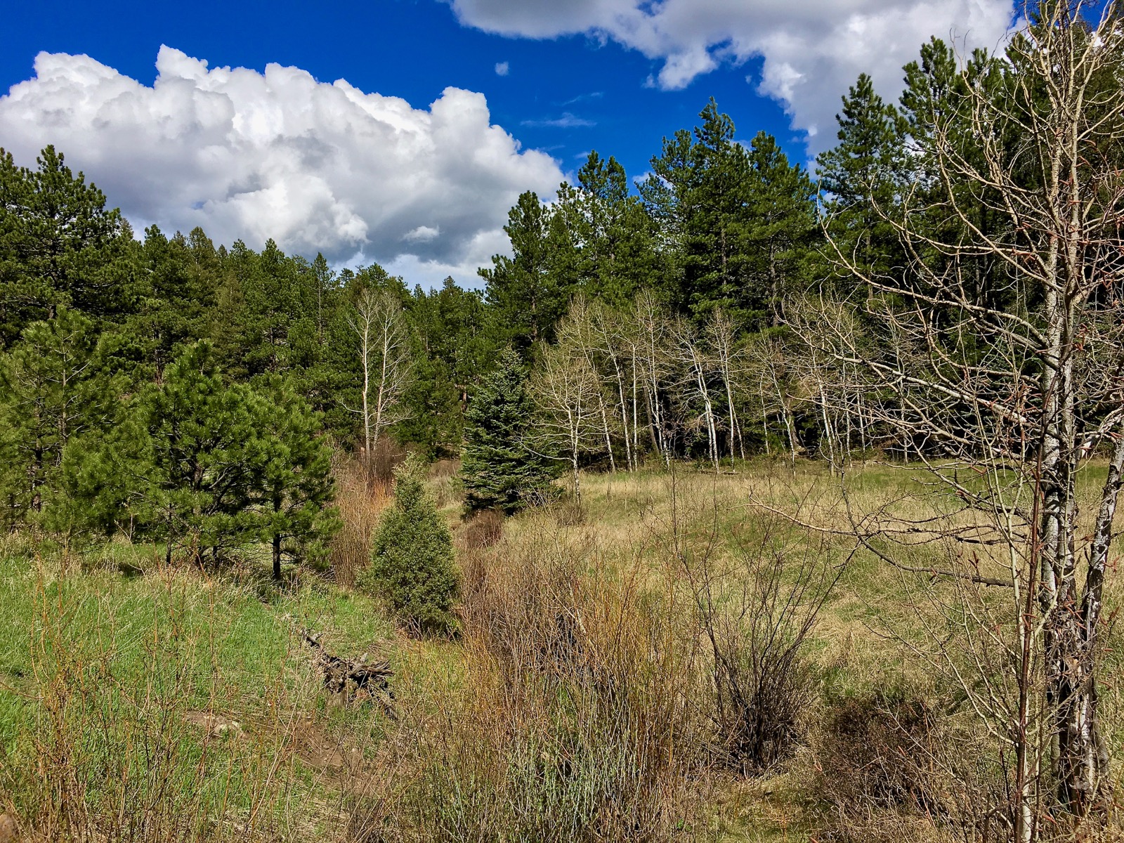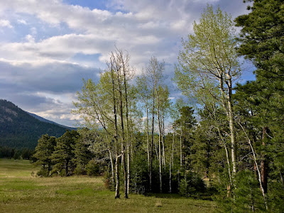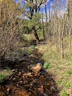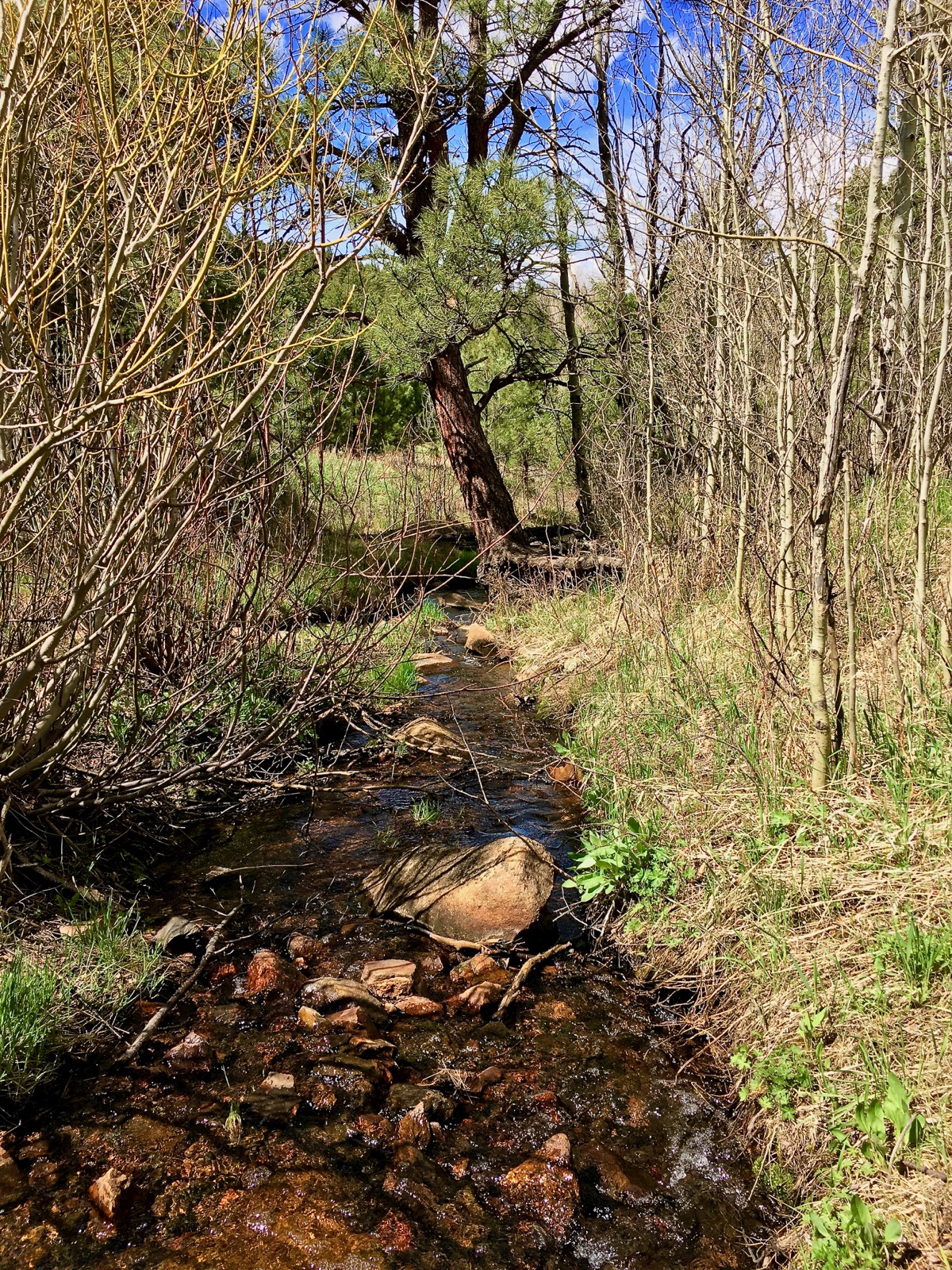 Its banks crowded by stands of barren aspen, the shallow stream is slow moving because the big peaks that fill it are still locked in a fierce battle with snow and ice.