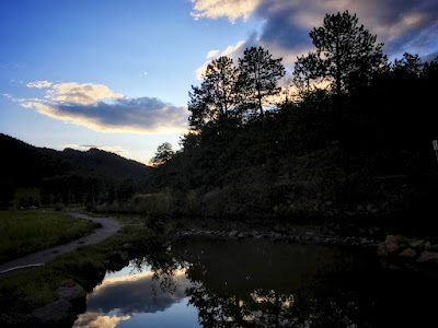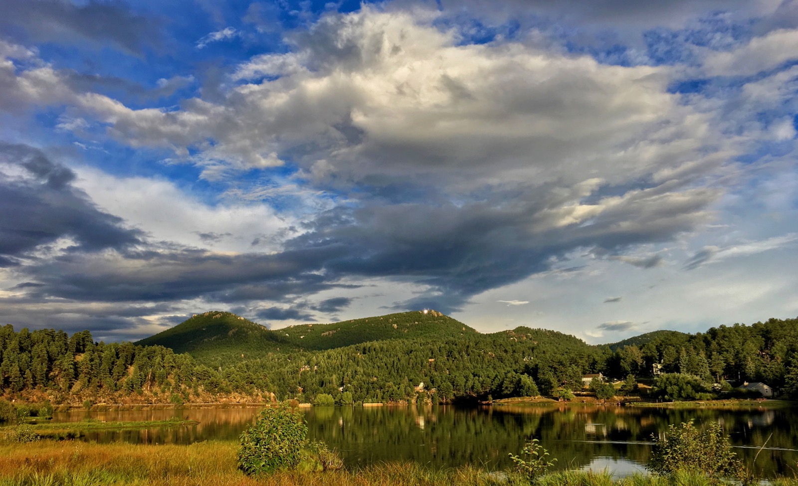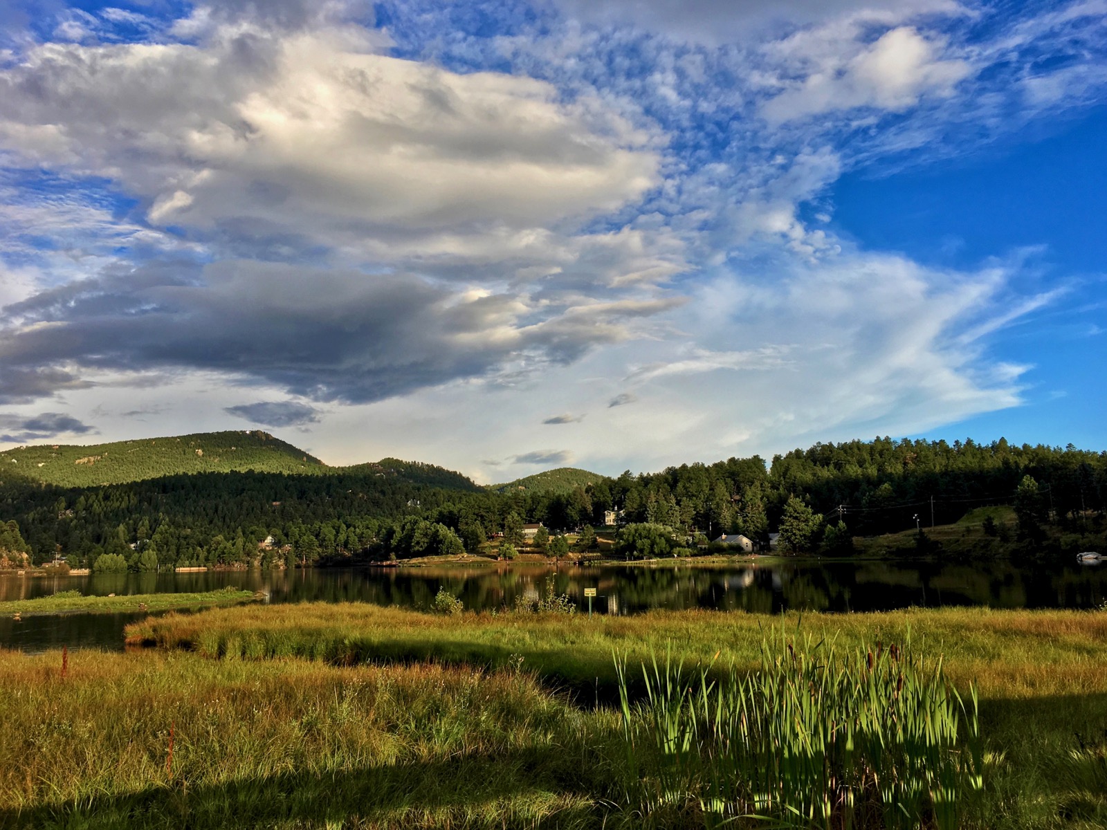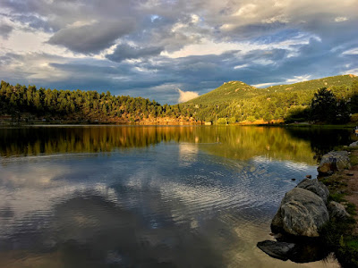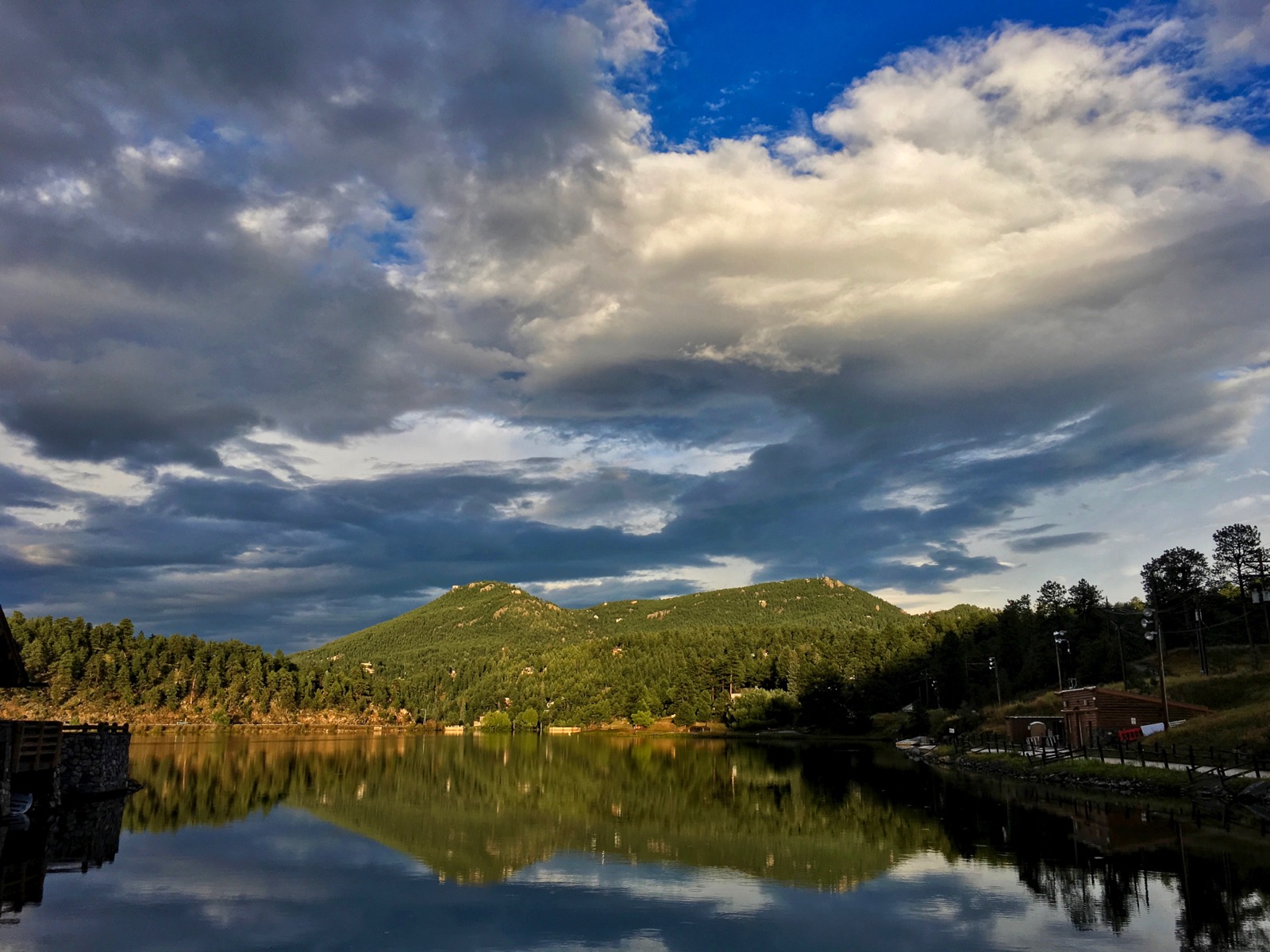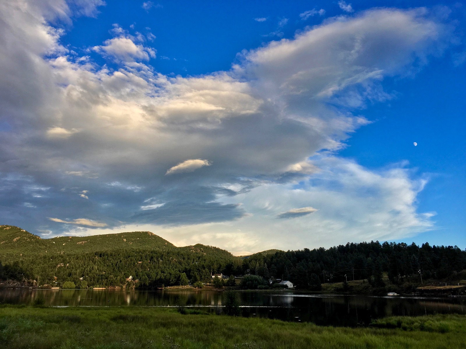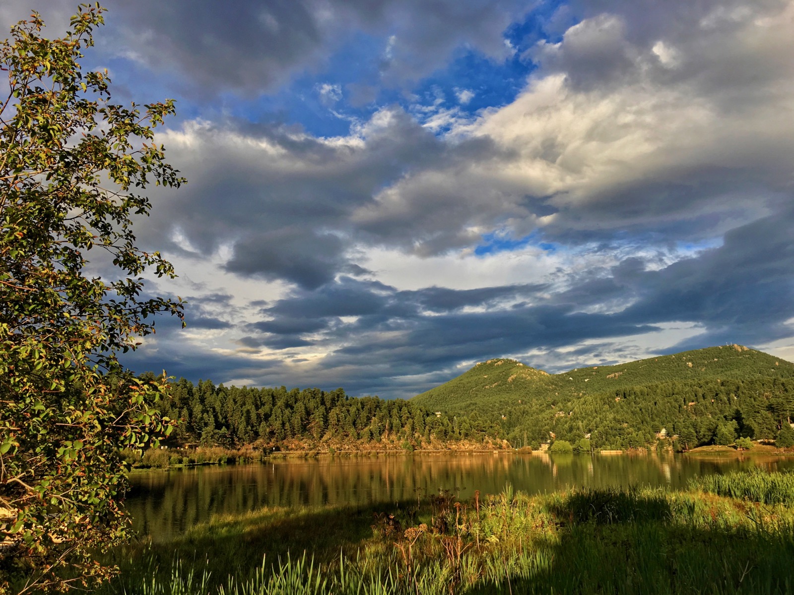 After a few hours, the dramatic weather drifted to the east and the broken clouds allowed shafts of low light to confirm the event’s conclusion. Under such unusual conditions Evergreen Lake was awash with a sheen of surreal color.