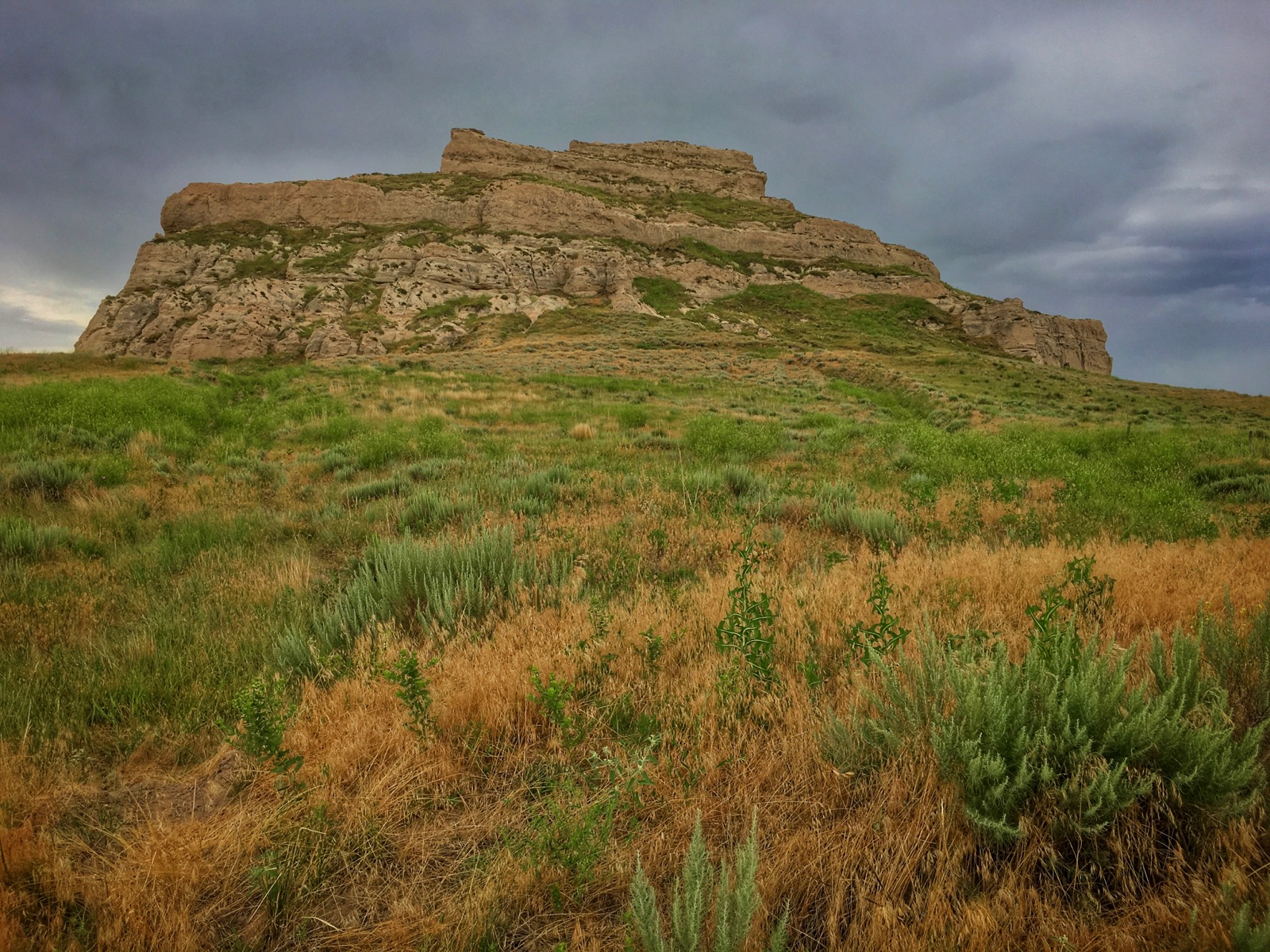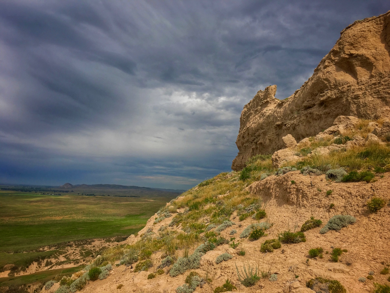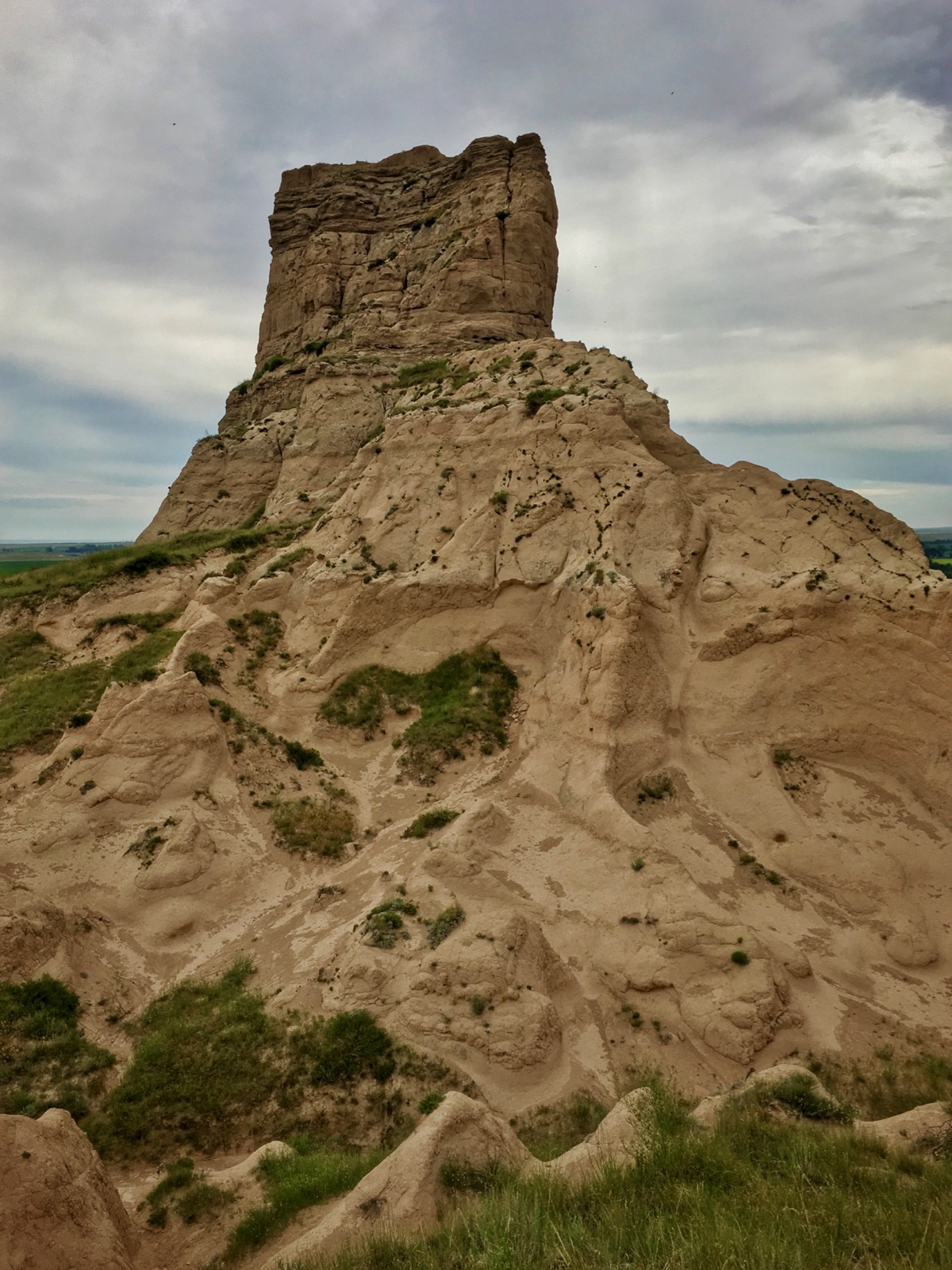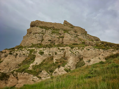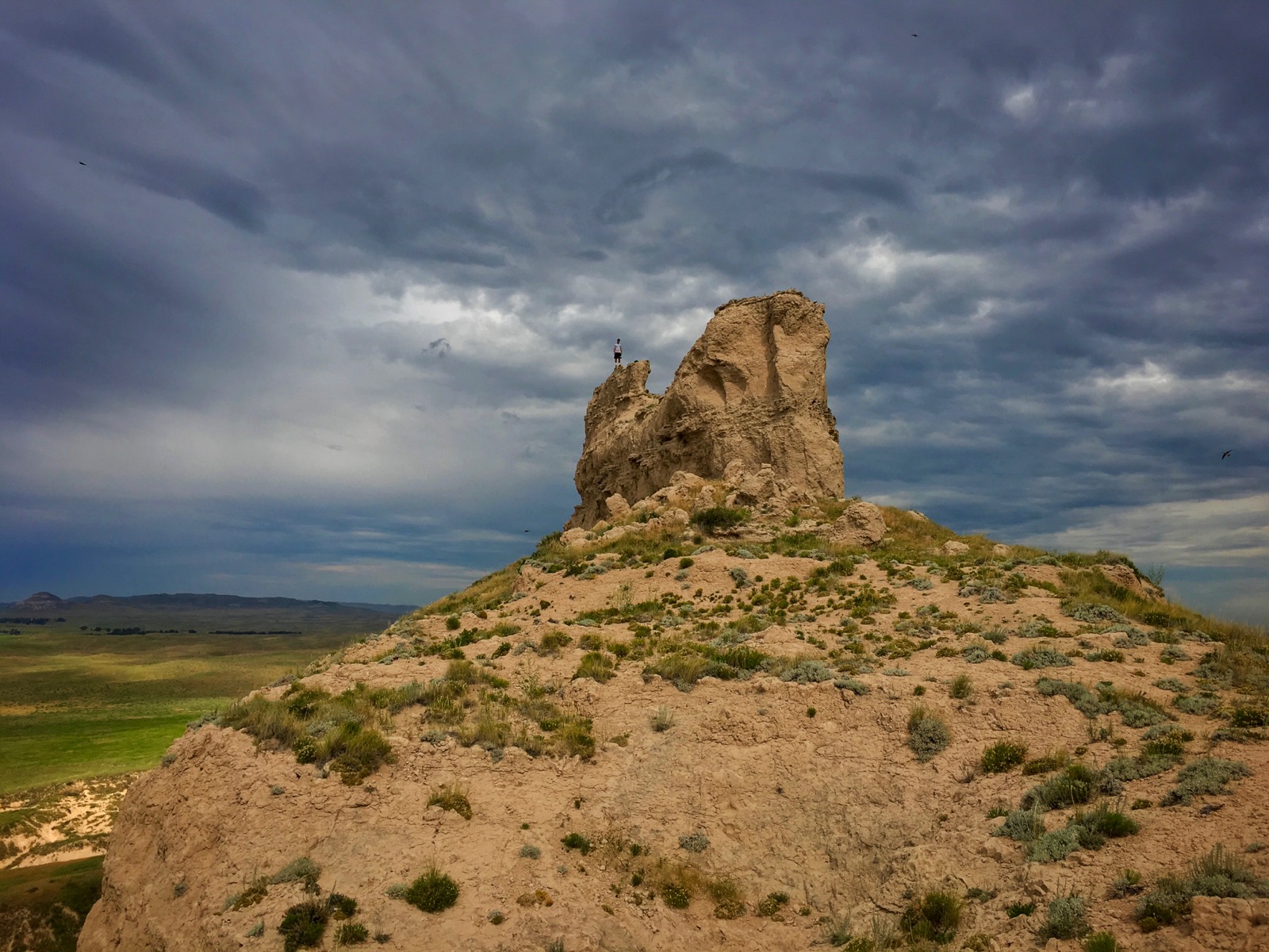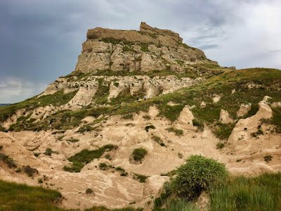 While we rested on the slender summit, we enjoyed a panoramic view that ranged from the North Platte River all the way to Chimney Rock. The rapid descent was a little bit dicey because a light rain fell down making the clay crags and chutes extremely slippery.