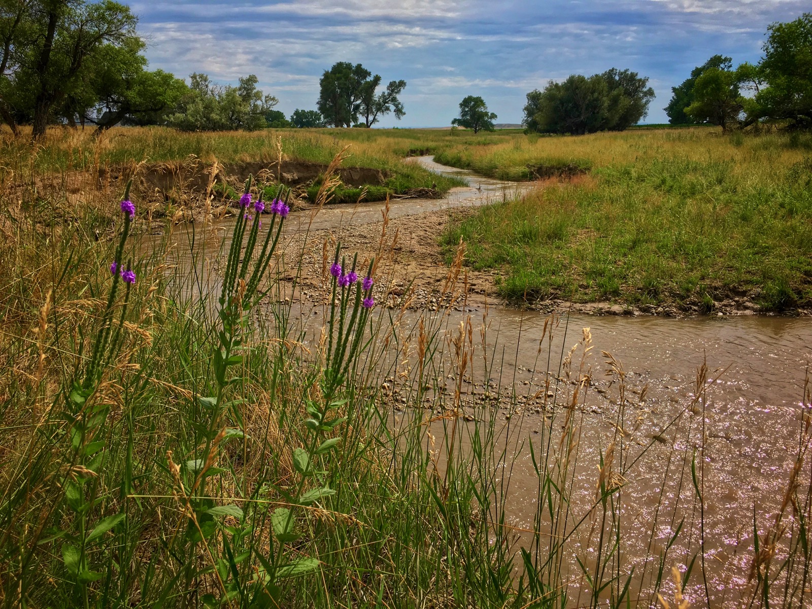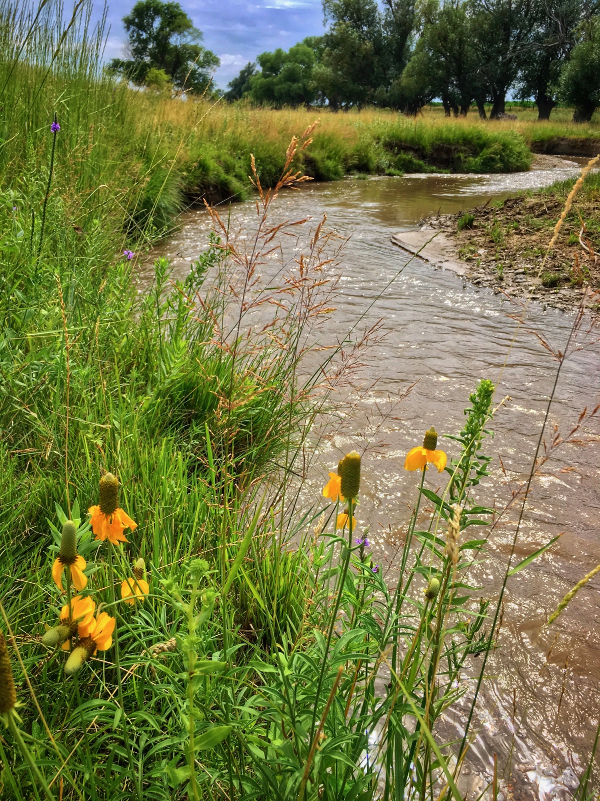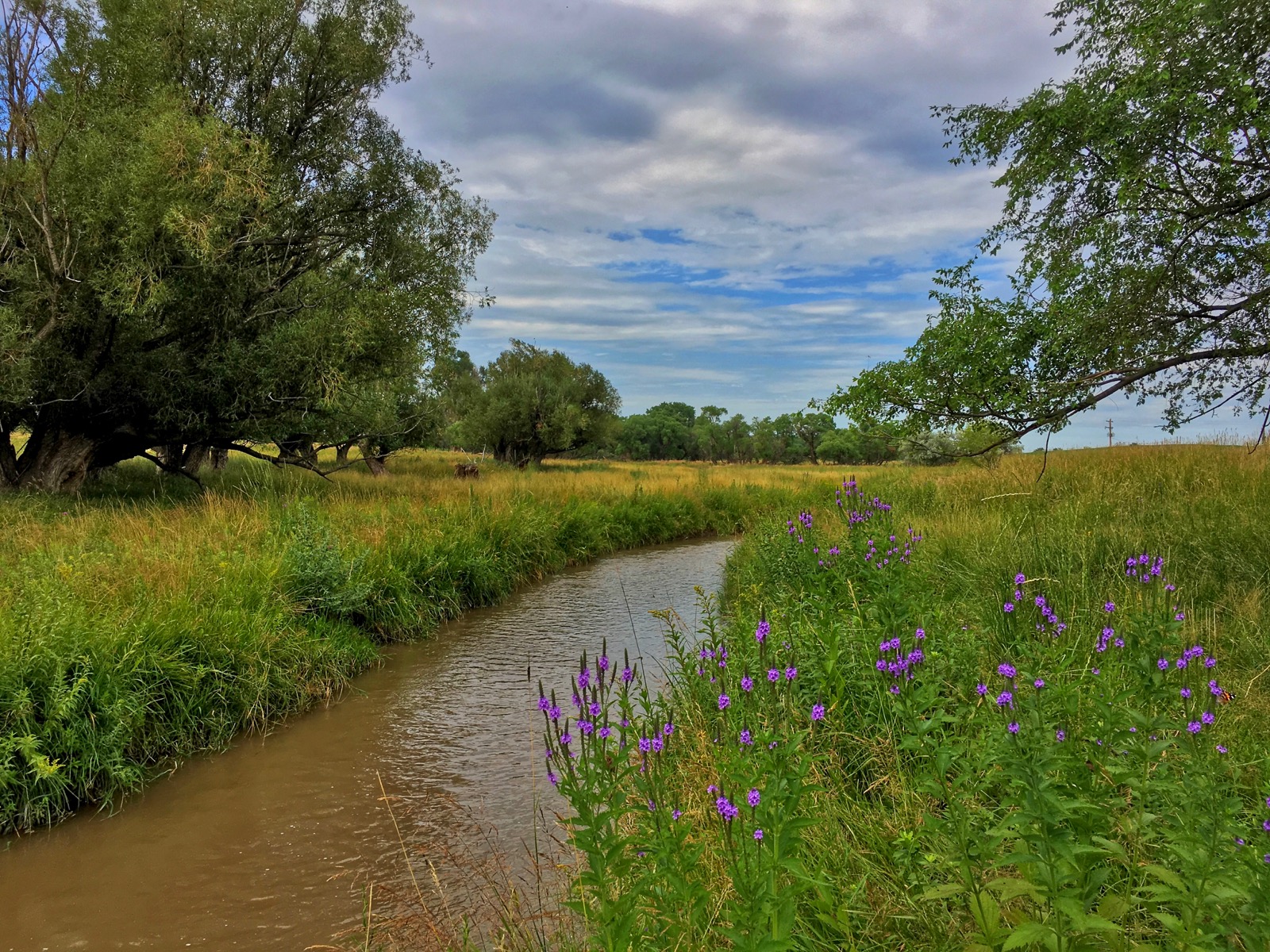 The ensuing adventure took place on flat land but it traced the contour of a fast-flowing river and it was not less exhilarating. The muddy creek rushed through a flower-filled pasture inhabited by a few horses and a multitude of black cows.