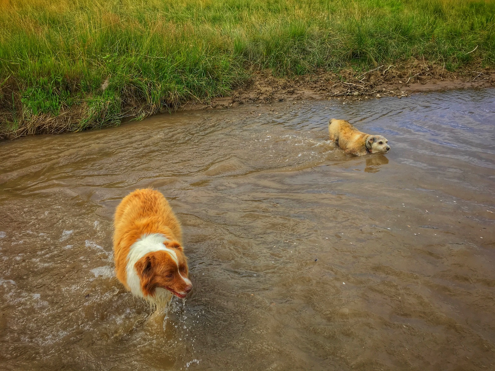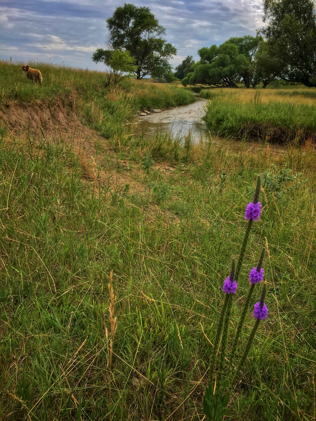 The riparian environment was a haven for all kinds of insects but mostly we saw dragonflies, bumblebees and a profusion of colorful butterflies. A pair of pups led us on the expedition and after the clouds burned off it got hot so they spent most of the time wading in the shallow stream.