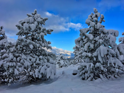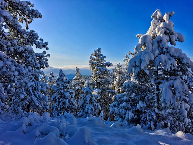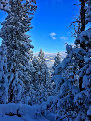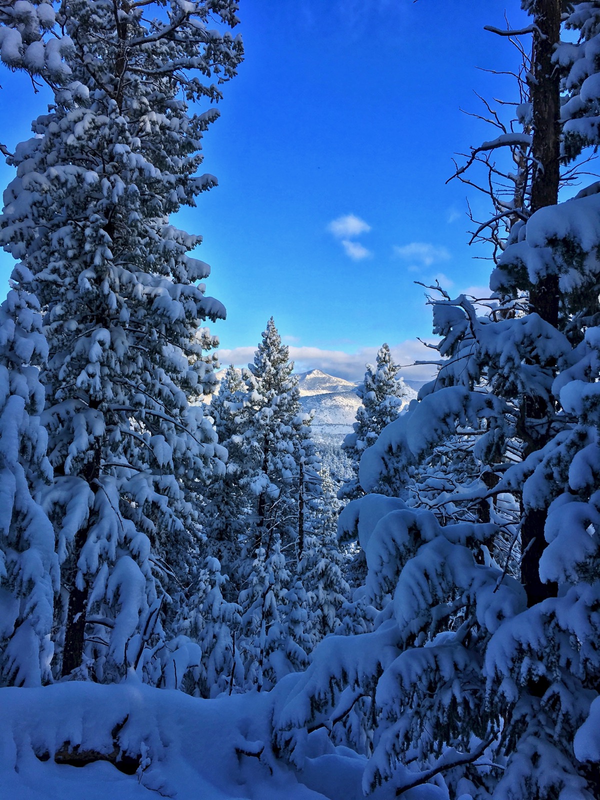 Ascending the mountain through knee-deep powder was a breath-taking, heart-pounding, sweat-breaking struggle. Upon reaching the summit, blue skies burst through the last remnants of soft cloud cover exposing the storms gorgeous aftermath.