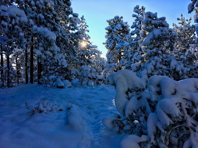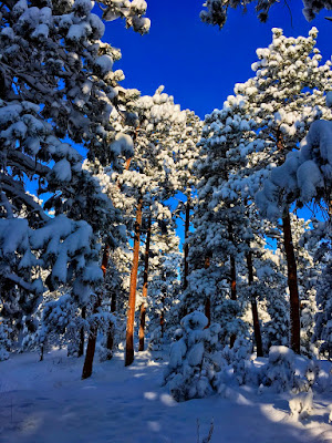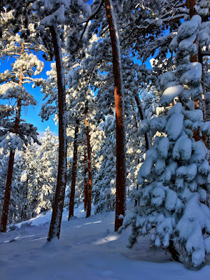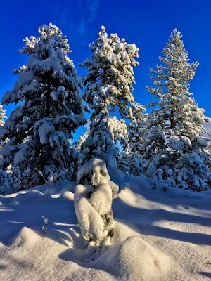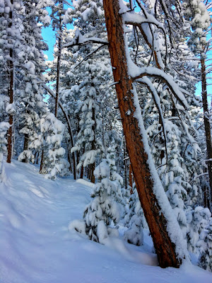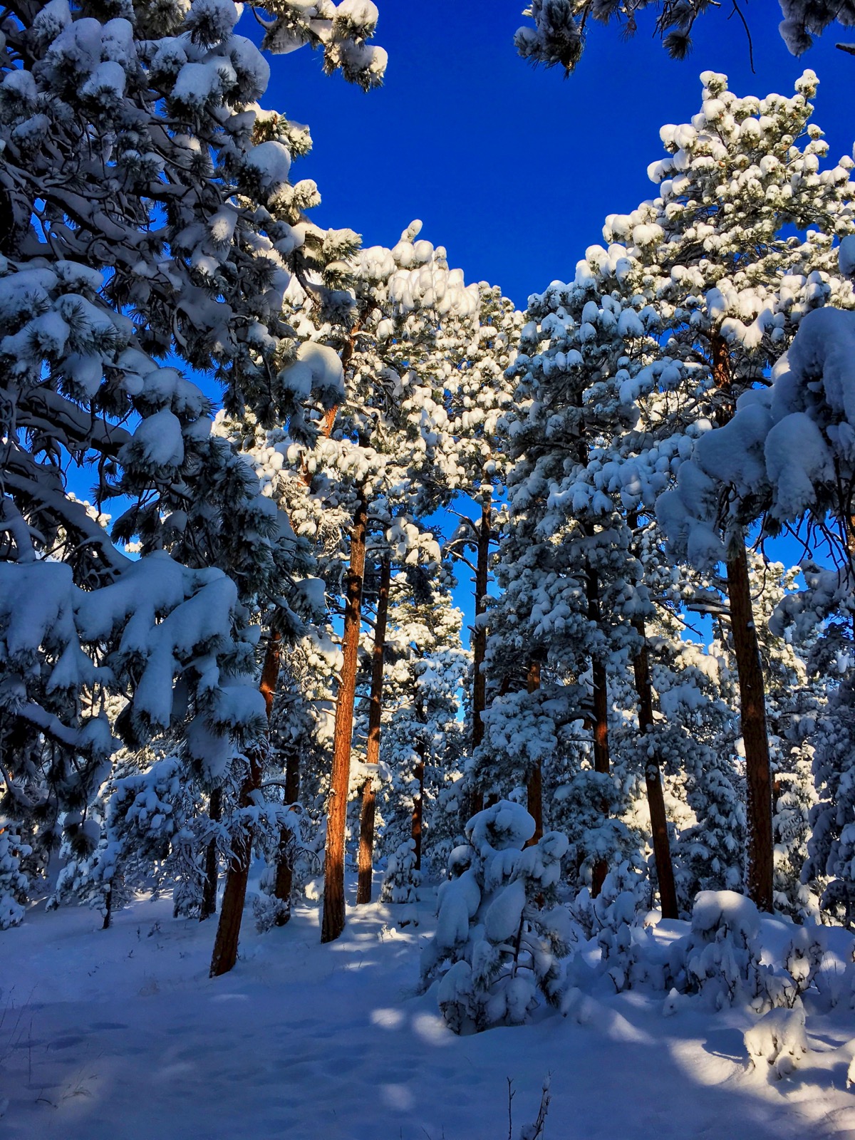 Deep inside the woodland, unavoidable confusion was defined by a wintry mix of strong shadows and filtered sunlight. As the lodgepole pine shook free from their white robes, I got soaked by a cold shower.
