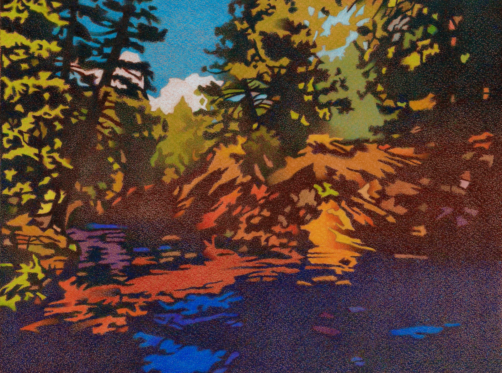 It is a natural patchwork of opposing pigments where a warm highlight streaks across the creek’s cool surface. The rock cliff’s sharp angles convey action and dynamic movement that spreads across the unusual drawing.