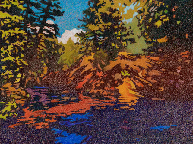 It is late summer in the Colorado foothills and Bear Creek is flowing steadily through a narrow, forest-filled canyon. The pastoral scene is a study in contrast involving shapes, edges, values and color.