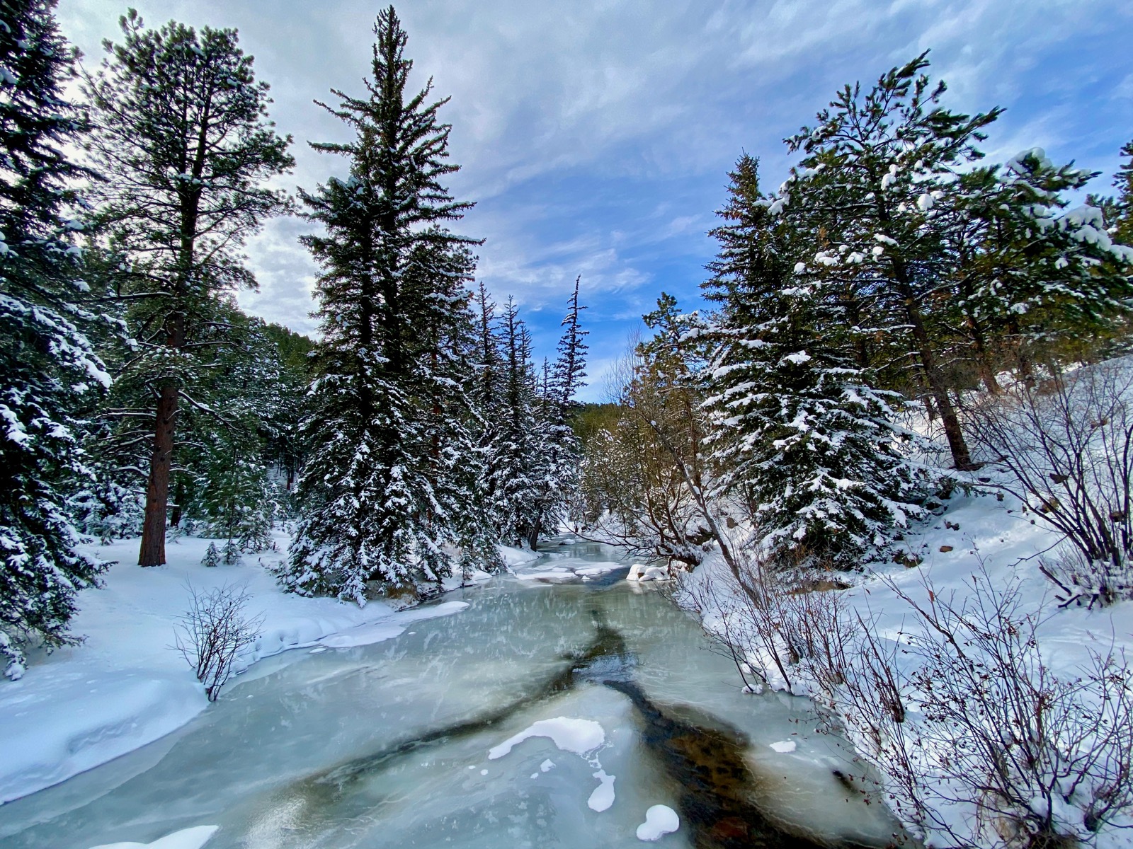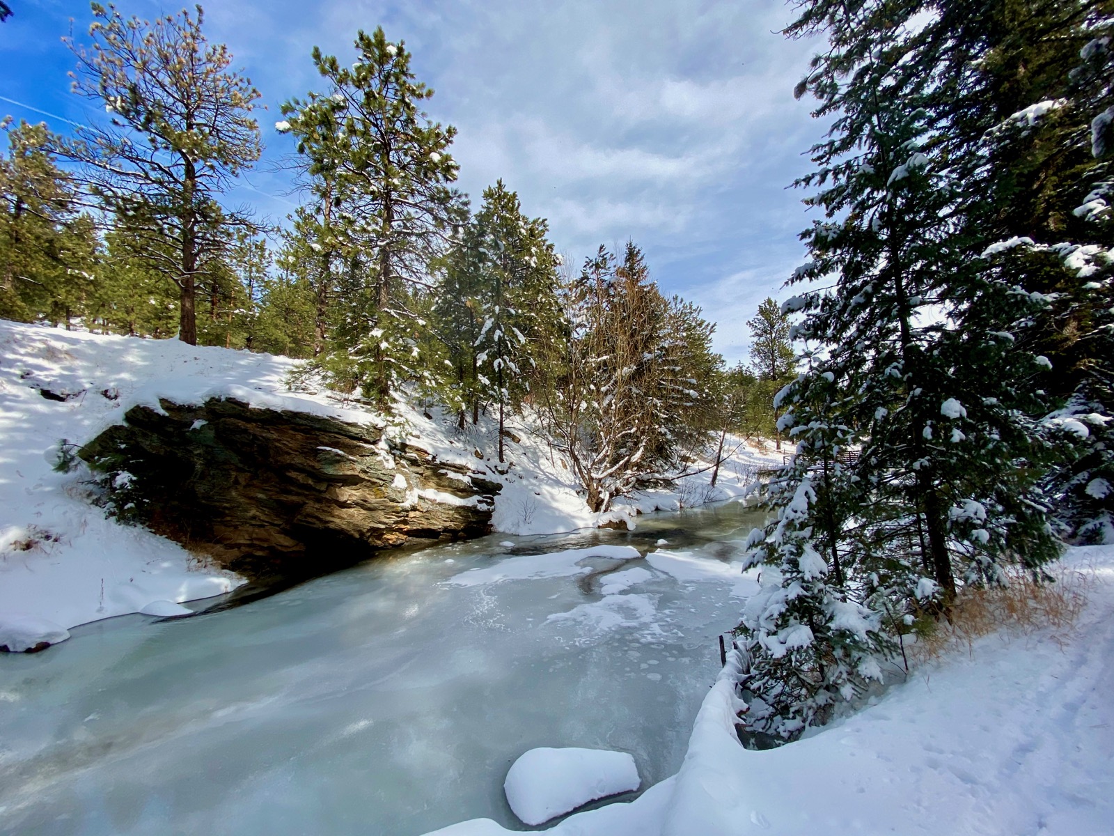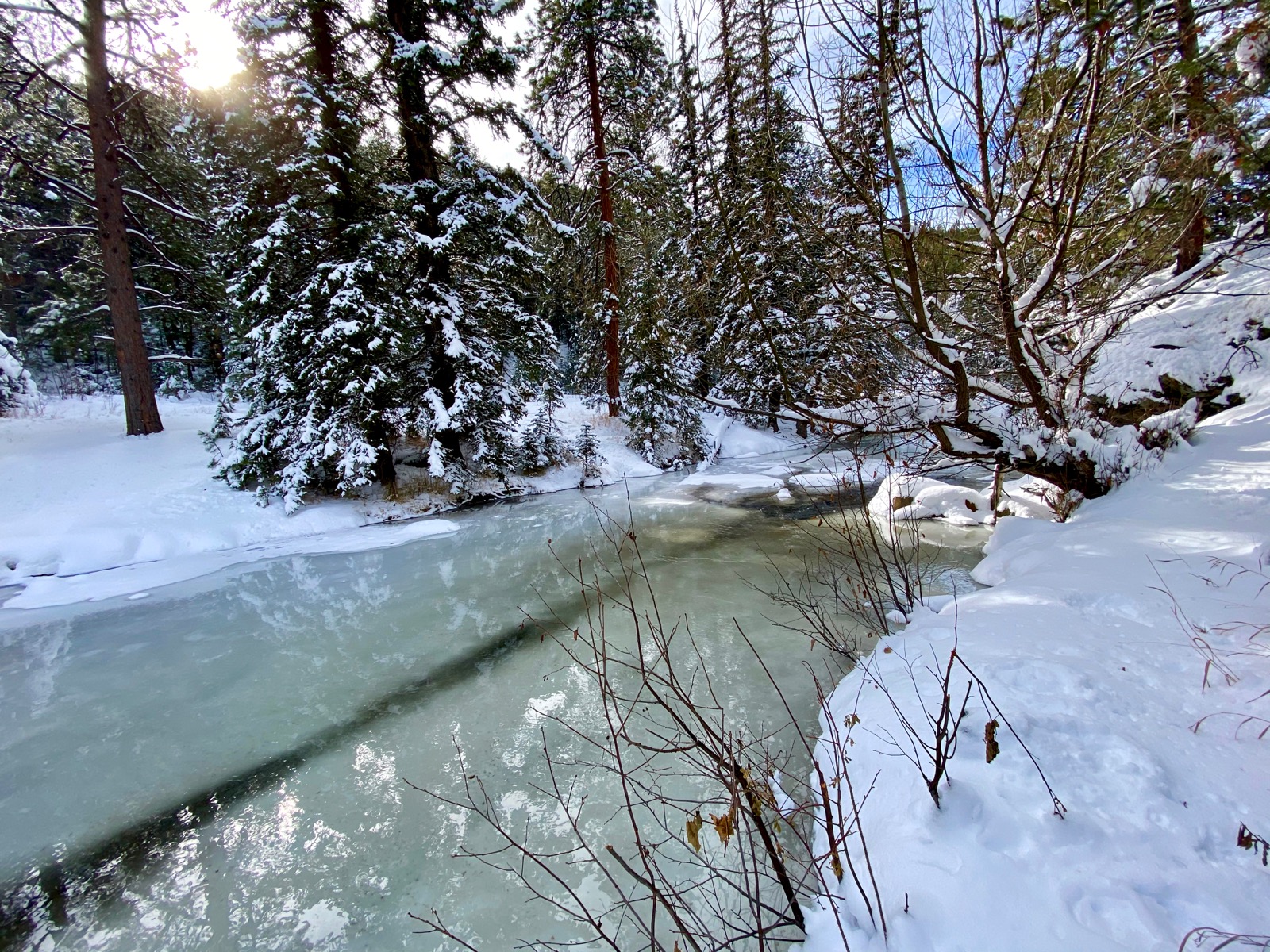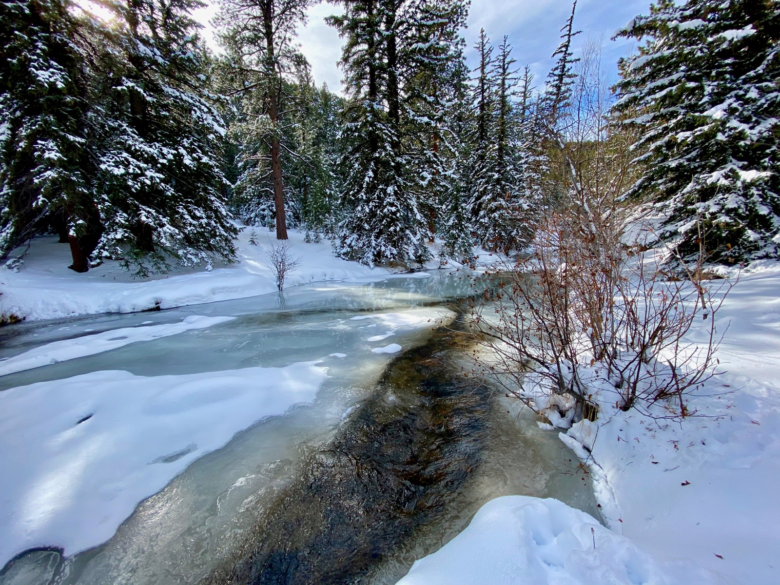 Bear Creek is a powerful force born in the big mountains so even during the harshest winters, it becomes only partially frozen. The frigid water flows persistently through a maze of turquoise ice sheets and sheer black rock.