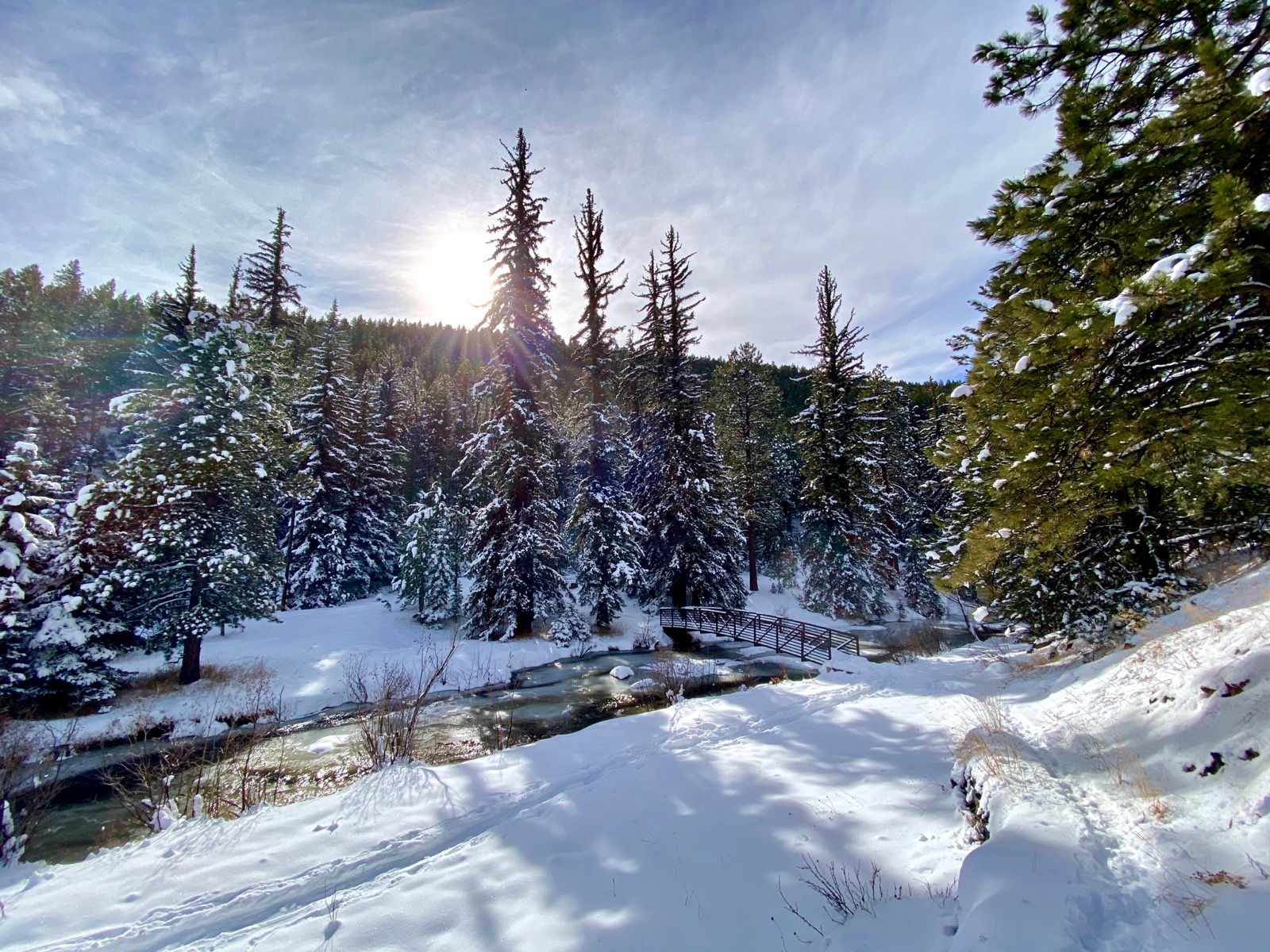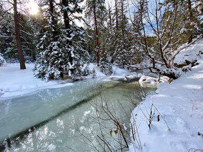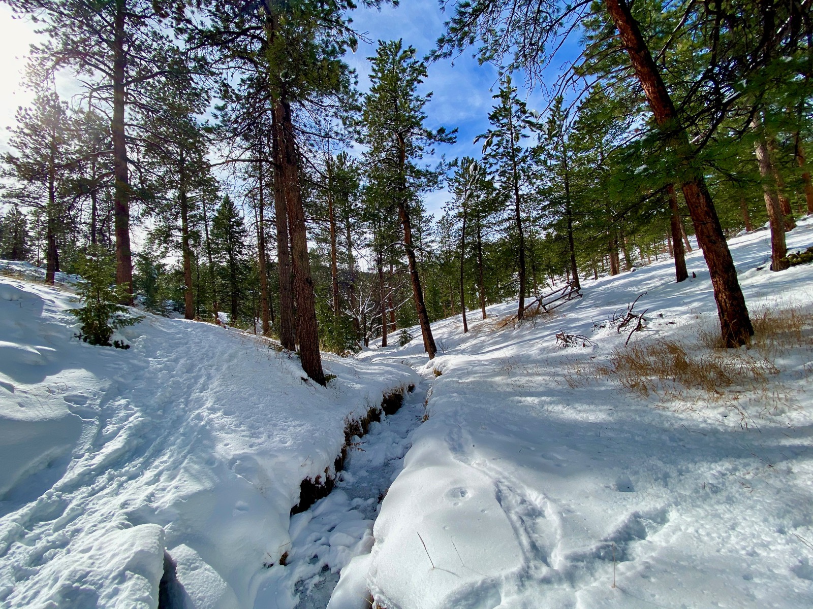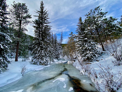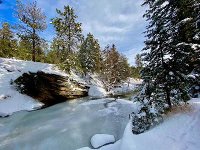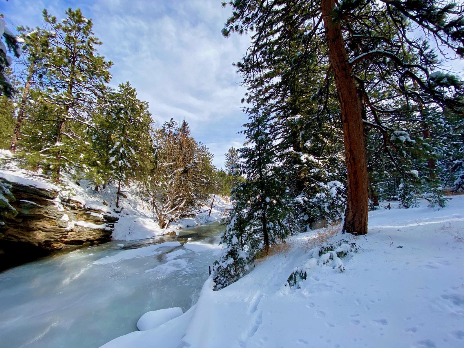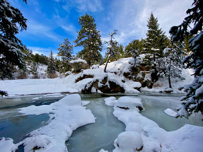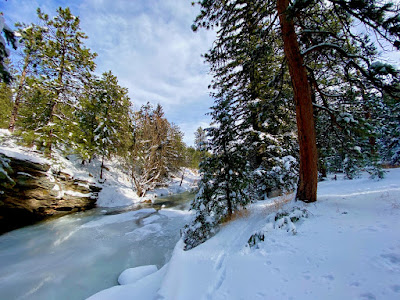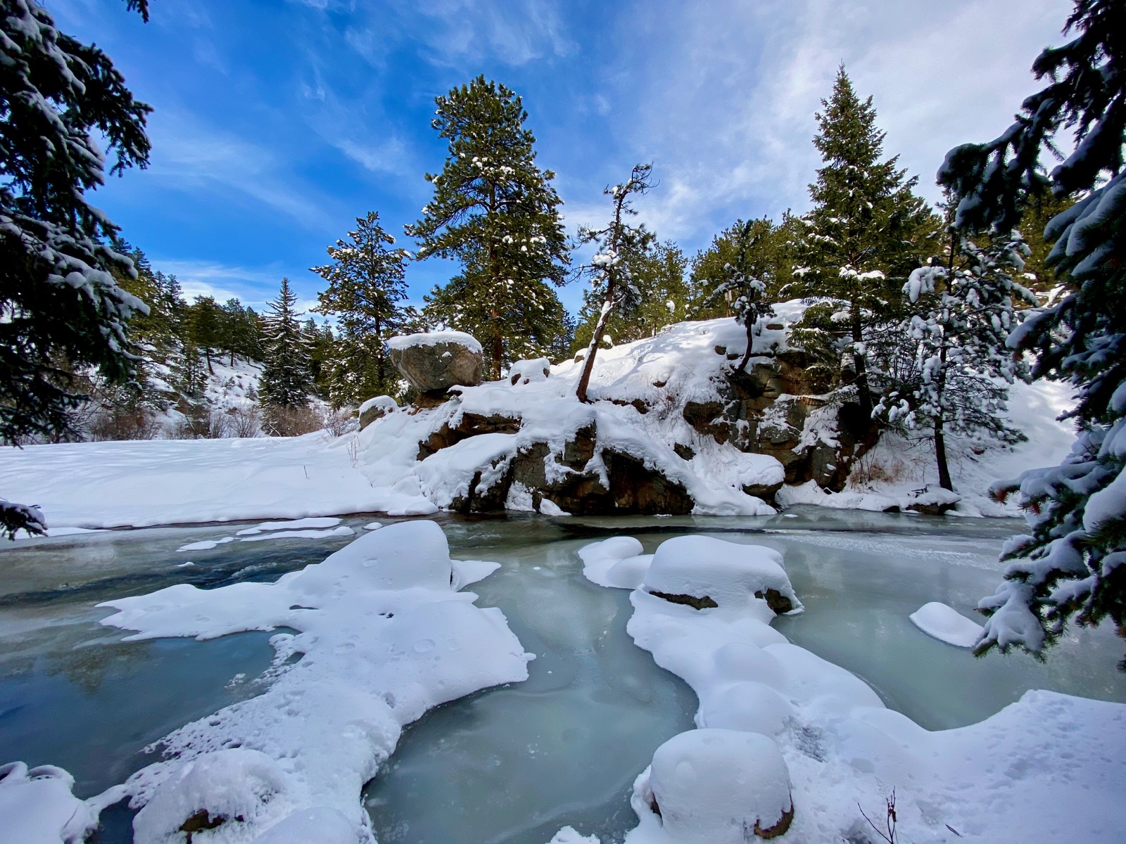 Bear Creek is a powerful force born in the big mountains so even during the harshest winters, it becomes only partially frozen. The frigid water flows persistently through a maze of turquoise ice sheets and sheer black rock.