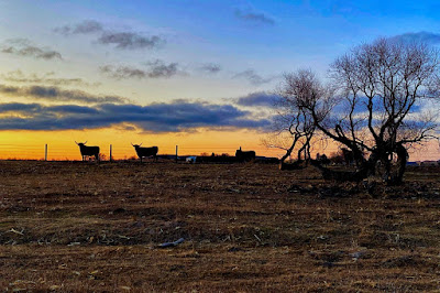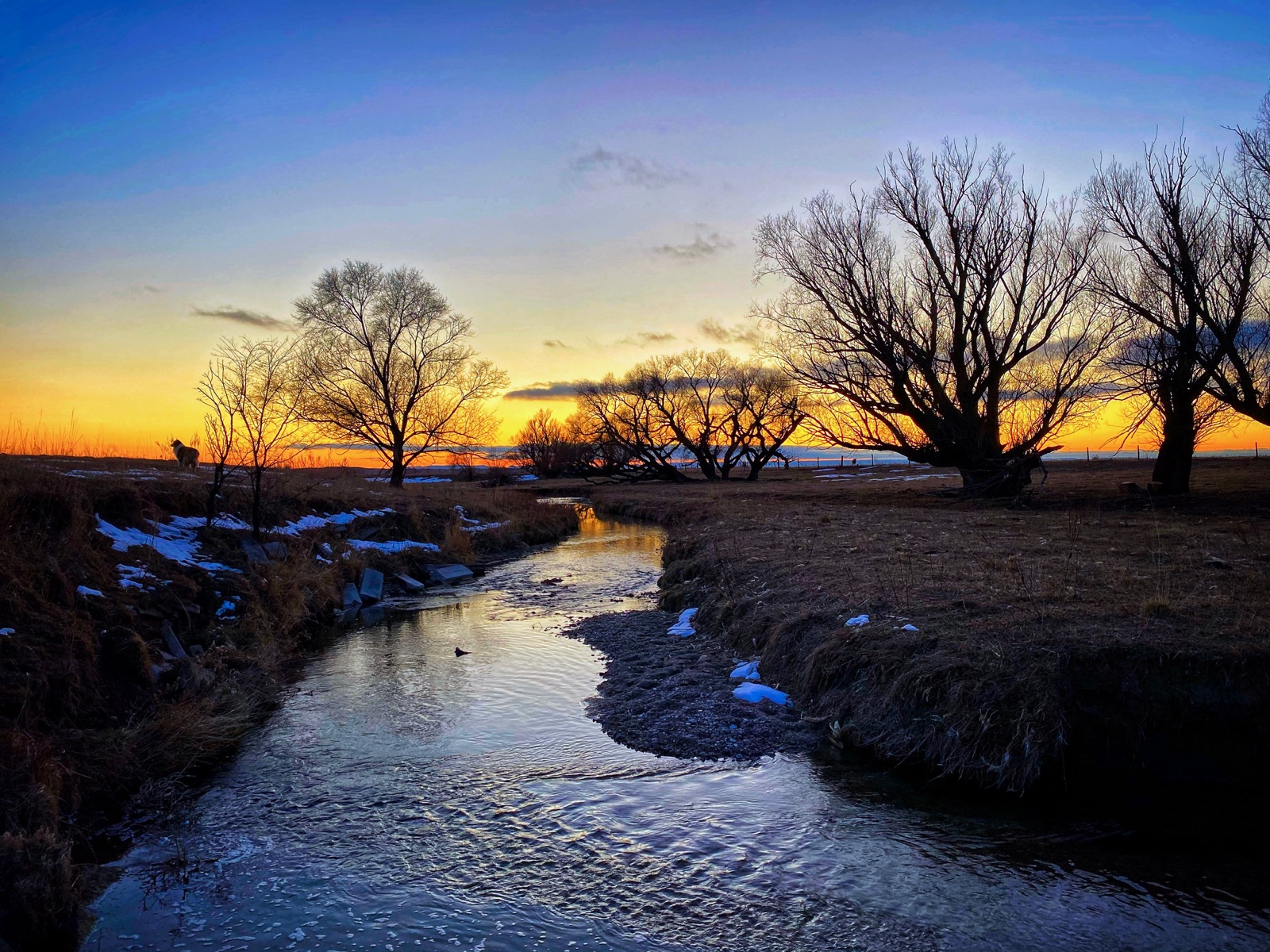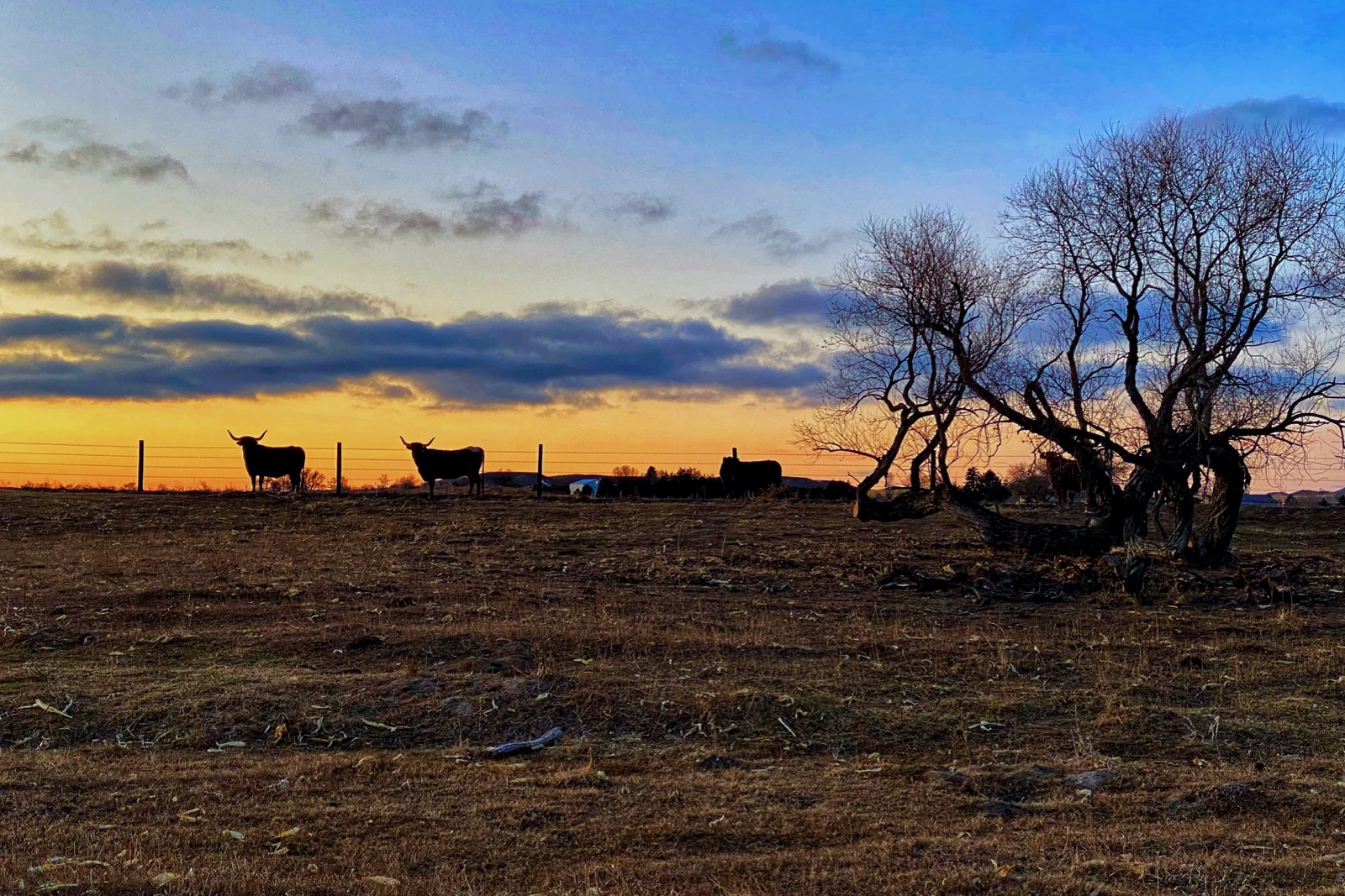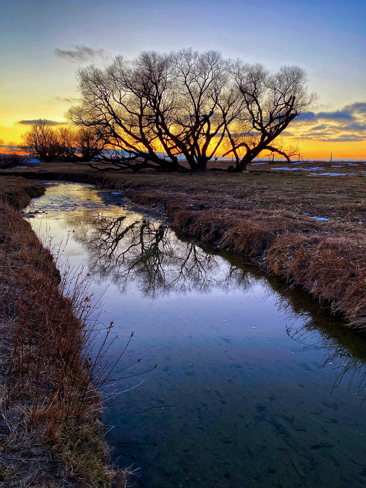 The cattle had been put out on the corn where the longhorns formed an imposing silhouette against an early sunset. The barren trees stood in stark contrast to the fading, orange light as the entire scene was faithfully reflected on the water’s glassy surface.