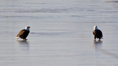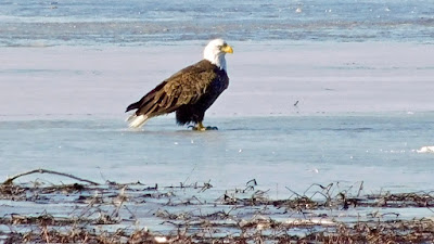 When the weather warms, the eagles become more active and social and that is when their entertaining antics are fun to watch. Big, aggressive adults steal catches from seagulls or even from one of their own while others saunter clumsily along the ice line scanning the water for food.
