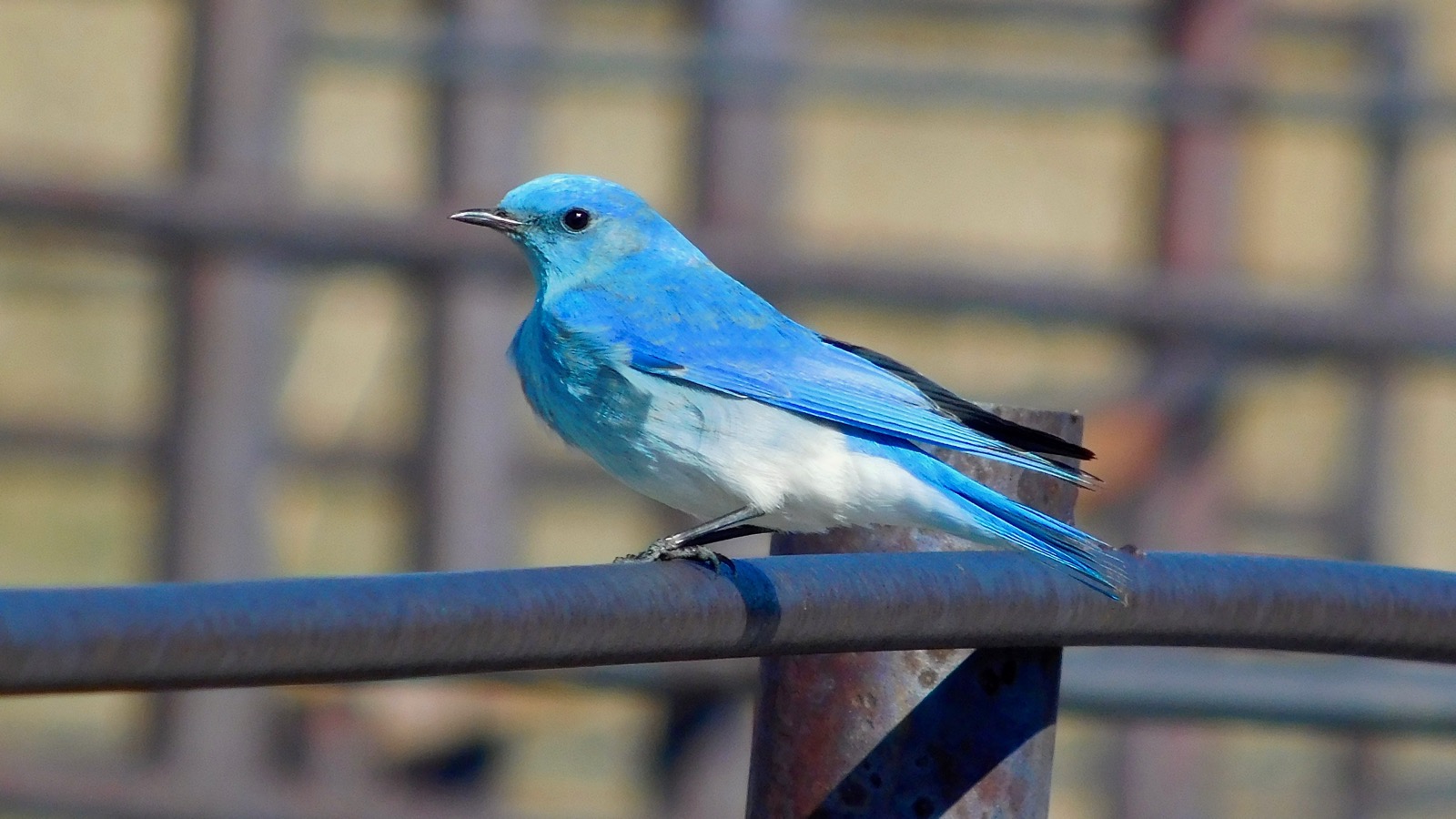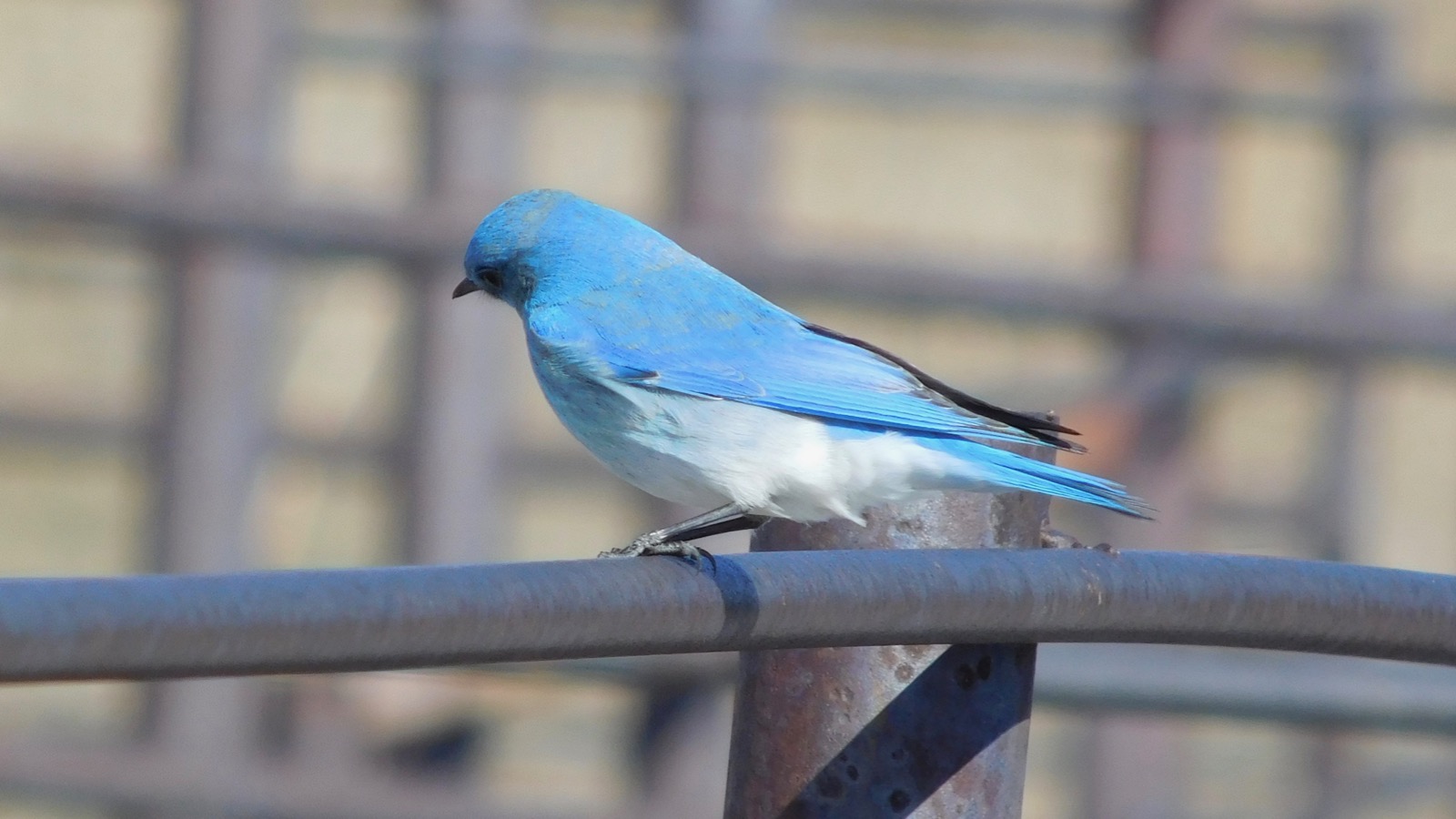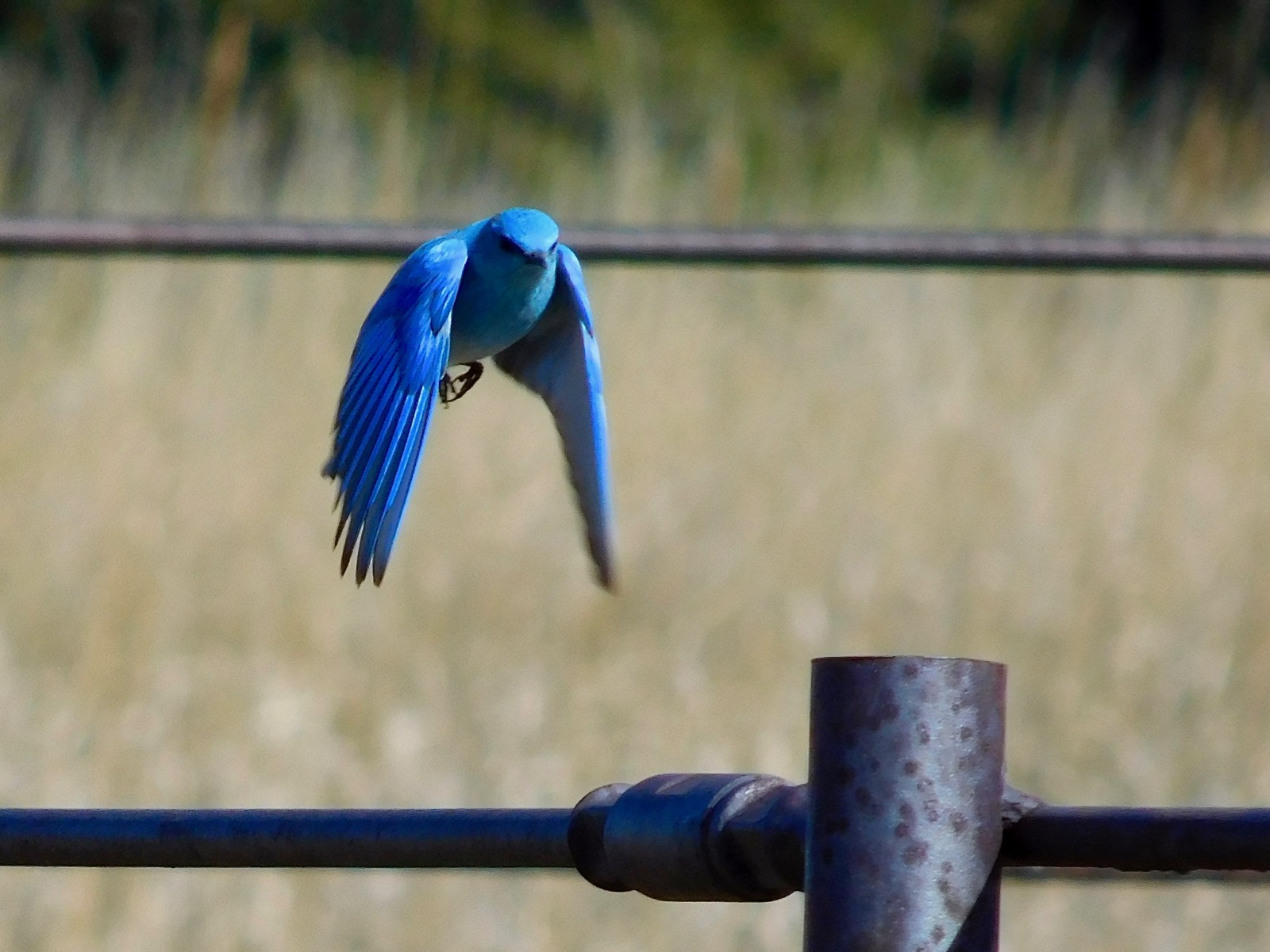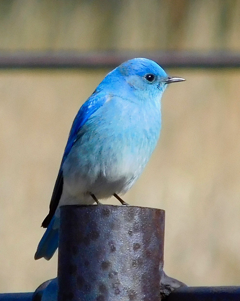 The female bluebirds have dull coloring that provides protection during the nesting season but the eligible males display bright plumage making them easy to spot. Many of the bluebirds like to congregate on the iron fence attached to an old, abandoned barn.