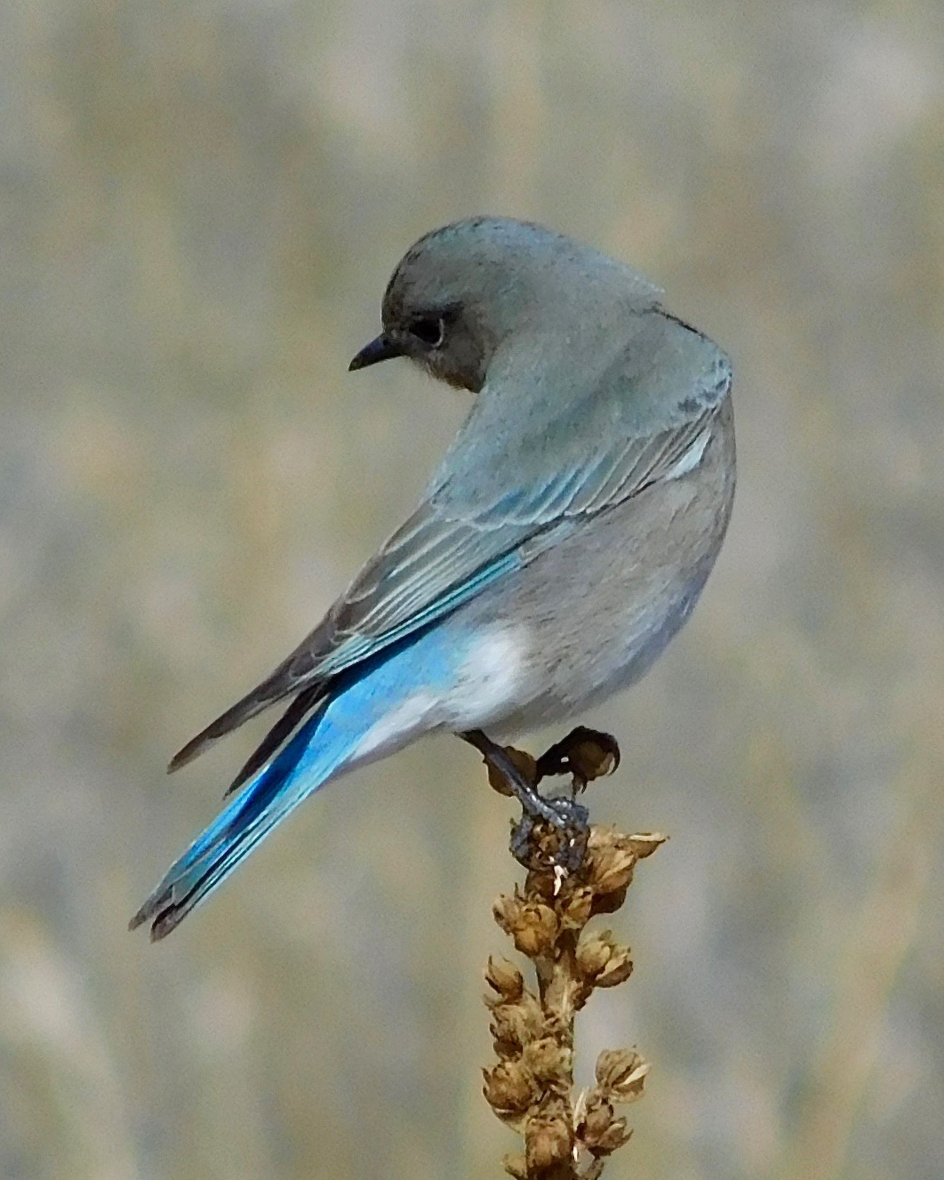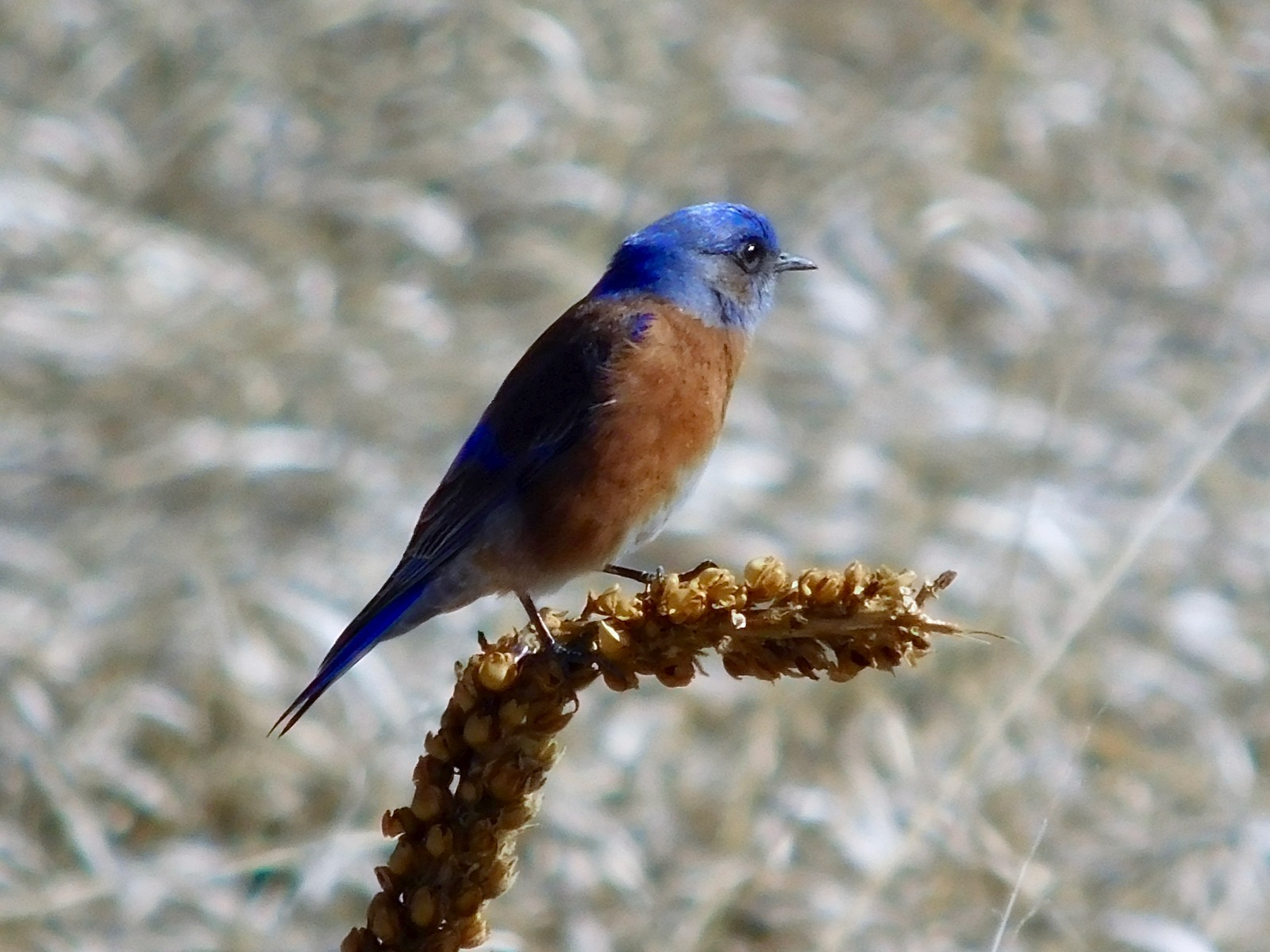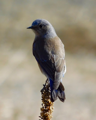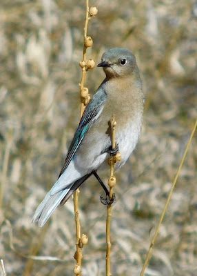 When hunting, the bluebirds perch on mullein stalks and cock their heads sideways while listening for prey. Once they have acquired a target, they swoop down to the ground and pluck a juicy earthworm from the moist soil.