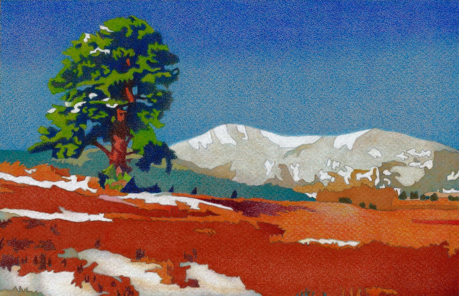 Cast as the center of interest, a ponderosa pine creates a striking profile against a backdrop of open air. It’s curving, crimson trunk is topped by a bright green canopy whose beautiful blue shadows melt into the heavens.