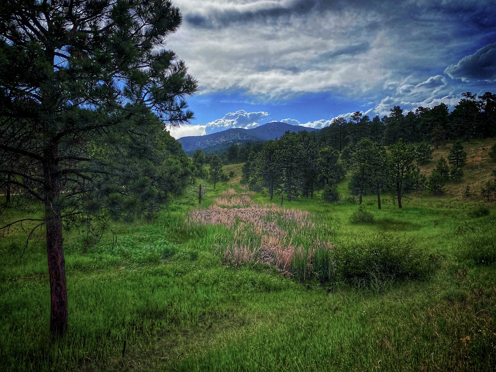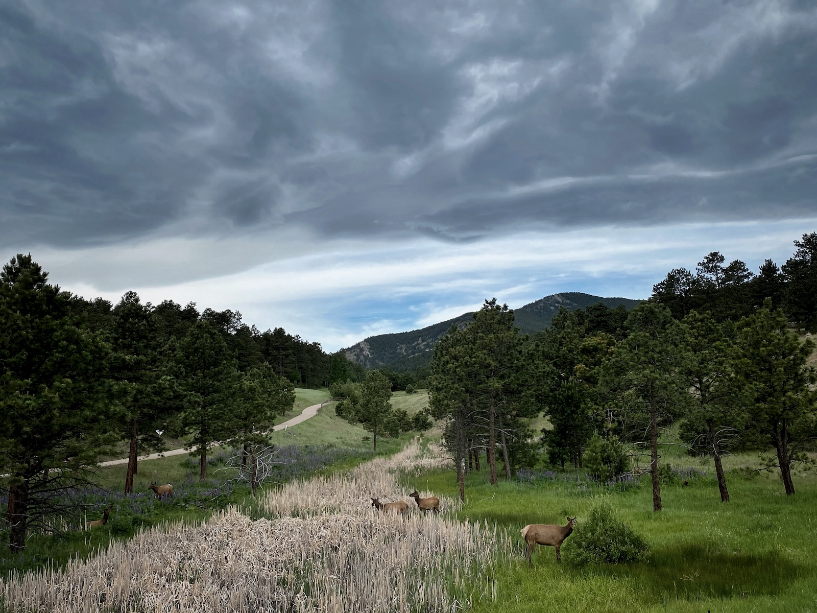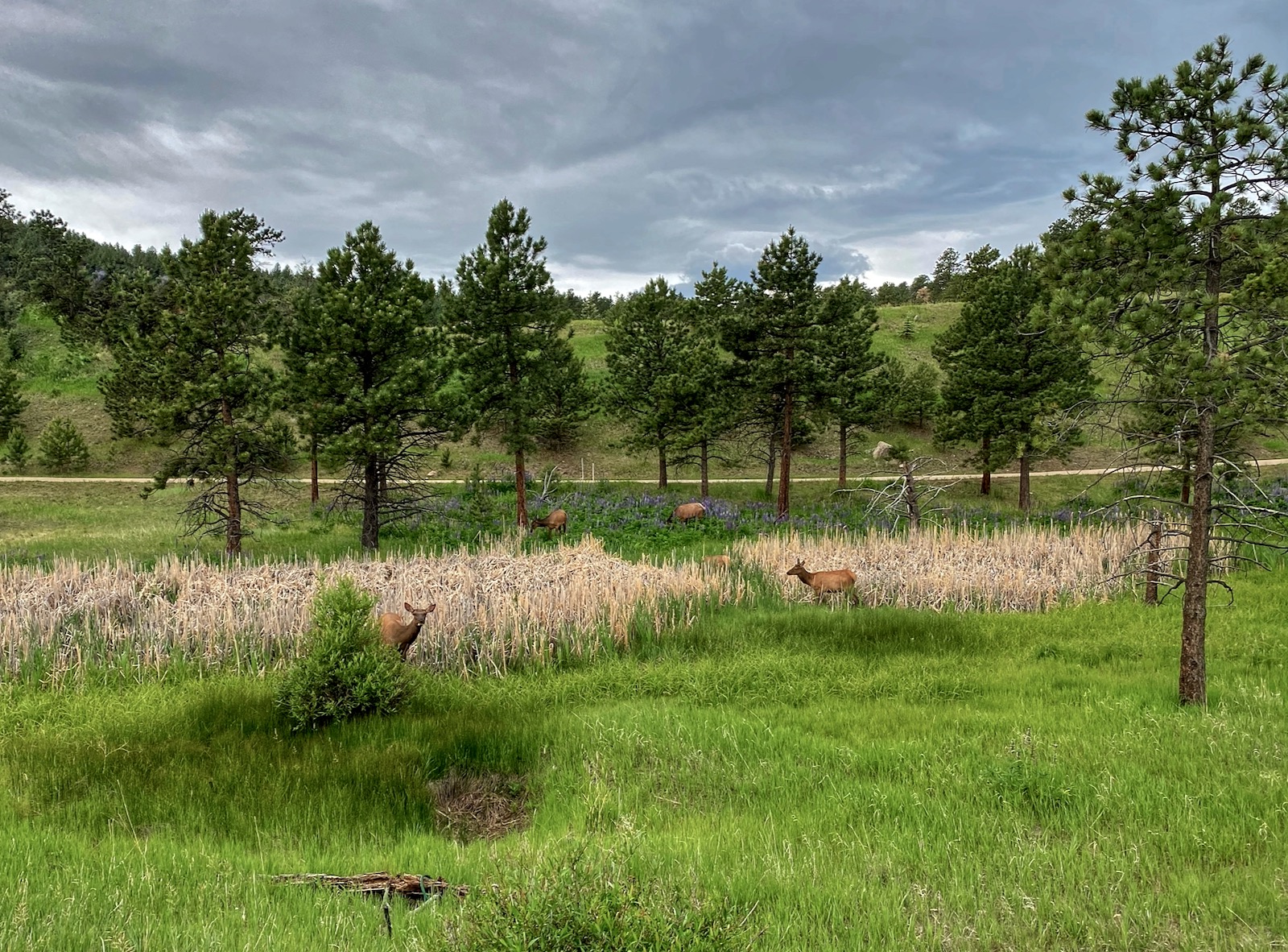 Settled below the southern slopes of Bergen Peak, Bergen Gulch is a discreet wetland that supports flowers, birds and wildlife. This time of year the cattails are beginning to ripen and the lupine are in full bloom so blackbirds and elk engage in a territorial dispute over the bountiful land.
