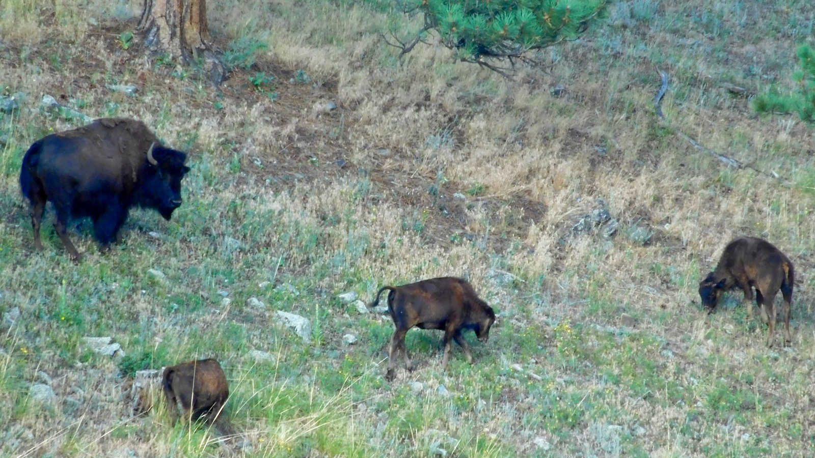 They are reddish-orange at birth but their coloring gradually deepens in concert with the development of their fierce independence. On this warm summer evening, the different individuals engage in various behaviors such as resting, grazing and rock climbing.