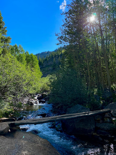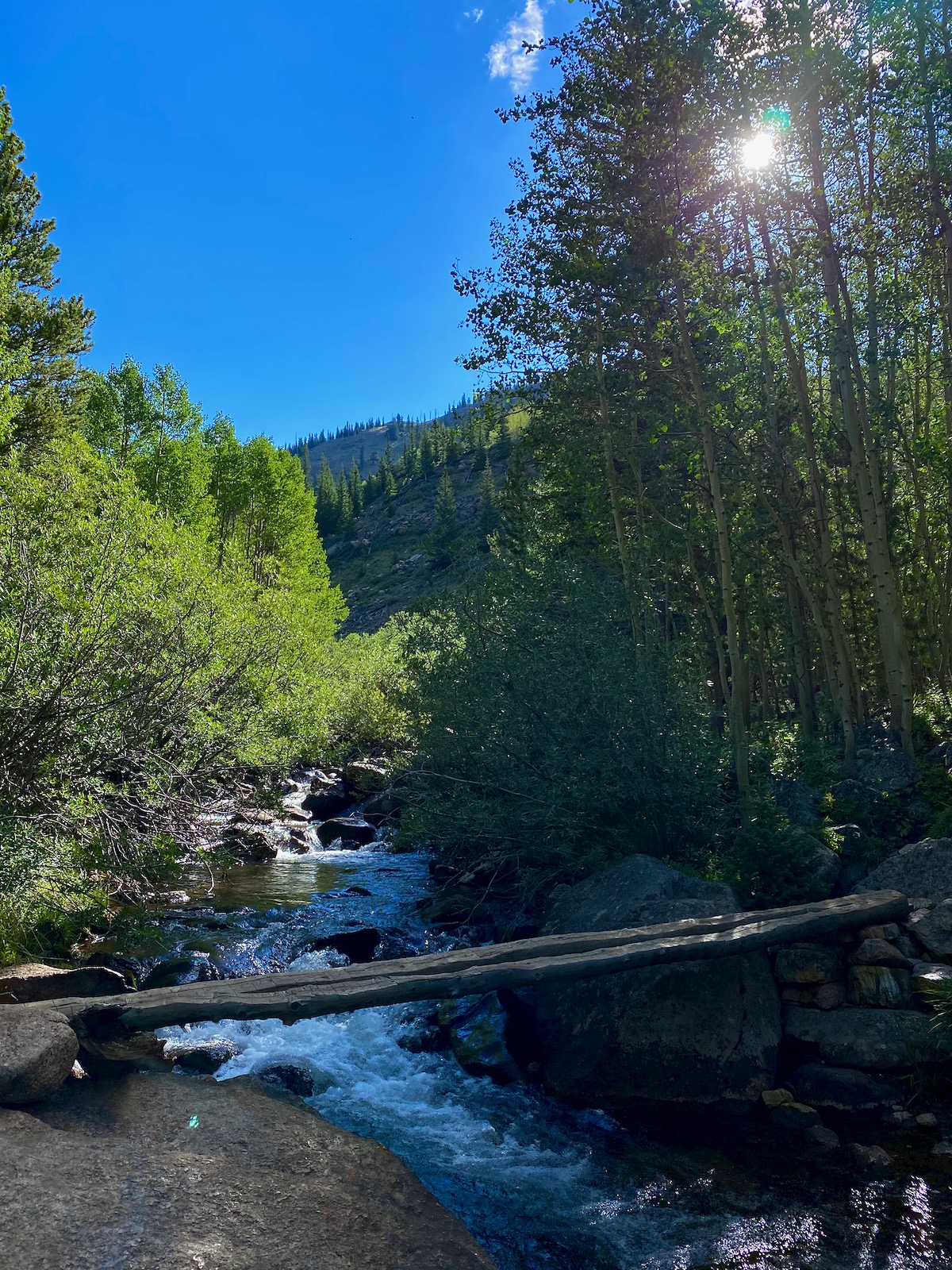 During the descent, light rain comes down as well - offering some relief from the unusually unbearable heat in the high country. Following a brisk creek out of the big valley, numerous, single-log bridges are perilous crossings bringing us closer to home.