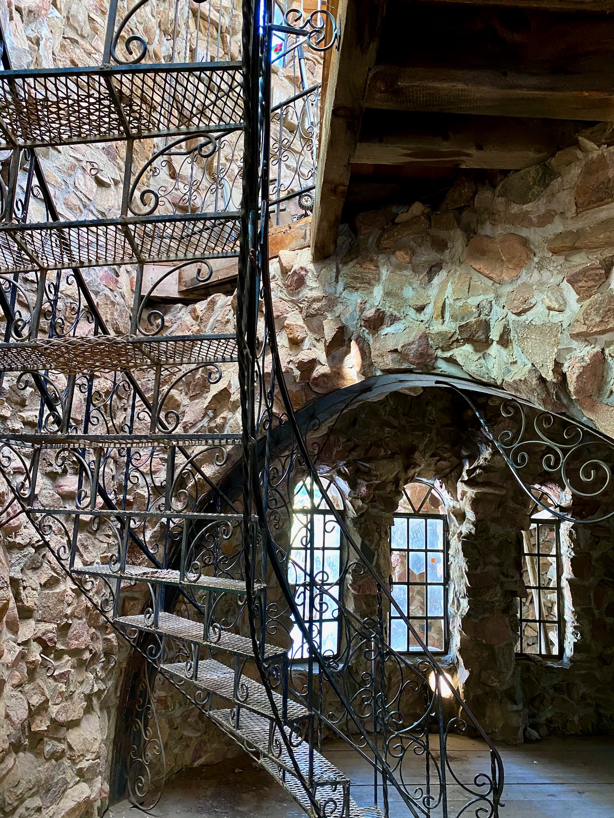 The scary keep is designed to shoot straight skyward as a labyrinth of stone and iron ascends to dizzying heights. Not for the faint of heart, a strenuous climb up a spiral staircase is required to reach the summit of this monster house.