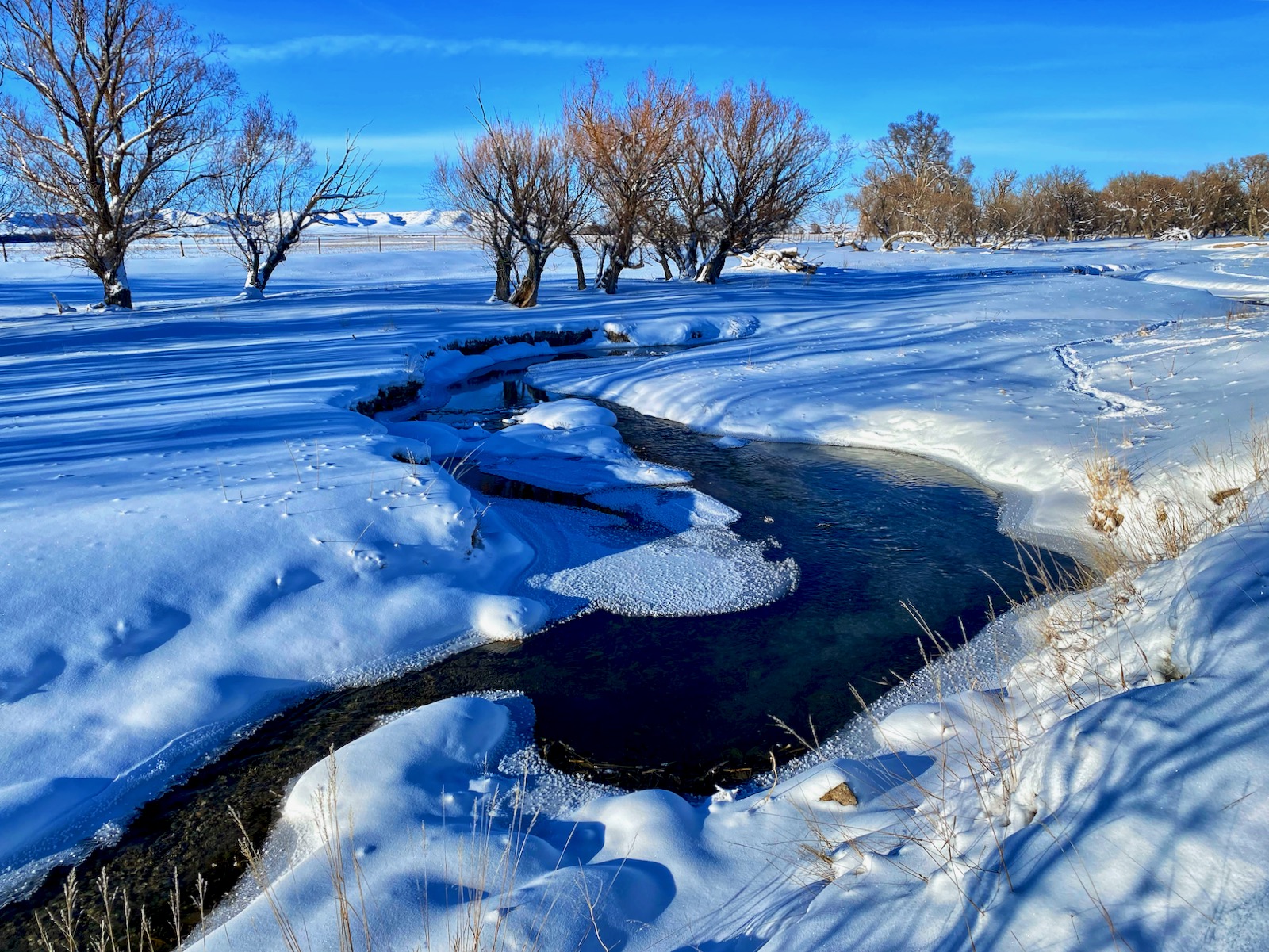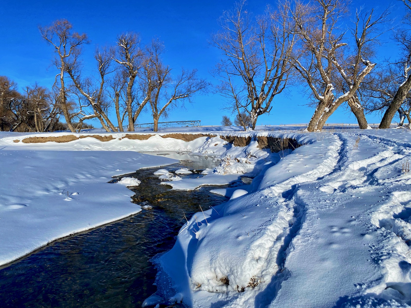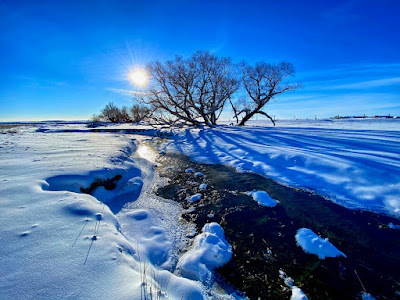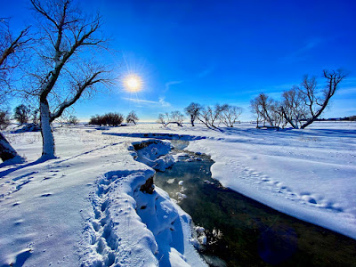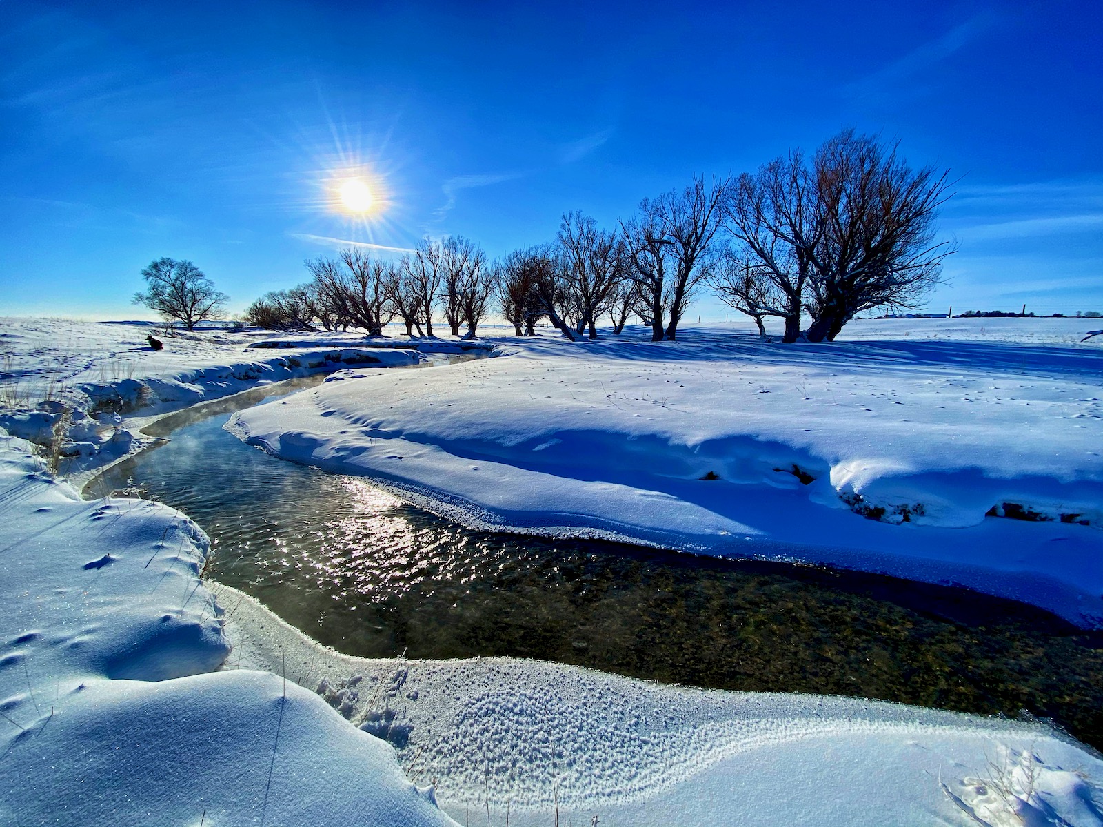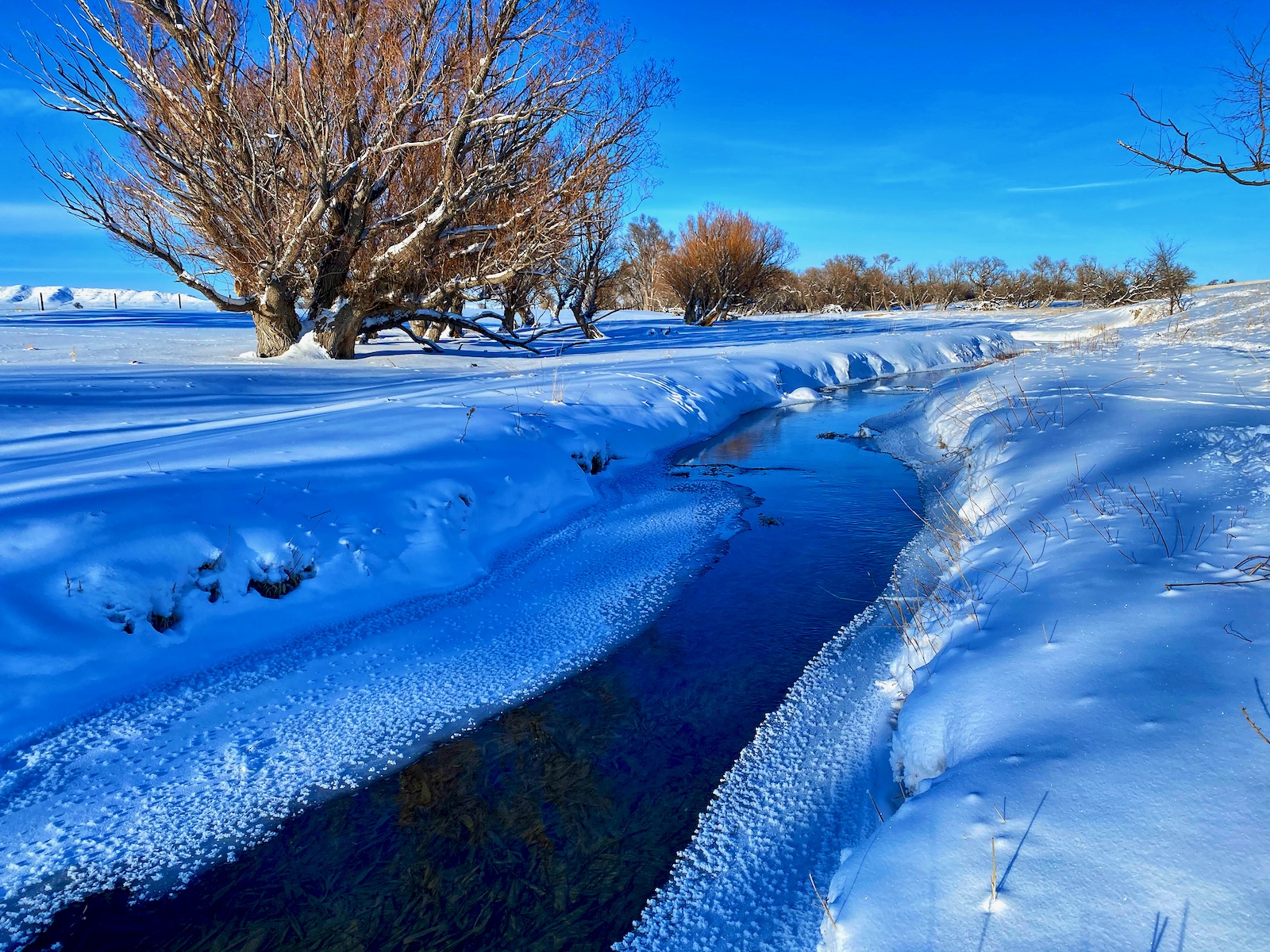 The intense storm has cleared out but even a dazzling sun can’t warm up the cushion of cold air that has filled the void left behind. The stream of transparent indigo flows in a series of sharp s-curves through a vast country of desolation. Life on the prairie is hard.
