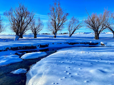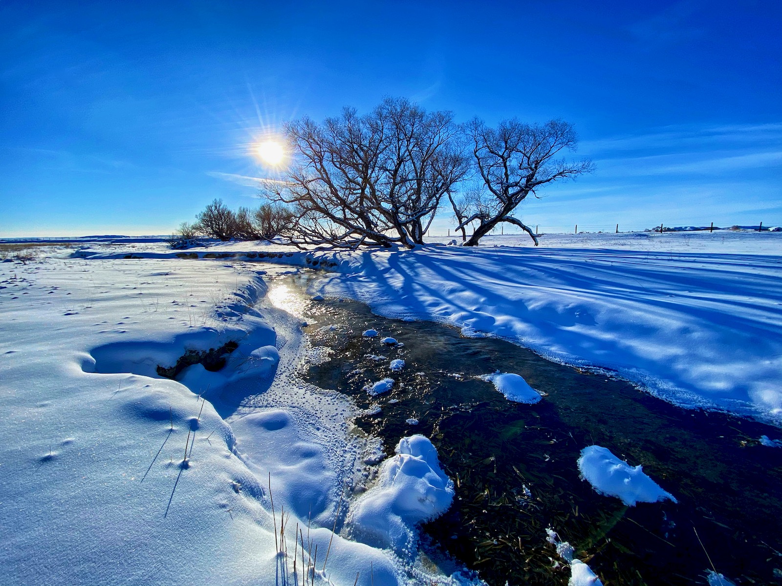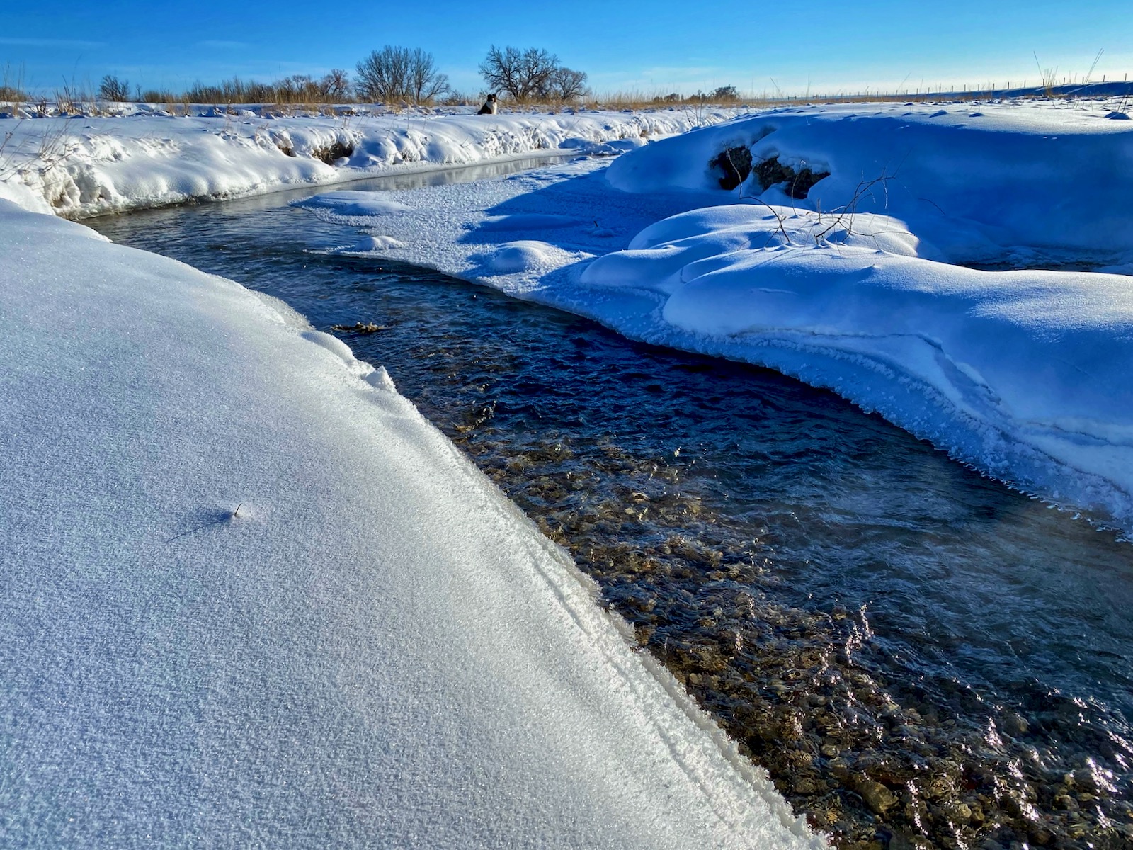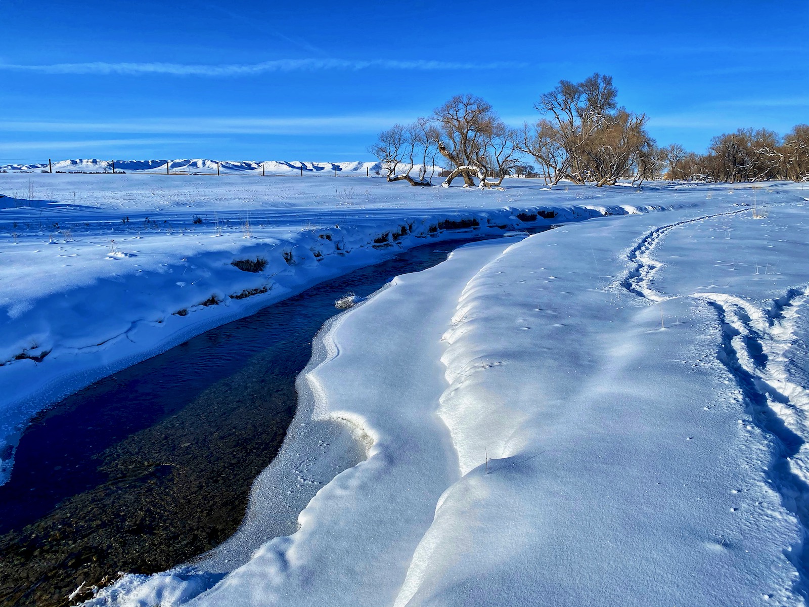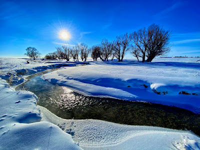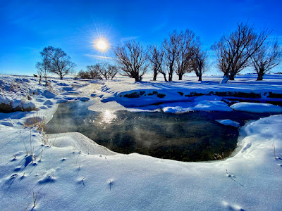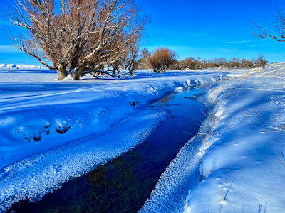 The intense storm has cleared out but even a dazzling sun can’t warm up the cushion of cold air that has filled the void left behind. The stream of transparent indigo flows in a series of sharp s-curves through a vast country of desolation. Life on the prairie is hard.