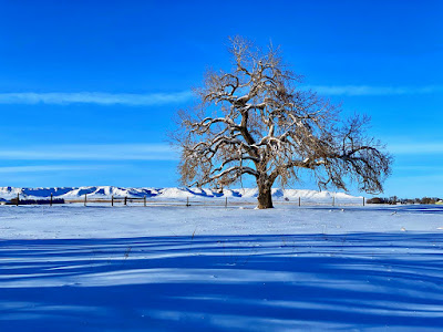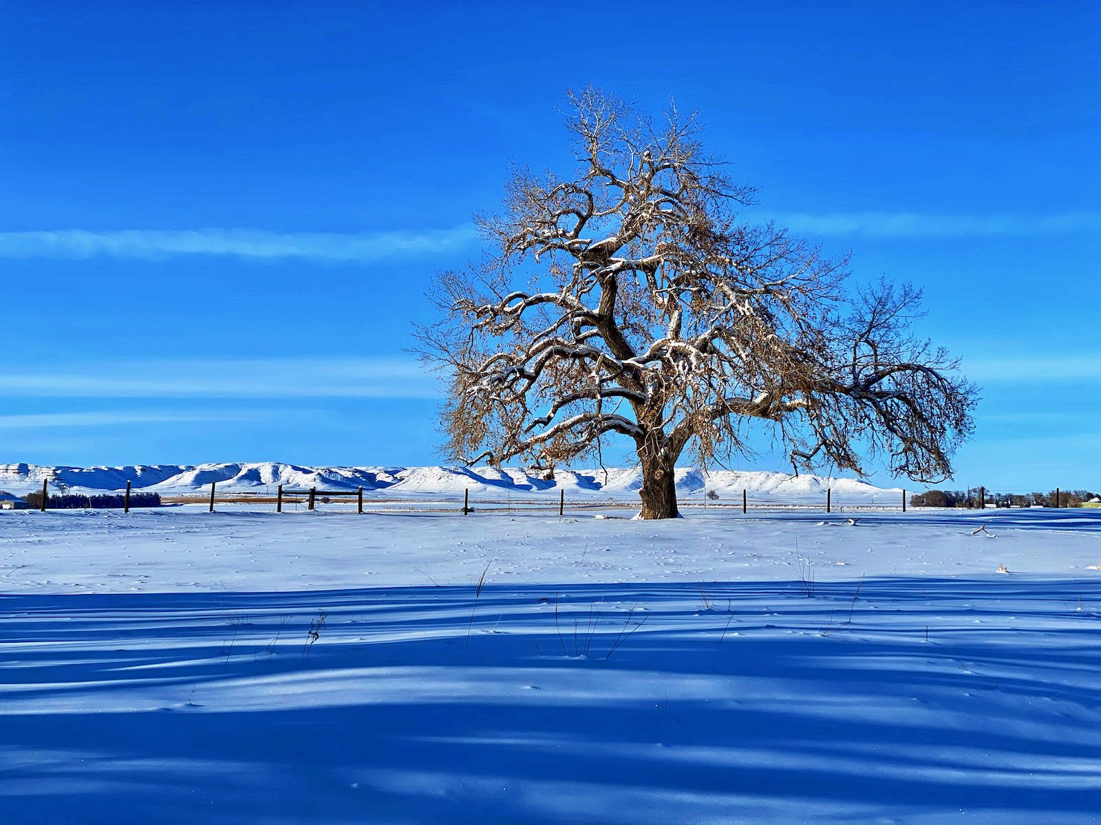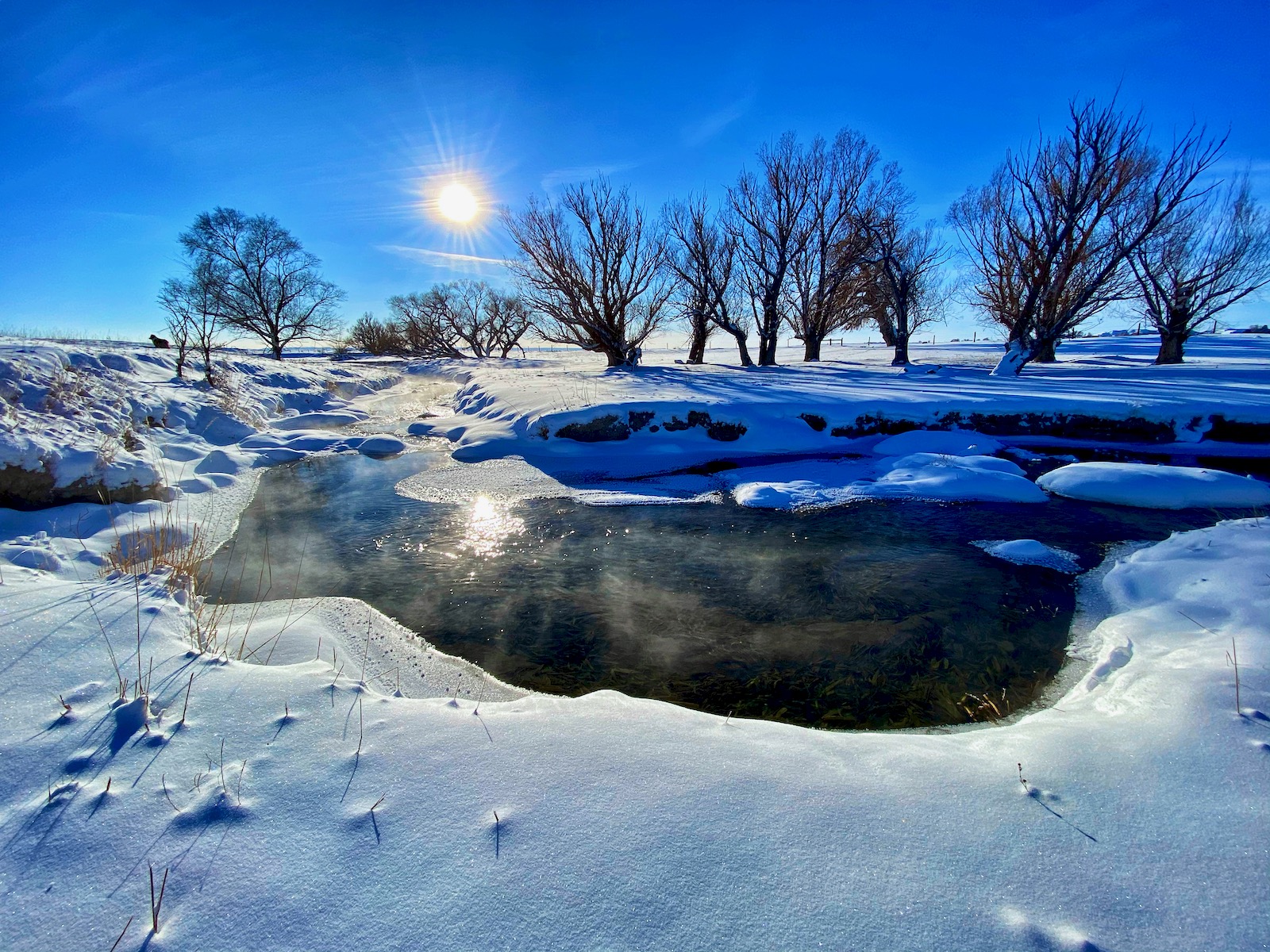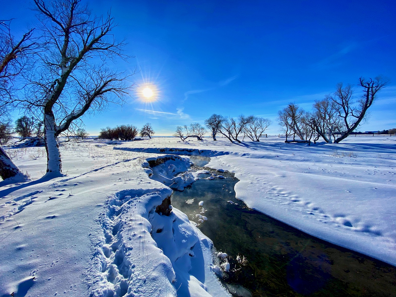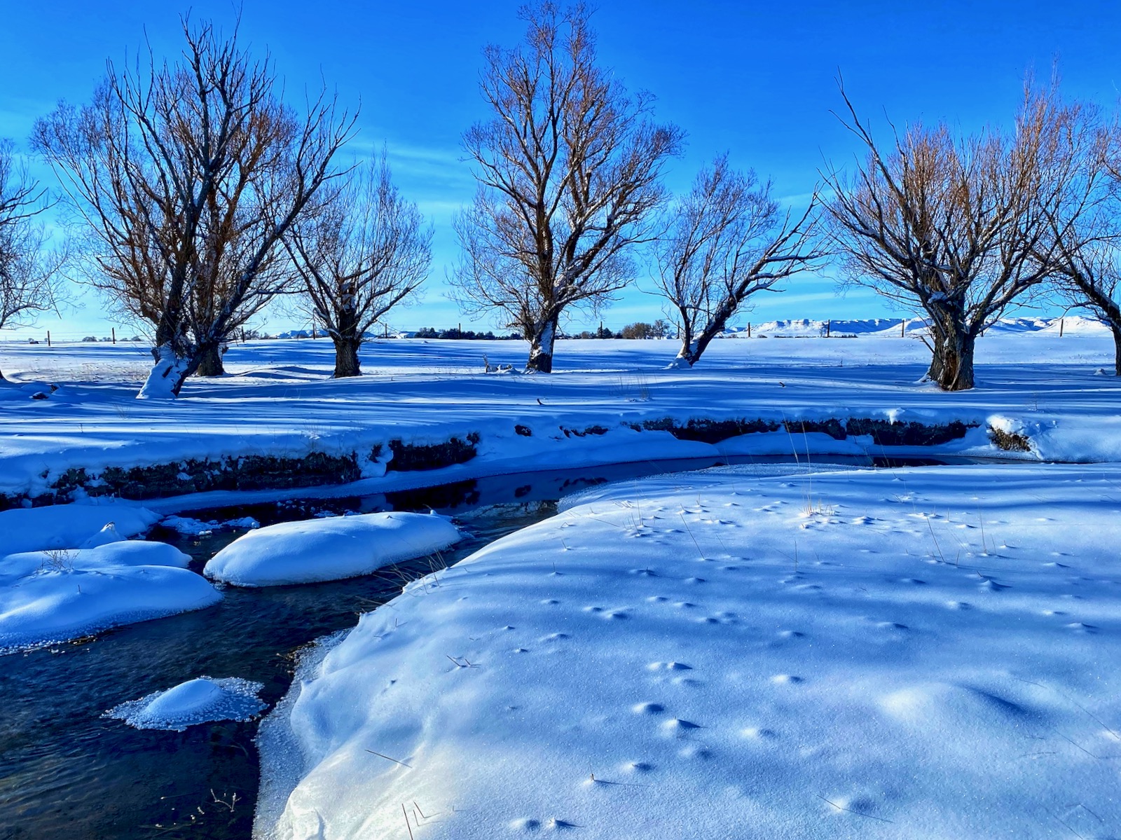 The intense storm has cleared out but even a dazzling sun can’t warm up the cushion of cold air that has filled the void left behind. The stream of transparent indigo flows in a series of sharp s-curves through a vast country of desolation. Life on the prairie is hard.