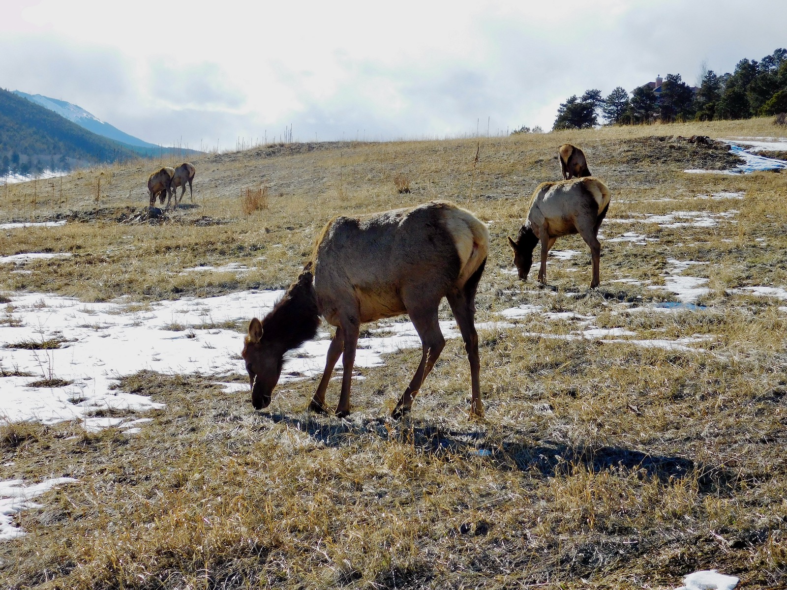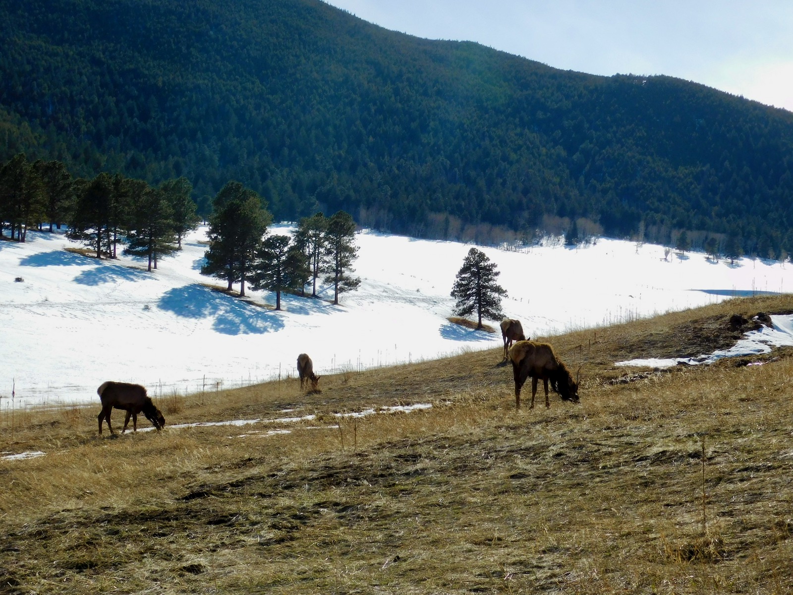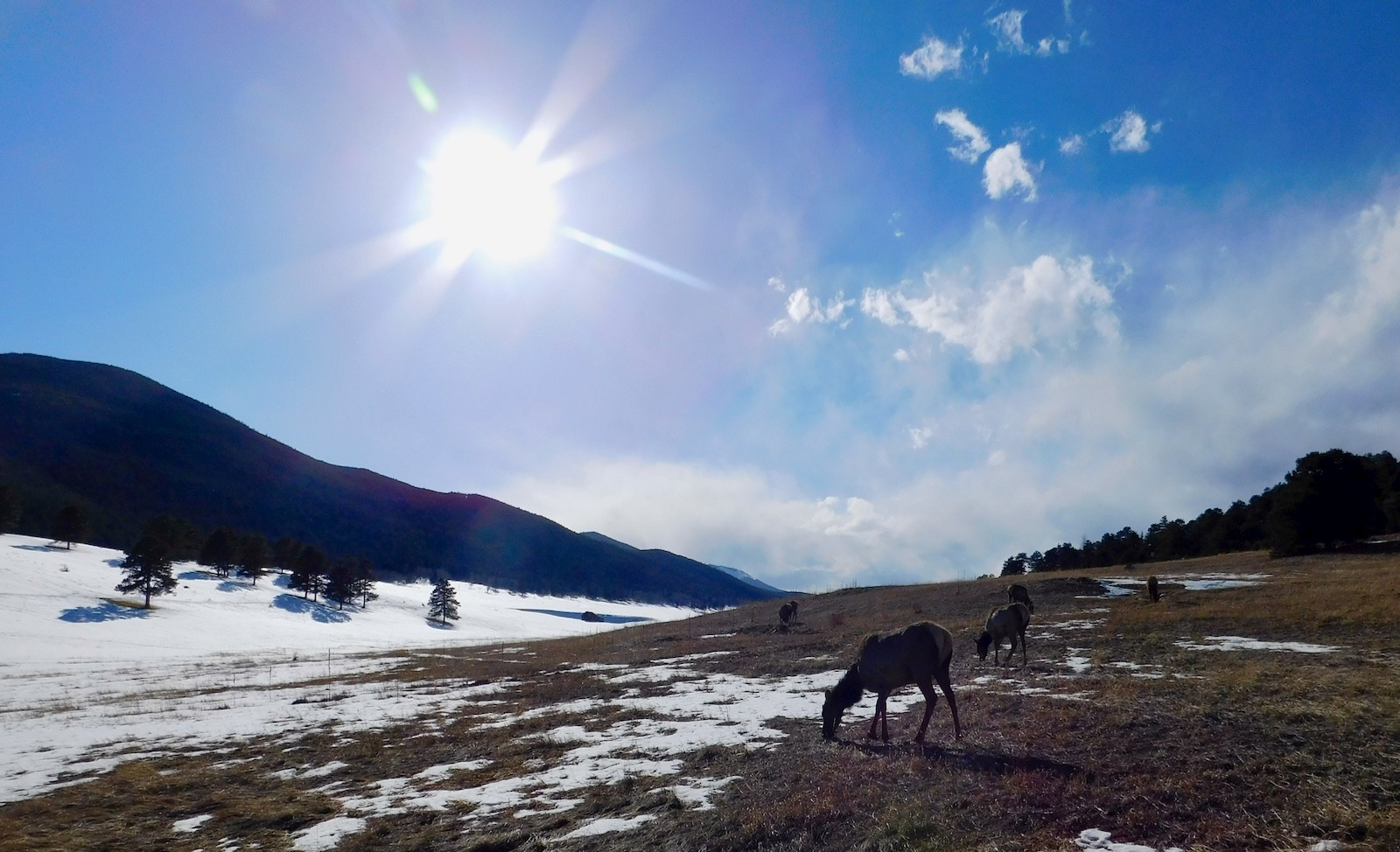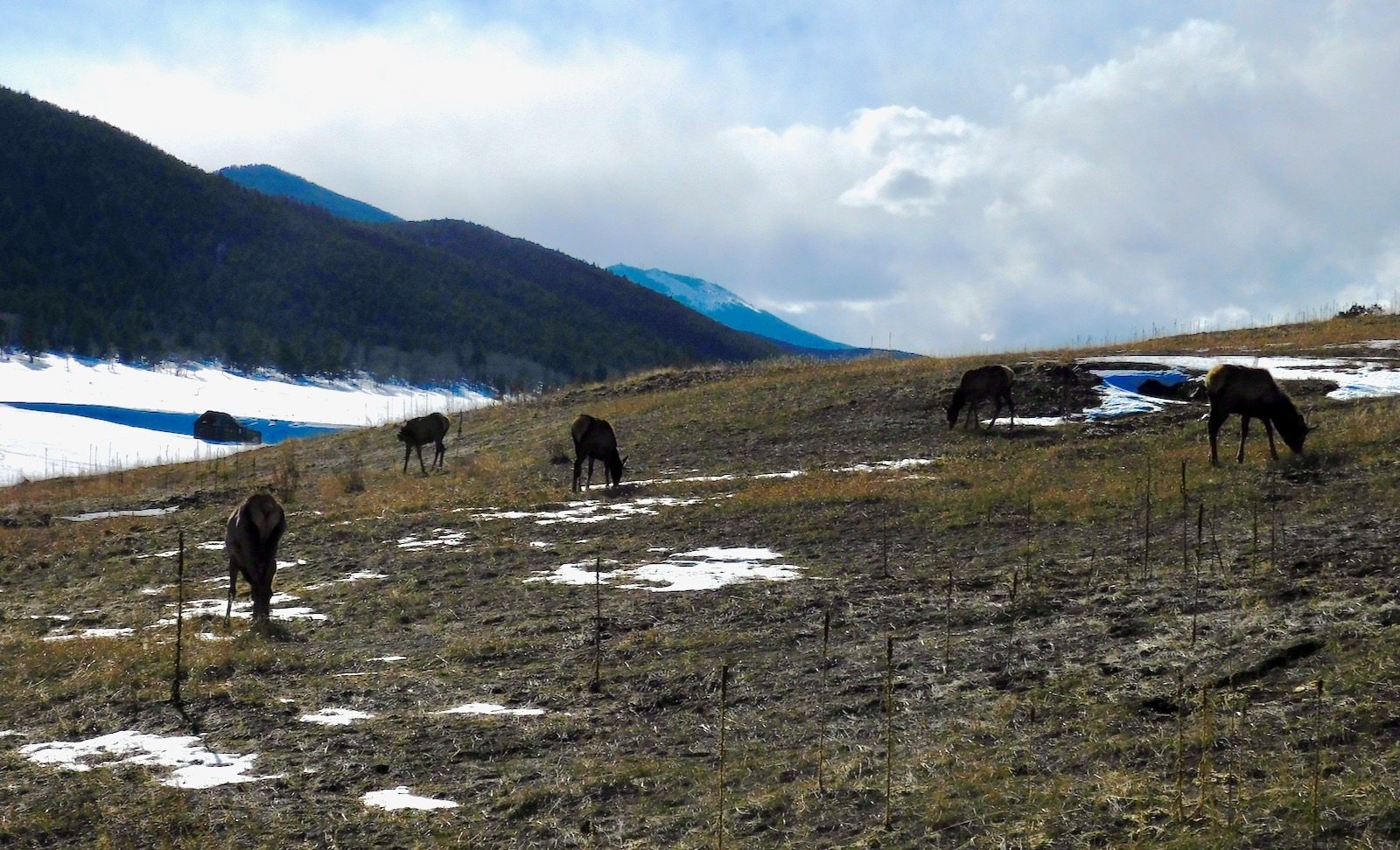 It’s a crisp spring evening and a modest herd of scraggly elk has emerged from the woodland to forage in the meadow. The sun’s rays are strained through a thin veil of clouds creating a milky haze that softens sharp edges.
