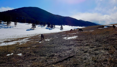 Intermingled with the furry, brown beasts is a flock of mountain bluebirds who sweep about nervously, their plumage glowing brightly in the low light. It’s an idyllic scene emanating tranquility and the spirit of optimism as this new season cautiously begins.