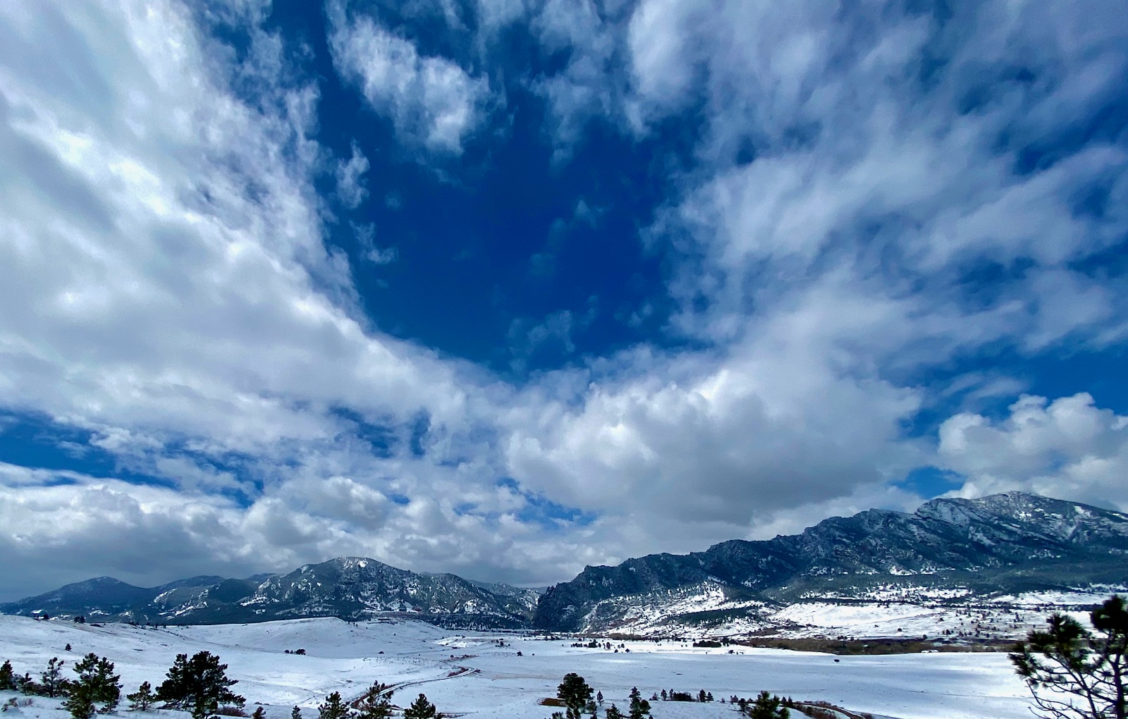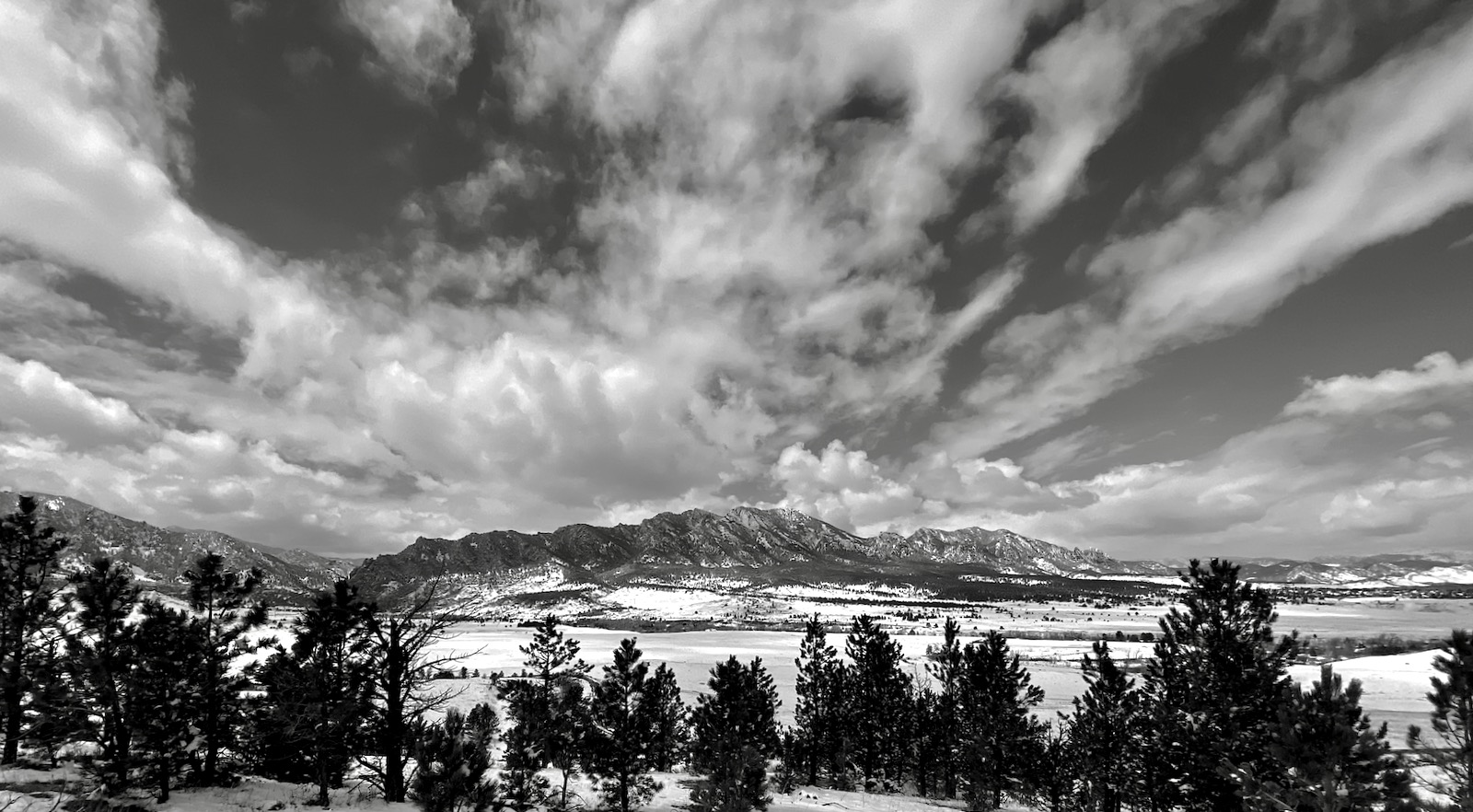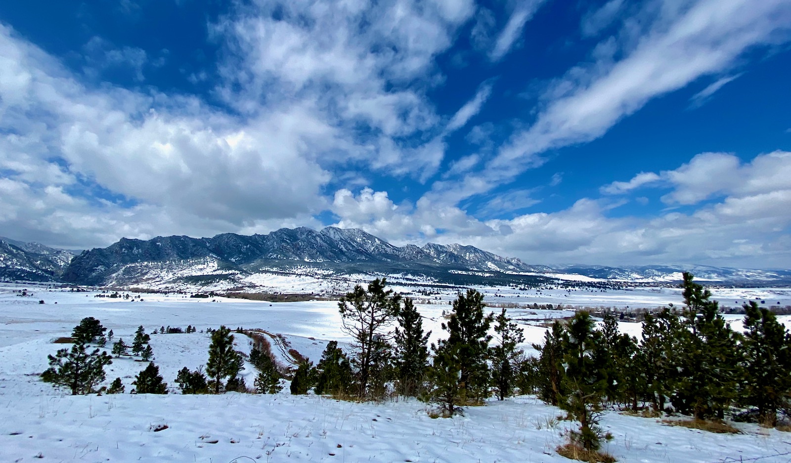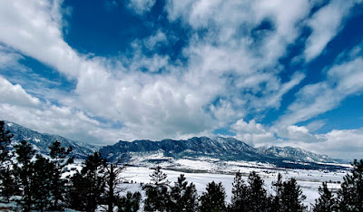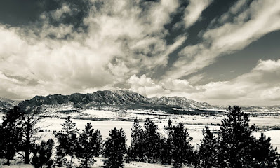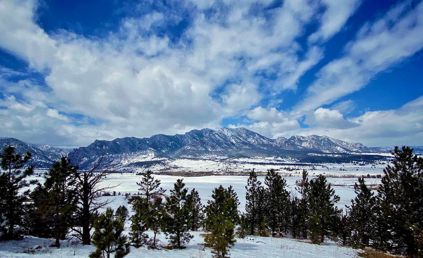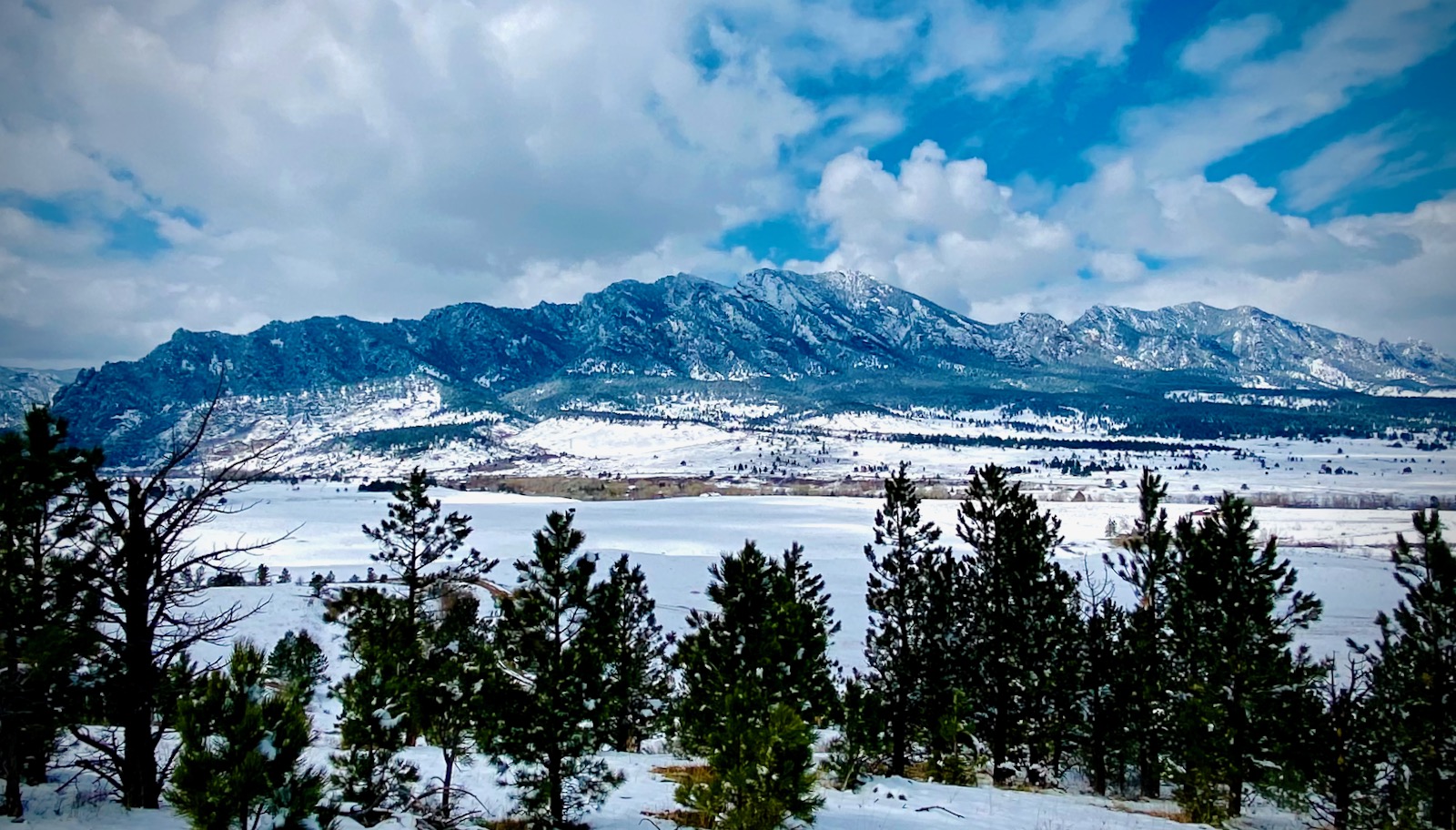 After a seemingly endless week of bitter cold and unrelenting snow, the fog has lifted revealing a pristine landscape plastered with white powder. Seen from a lofty overlook, Boulder’s mighty Flatirons glitter beautifully in the late morning light.