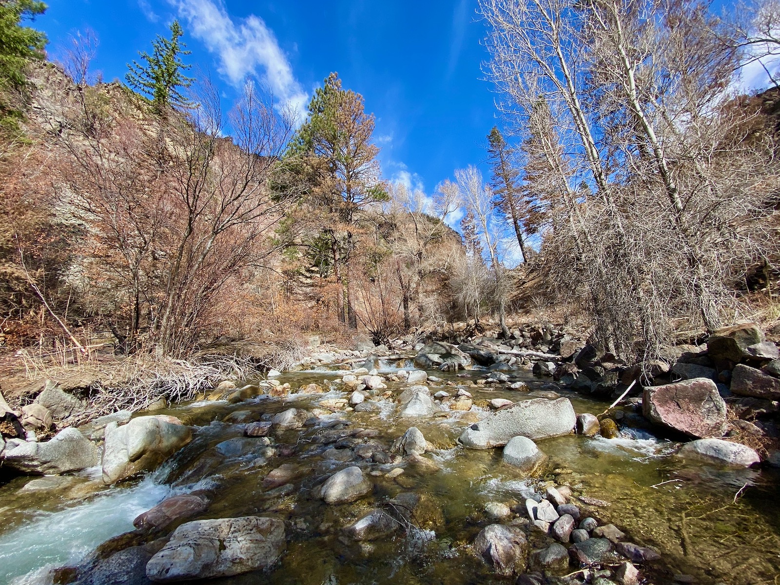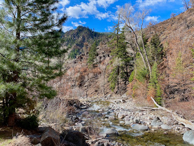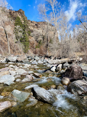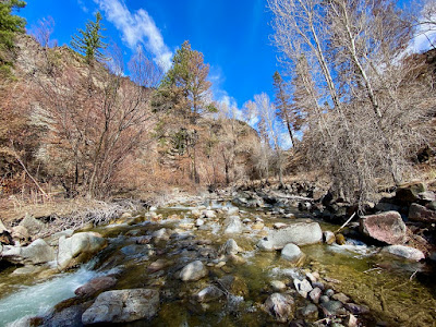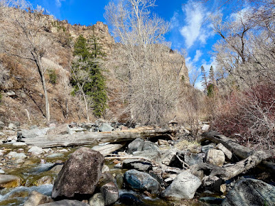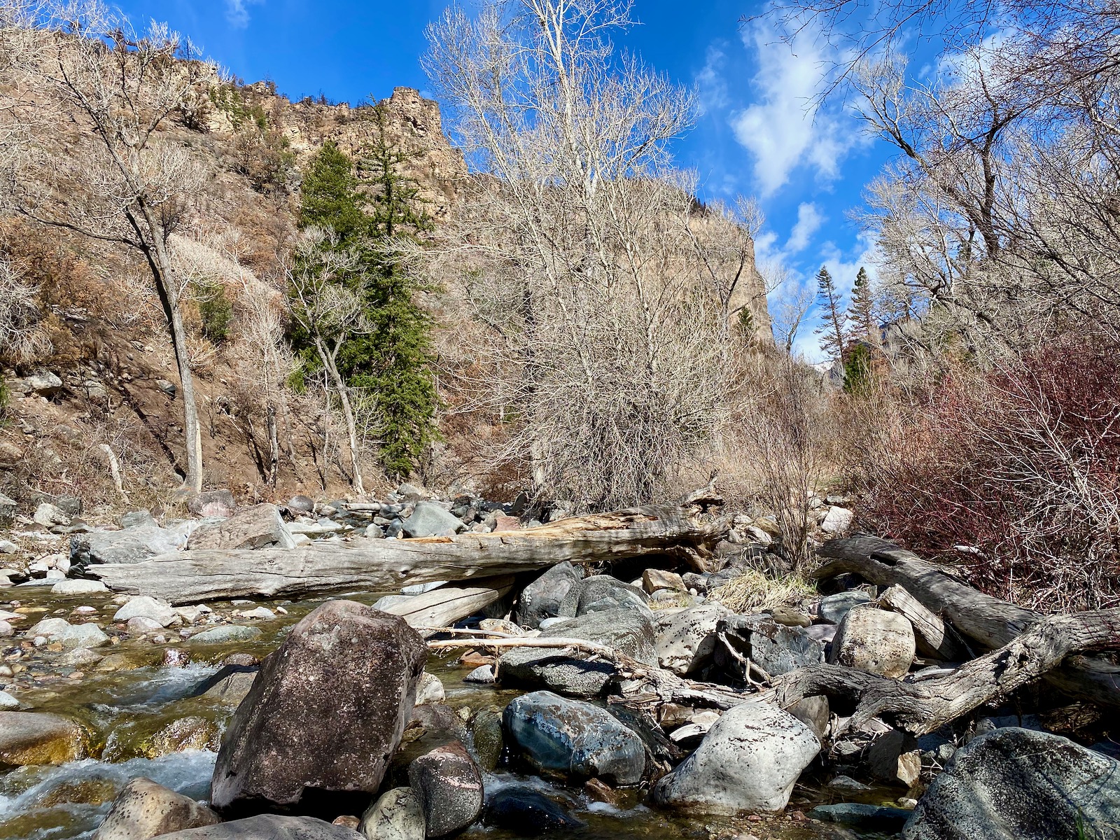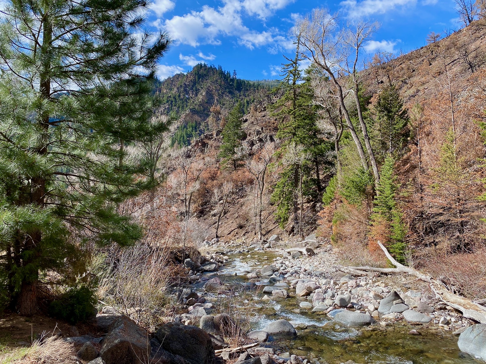 The rocky creek bed is a complicated conglomeration of boulders, snags and whitewater, revealing an array of sights, sounds and textures. A far away mesa dominates the view but its full profile is partially obscured by the imposing evergreens that tower above the pathway.