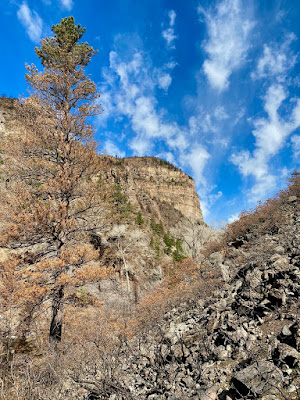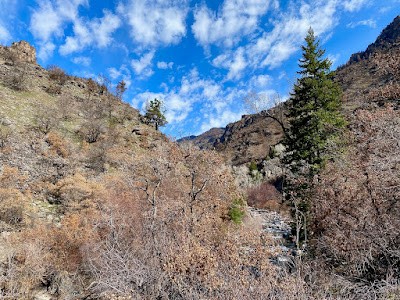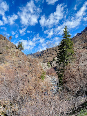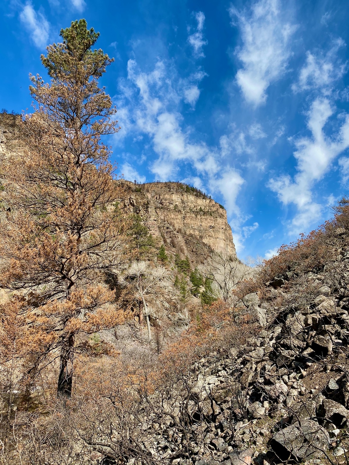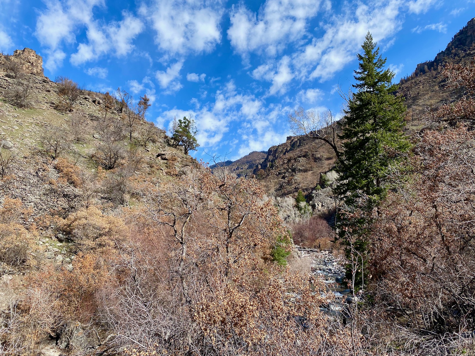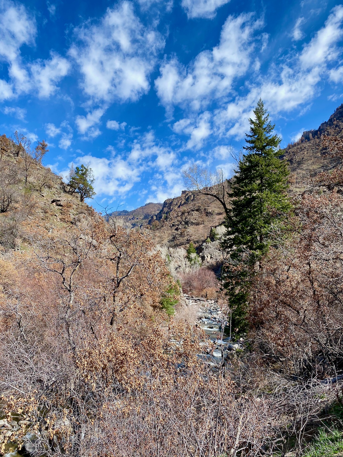The rocky creek bed is a complicated conglomeration of boulders, snags and whitewater, revealing an array of sights, sounds and textures. A far away mesa dominates the view but its full profile is partially obscured by the imposing evergreens that tower above the pathway.