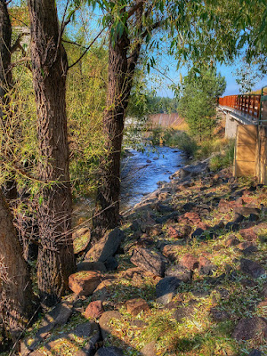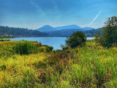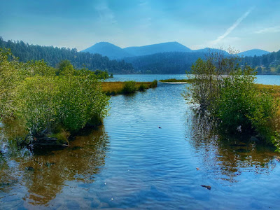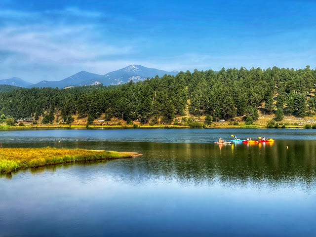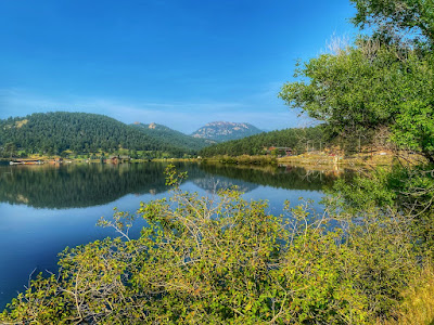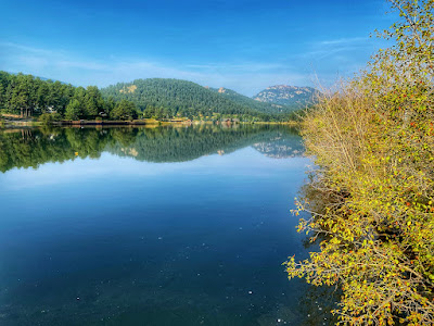 Tracing the irregular contour of a scenic watershed, Evergreen Lake Trail is a looping artery centered in the heart of the foothills. On a hazy, autumn morning the water’s smooth surface faithfully reflects an unusually emerald-colored sky.