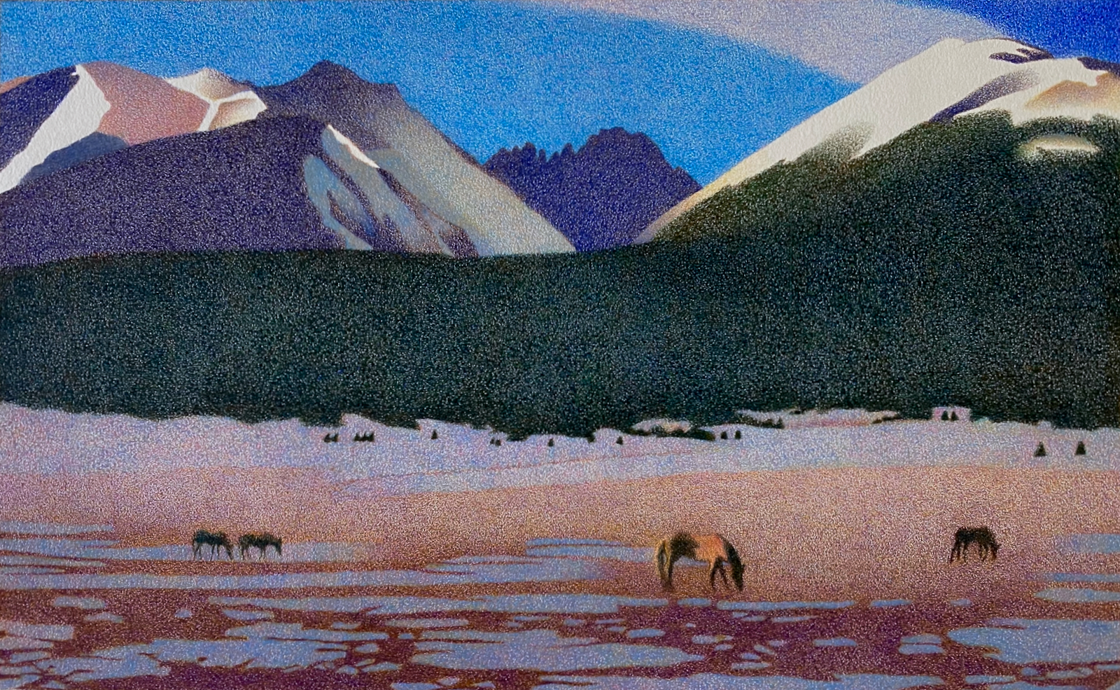 As above, so below, where the sky’s serenity is reflected by the vast expanse of violet pastureland. A few horses graze on the short-grass stubble, evoking a feeling of pure contentment.