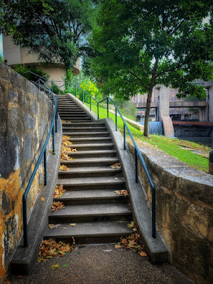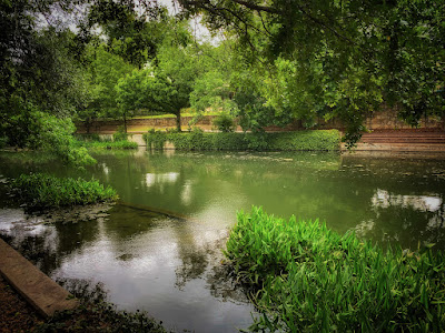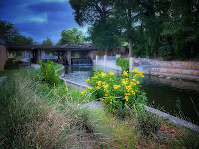 Steamy mornings on the path are bathed in hazy light and the creek, reflecting the surrounding foliage, is colored green. As the day warms up, the search for shade begins so the buildings’ shadows become comfortable breezeways.