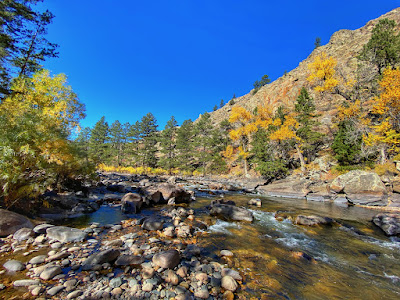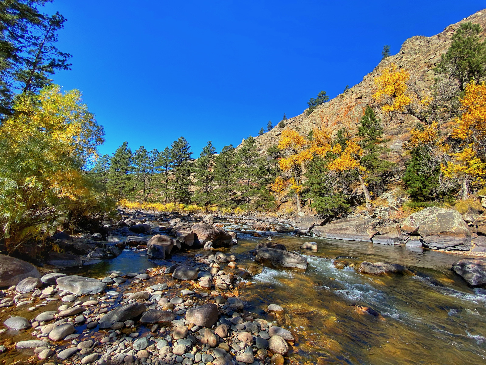 At its most shallow in the autumn, the Poudre River reveals the multitude of rocks and debris normally submerged below the surface. The lazy current and quiet solitude evoke a peaceful atmosphere of extreme tranquility.