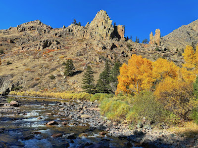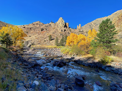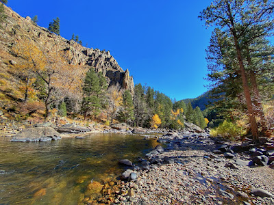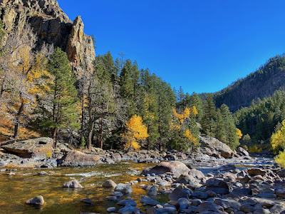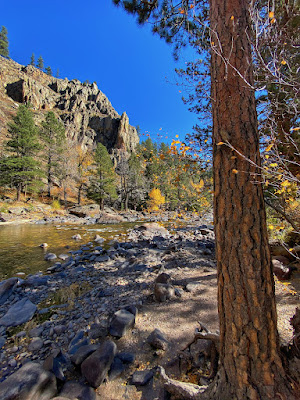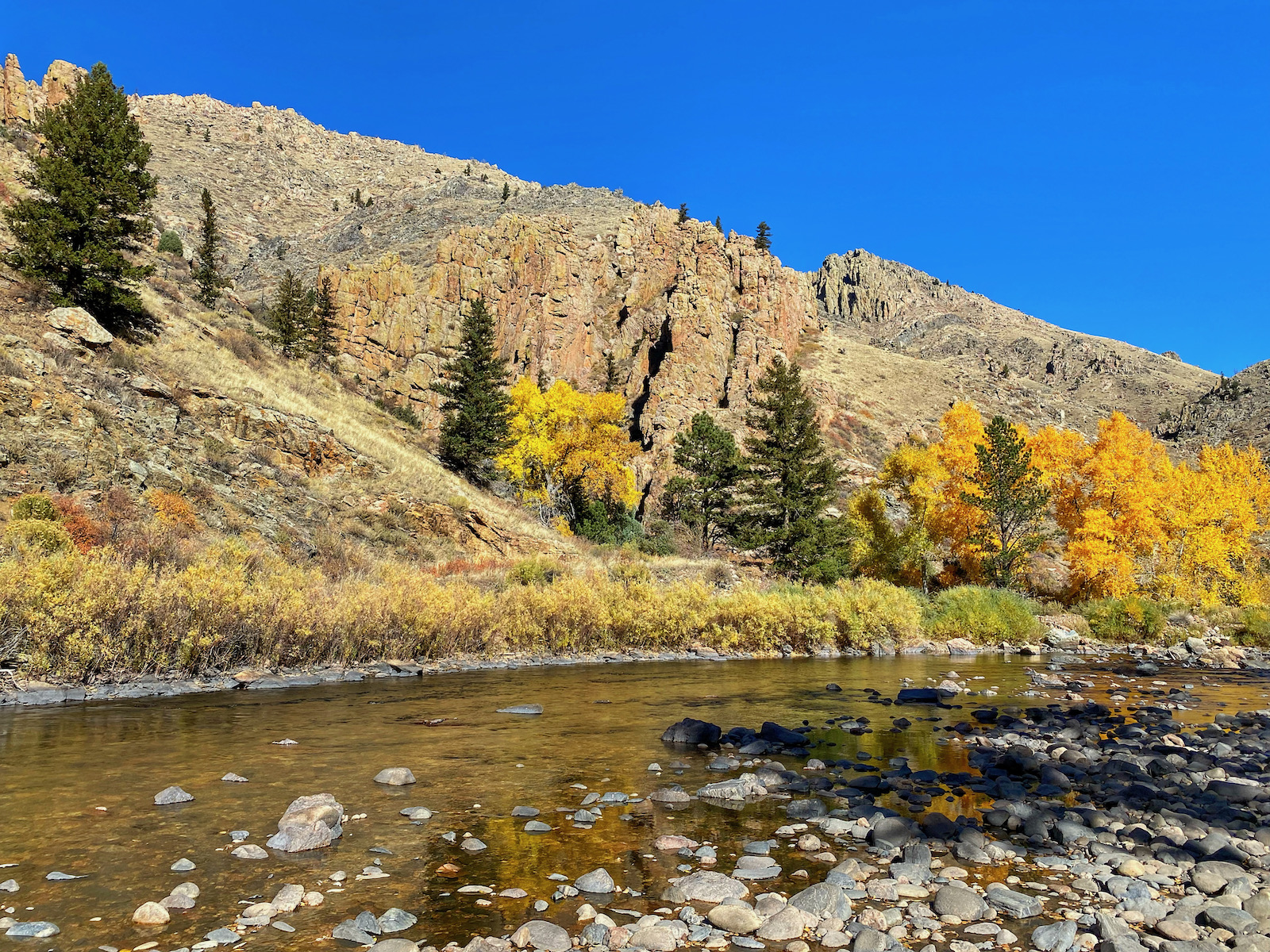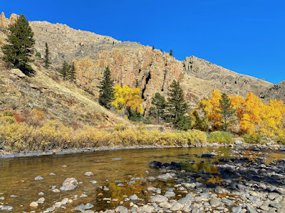 Sinewy cottonwoods fringe the banks and the golden foliage, flickering in the morning sunlight, is even more brilliant when set against the cobalt sky. The trees cast transparent shadows that sneak passively across the coarse terrain.