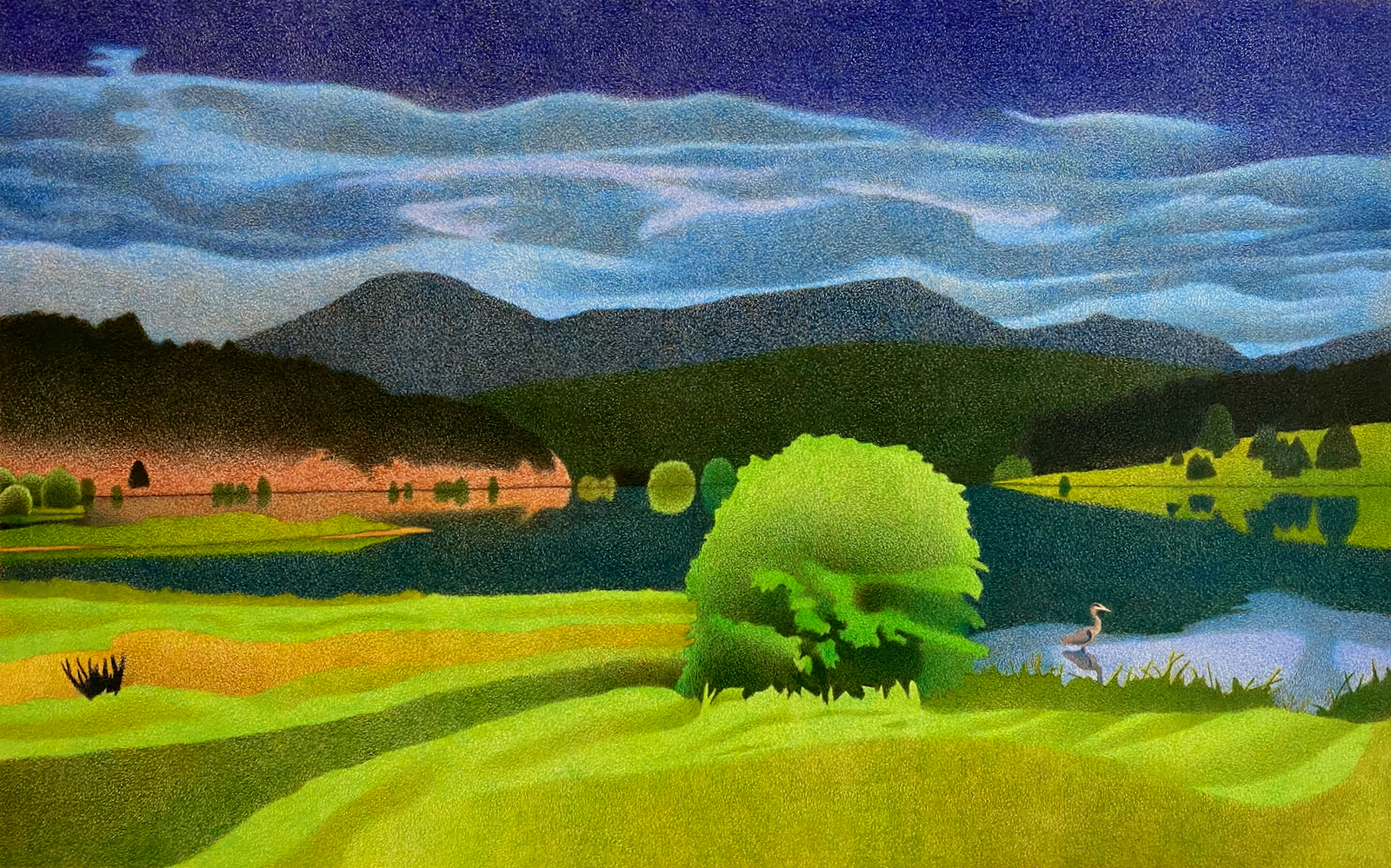 The meadow, lake, mountains, forest and sky are described similarly so as to unify these elements into a coherent whole. The shared color and soft shading transcends the harsh reality into a more pleasing aesthetic.