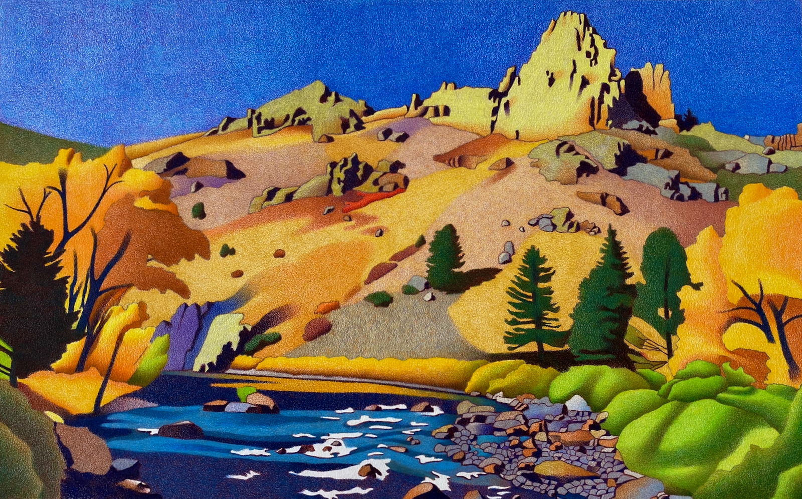 Sturdy stands of yellow cottonwood brace both sides of the composition as patches of gray-green define their leafy profile. A line of bushes arcs into the middle ground, graduating in size, shape and color where its termination is reflected on the creek’s surface.